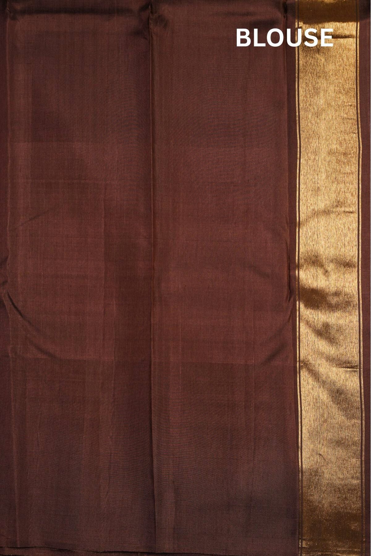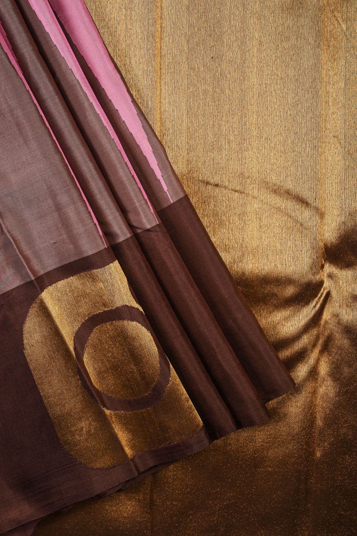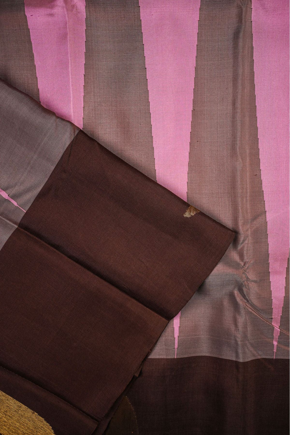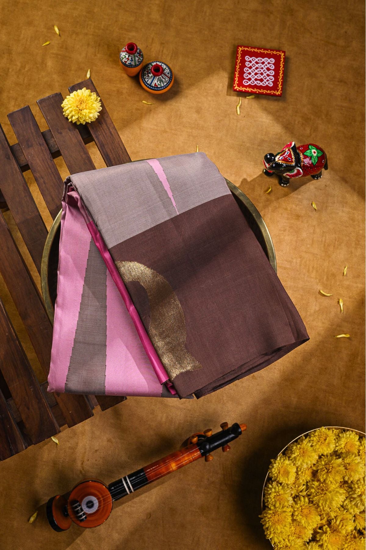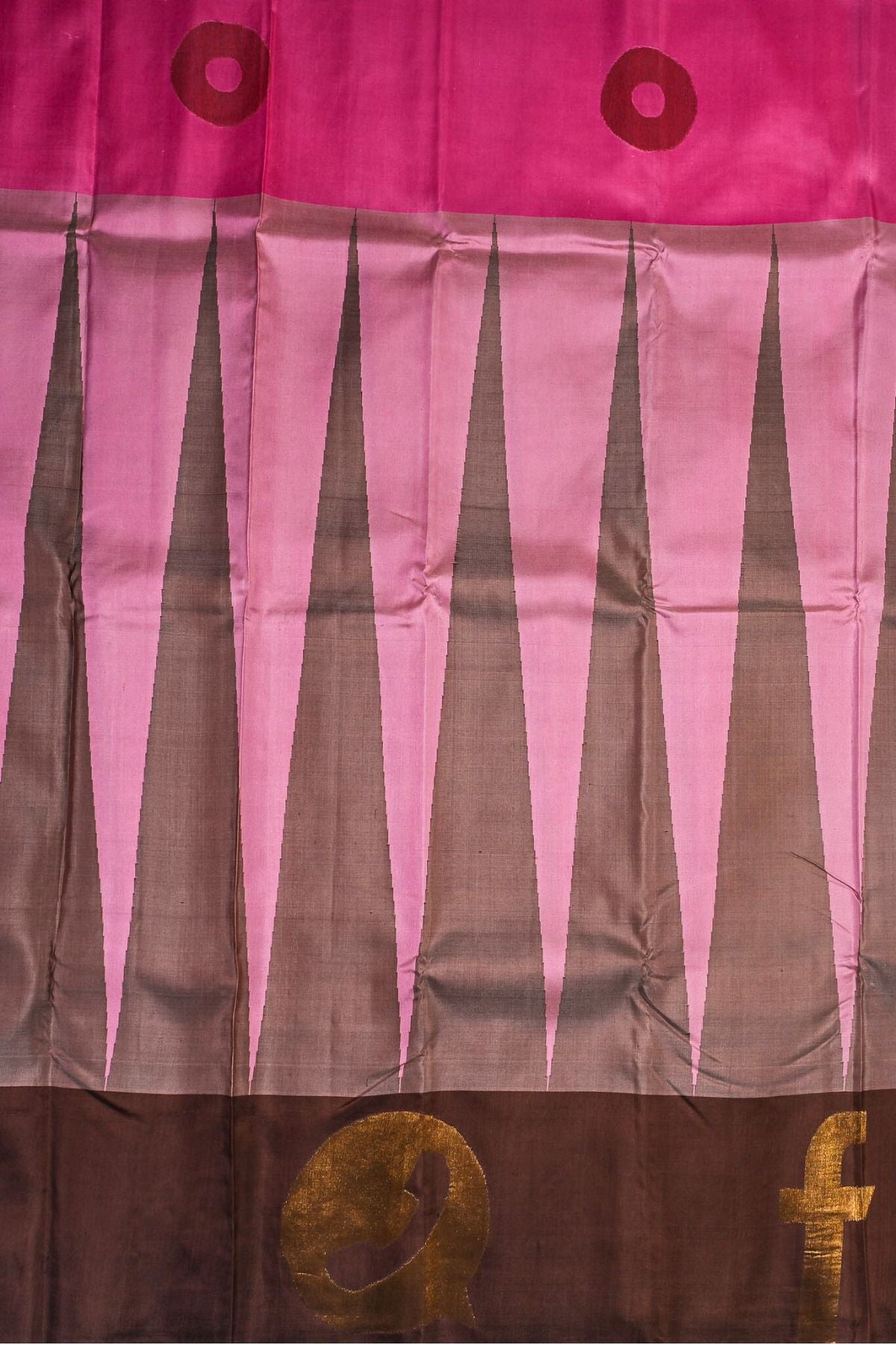 Previous NextGen Z coded Kanchipuram saree with a trendy mix of pink, and dusty rose portraying trendy icons as border bhuttas. The saree comes with a brown blouse with golden zari.