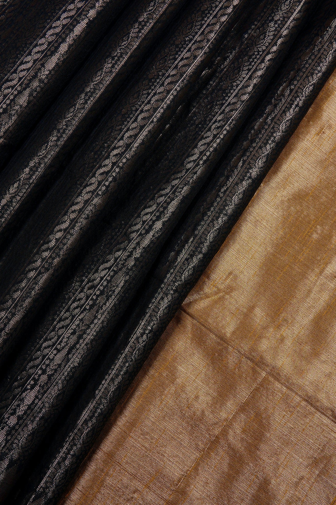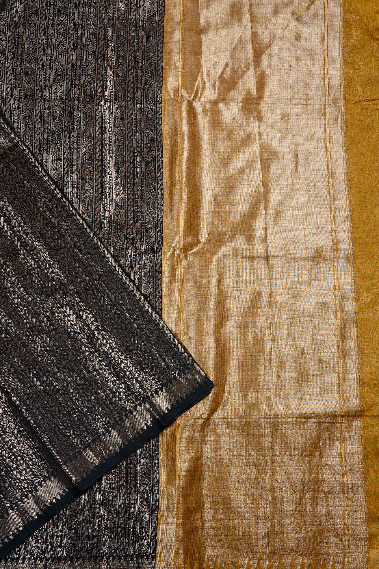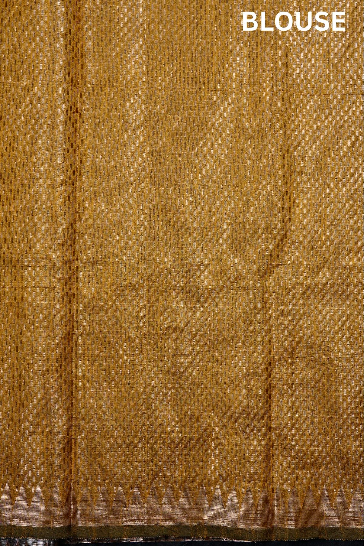 A black semi tussar saree featuring a sophisticated body covered in dense, vertical columns of intricate silver zari geometric and floral patterns. The border is defined by a clean silver band accented with a sharp diamond patterns. The pallu transitions into a solid, shimmering expanse of brilliant gold zari on mustard gold. Completing the ensemble is a coordinated mustard gold blouse adorned with a fine, all-over silver weave and a matching border woven in zari.A black semi tussar saree featuring a sophisticated body covered in dense, vertical columns of intricate silver zari geometric and floral patterns. The border is defined by a clean silver band accented with a sharp diamond patterns. The pallu transitions into a solid, shimmering expanse of brilliant gold zari on gold ochre. Completing the ensemble is a coordinated mustard gold blouse adorned with a fine, all-over silver weave and a matching border woven in zari.