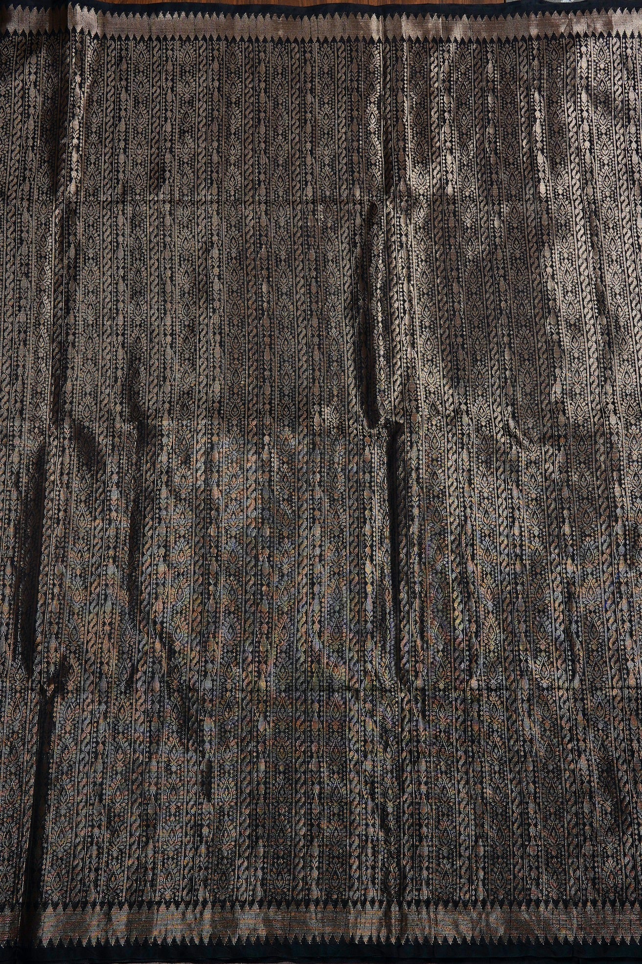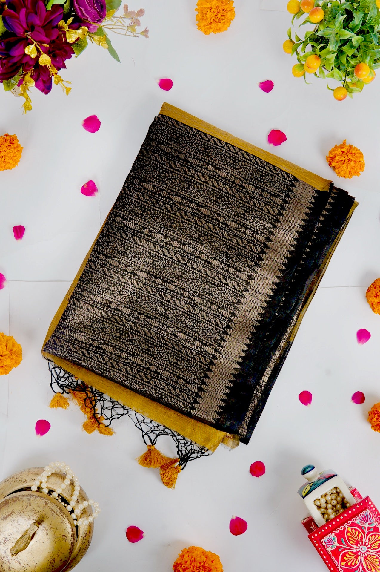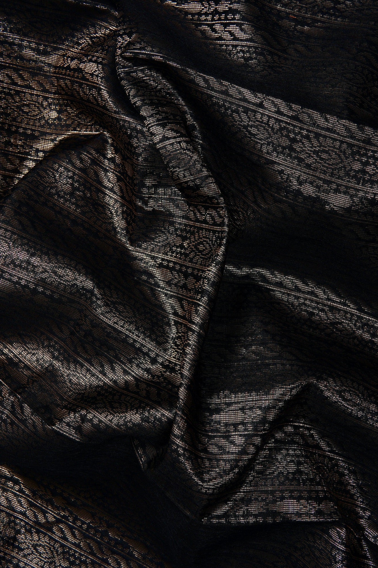 A black semi tussar saree featuring a sophisticated body covered in dense, vertical columns of intricate silver zari geometric and floral patterns. The border is defined by a clean silver band accented with a sharp diamond patterns. The pallu transitions into a solid, shimmering expanse of brilliant gold zari on mustard gold. Completing the ensemble is a coordinated mustard gold blouse adorned with a fine, all-over silver weave and a matching border woven in zari.A black semi tussar saree featuring a sophisticated body covered in dense, vertical columns of intricate silver zari geometric and floral patterns. The border is defined by a clean silver band accented with a sharp diamond patterns. The pallu transitions into a solid, shimmering expanse of brilliant gold zari on gold ochre. Completing the ensemble is a coordinated mustard gold blouse adorned with a fine, all-over silver weave and a matching border woven in zari.
