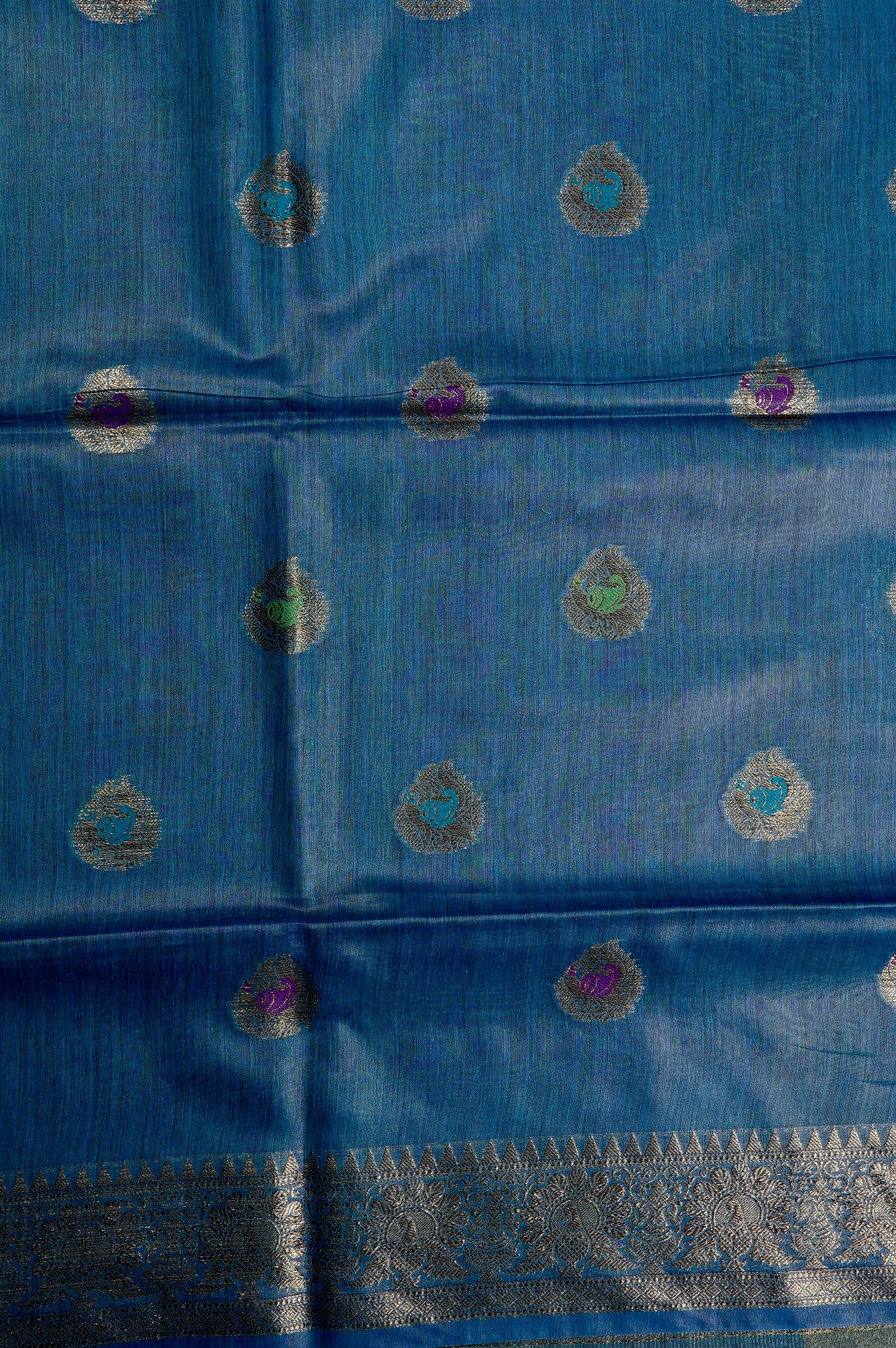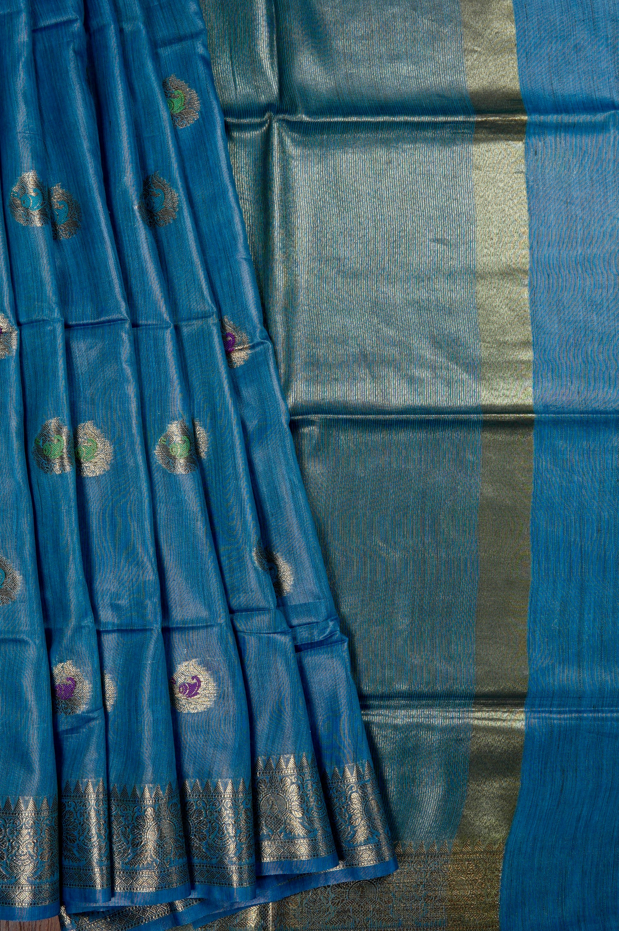 Chathams blue semi jute saree with small petal motifs holding smaller bhuttas in purple, green and blue woven throughout the body, resembling a peacock spreading its feathers out. The border is a band of recurring elegant peacock motifs filled with florals vines woven in gold zari. The saree has a vaira oosi pallu with a band of gold zari bordering it vertically.