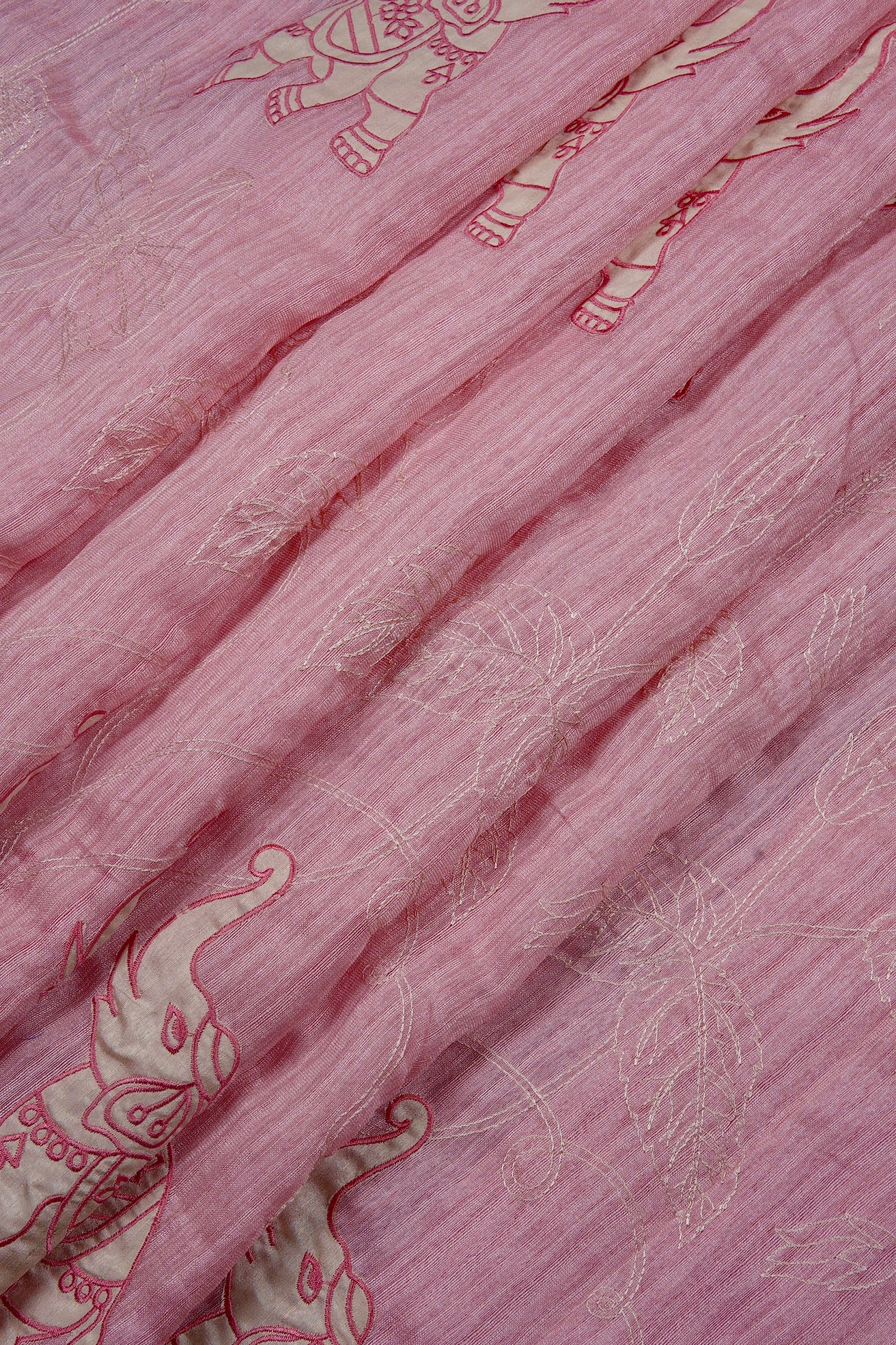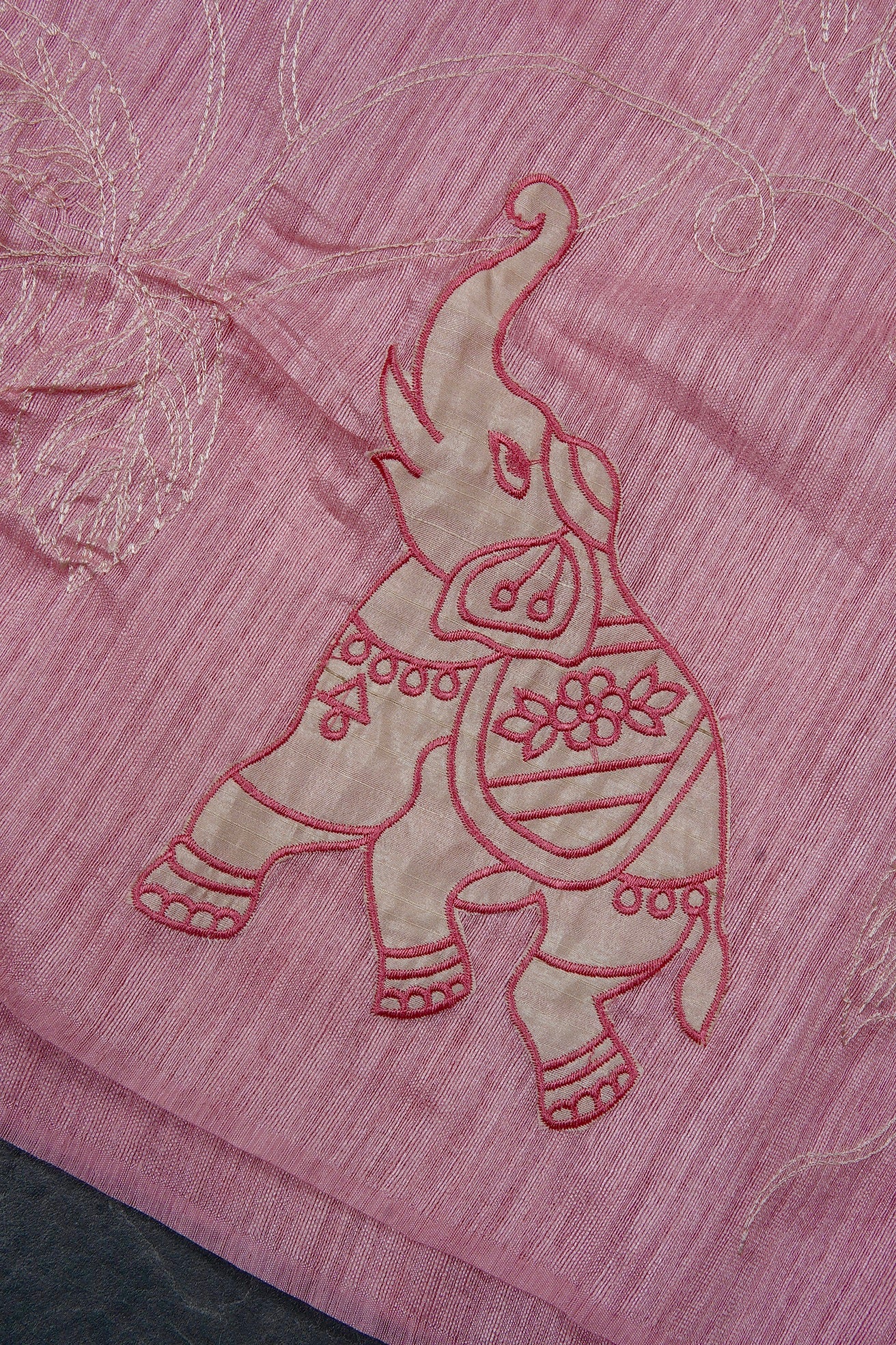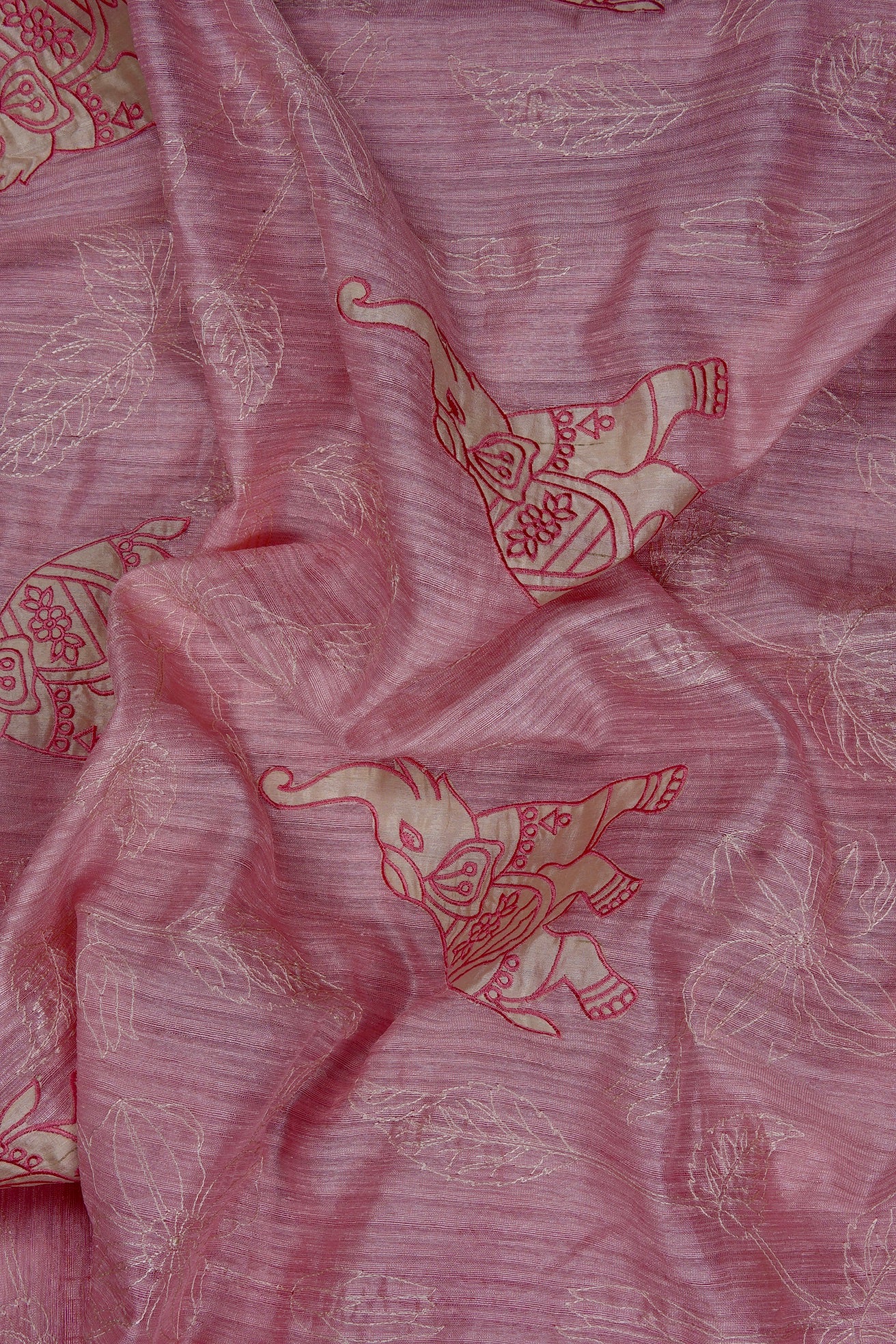 A charming cotton candy pink semi tussar saree featuring a seamless design where the body flows together without a border. The entire drape is adorned with whimsical embroidered elephant motifs in ivory and rose pink, set against a backdrop of delicate, off-white floral vine embroidery. The pallu is a continuation of the body, creating a uniformity in the saree.
