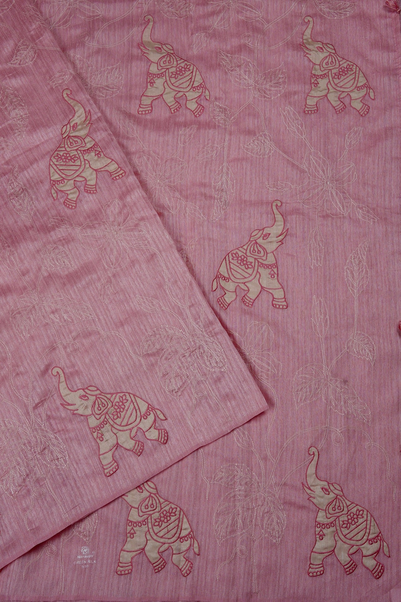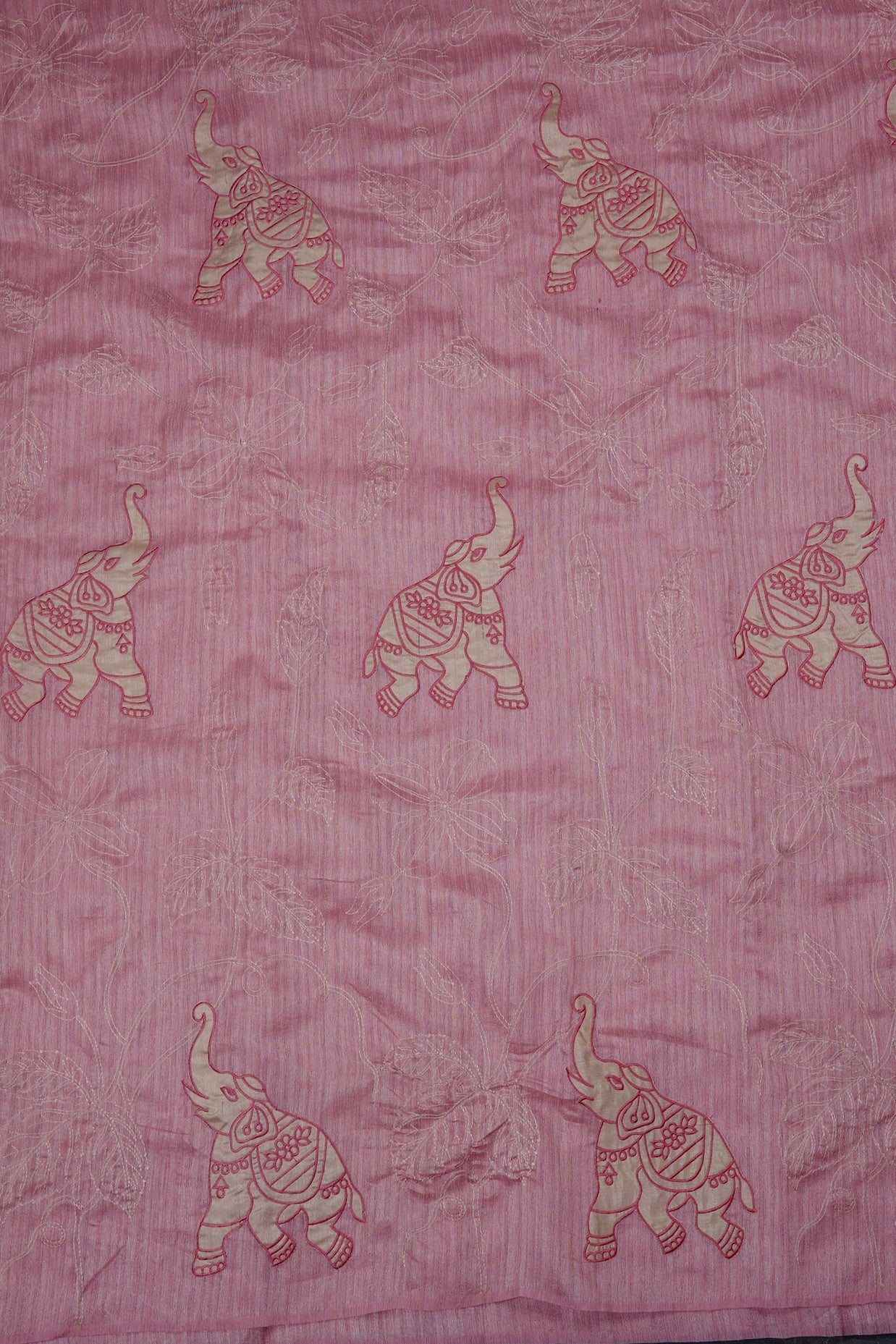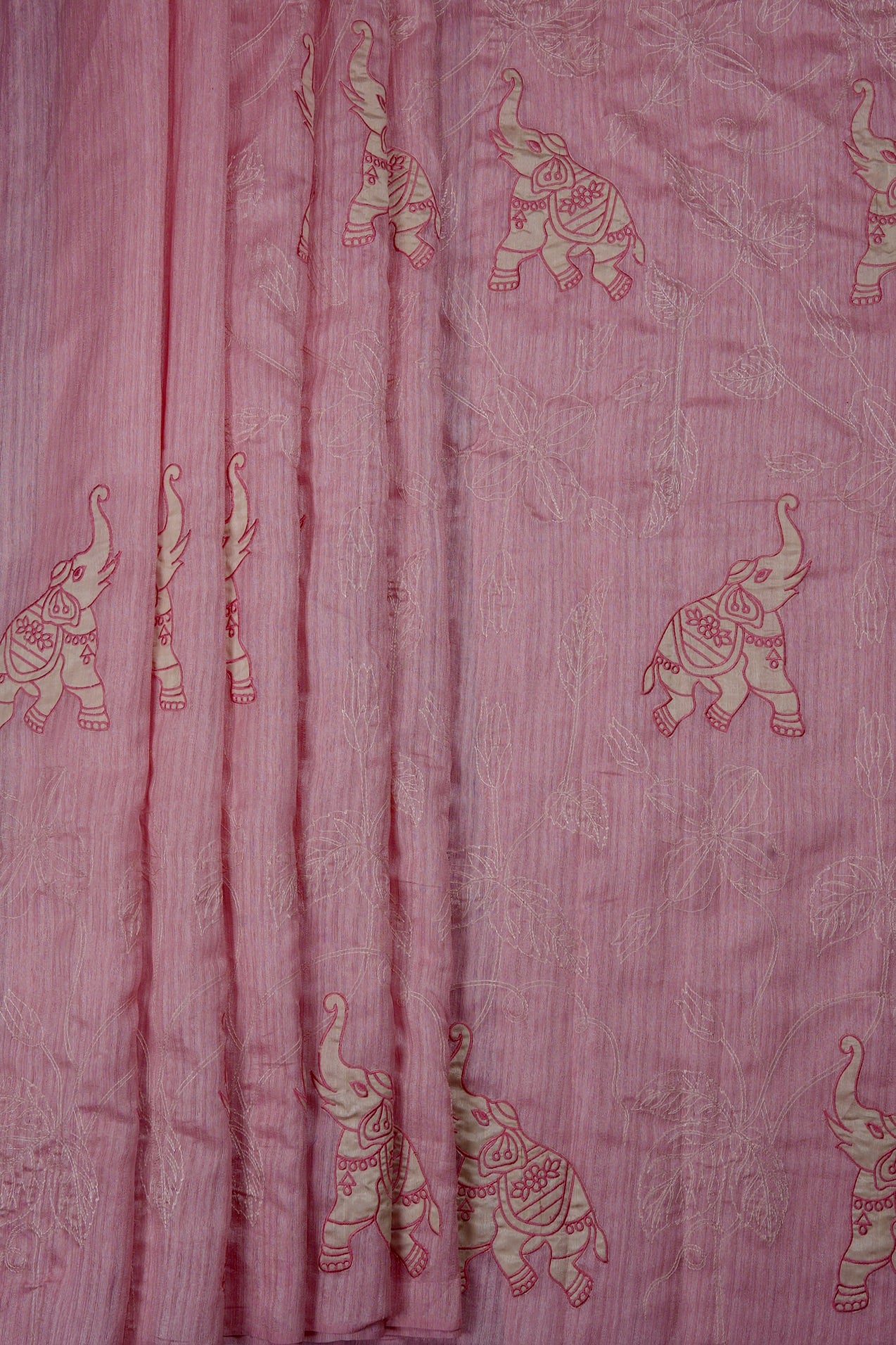 A charming cotton candy pink semi tussar saree featuring a seamless design where the body flows together without a border. The entire drape is adorned with whimsical embroidered elephant motifs in ivory and rose pink, set against a backdrop of delicate, off-white floral vine embroidery. The pallu is a continuation of the body, creating a uniformity in the saree.