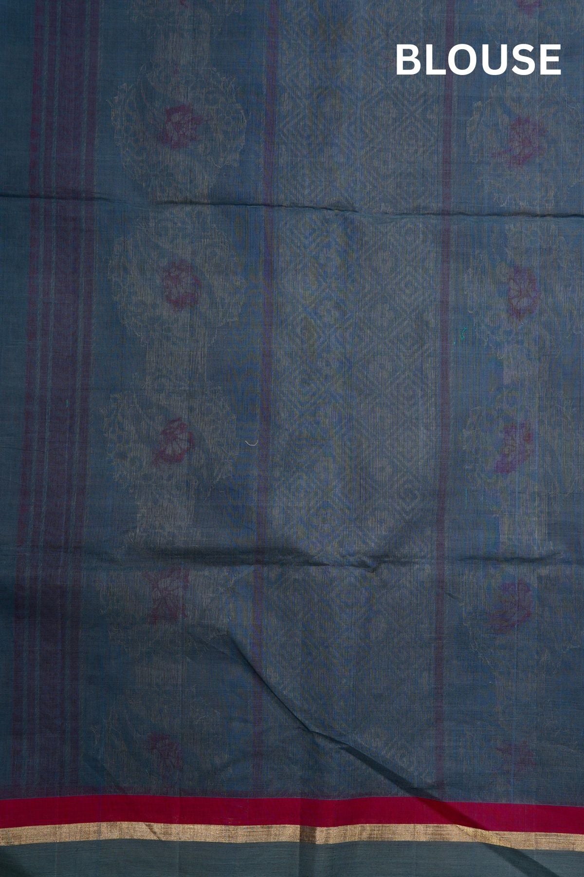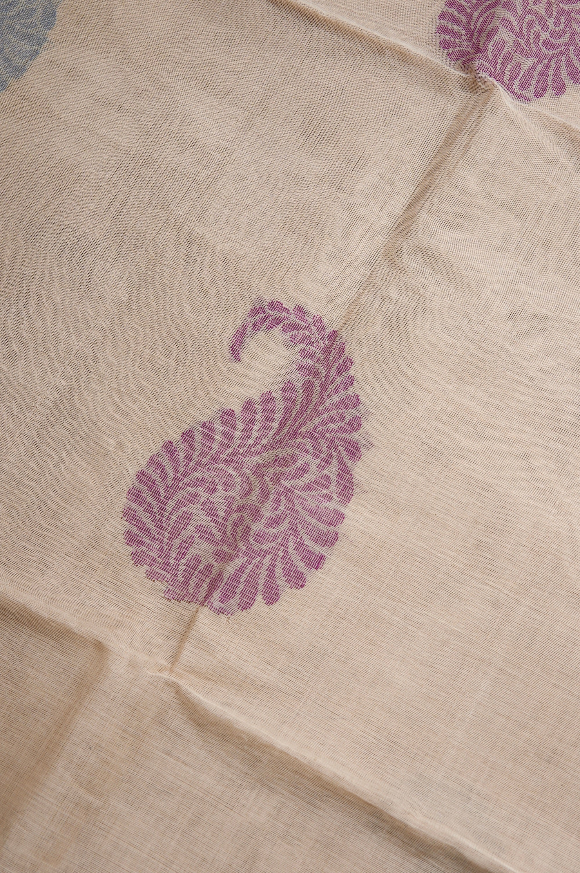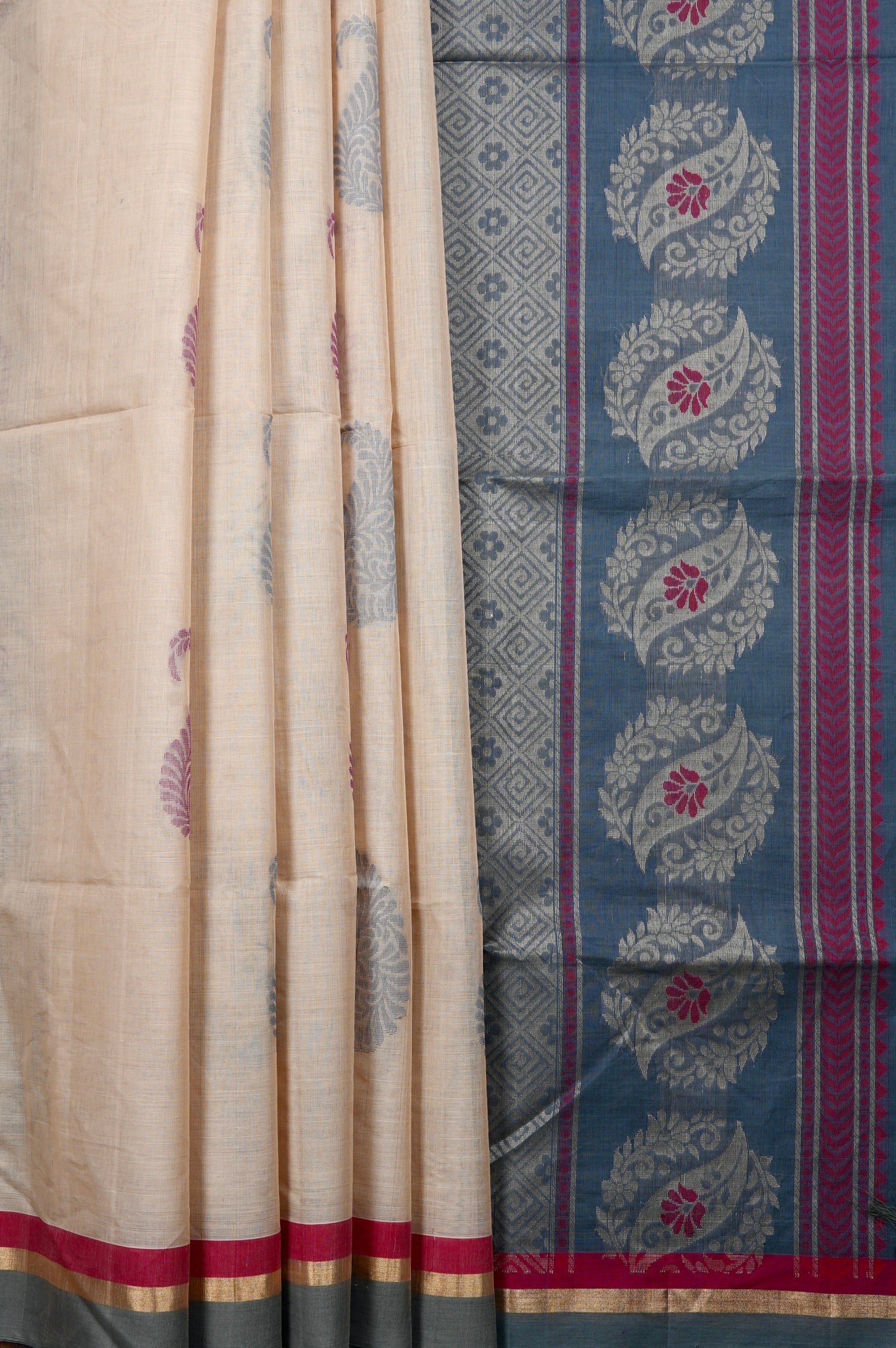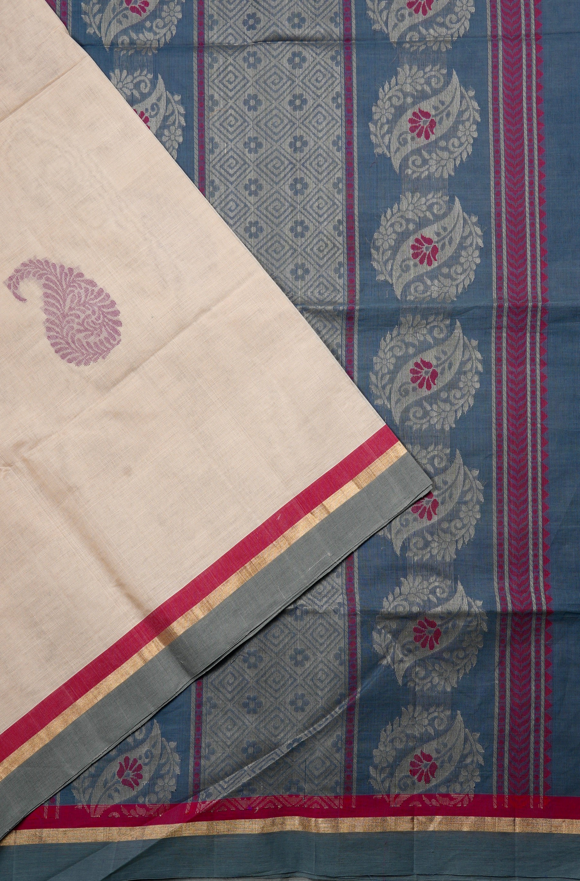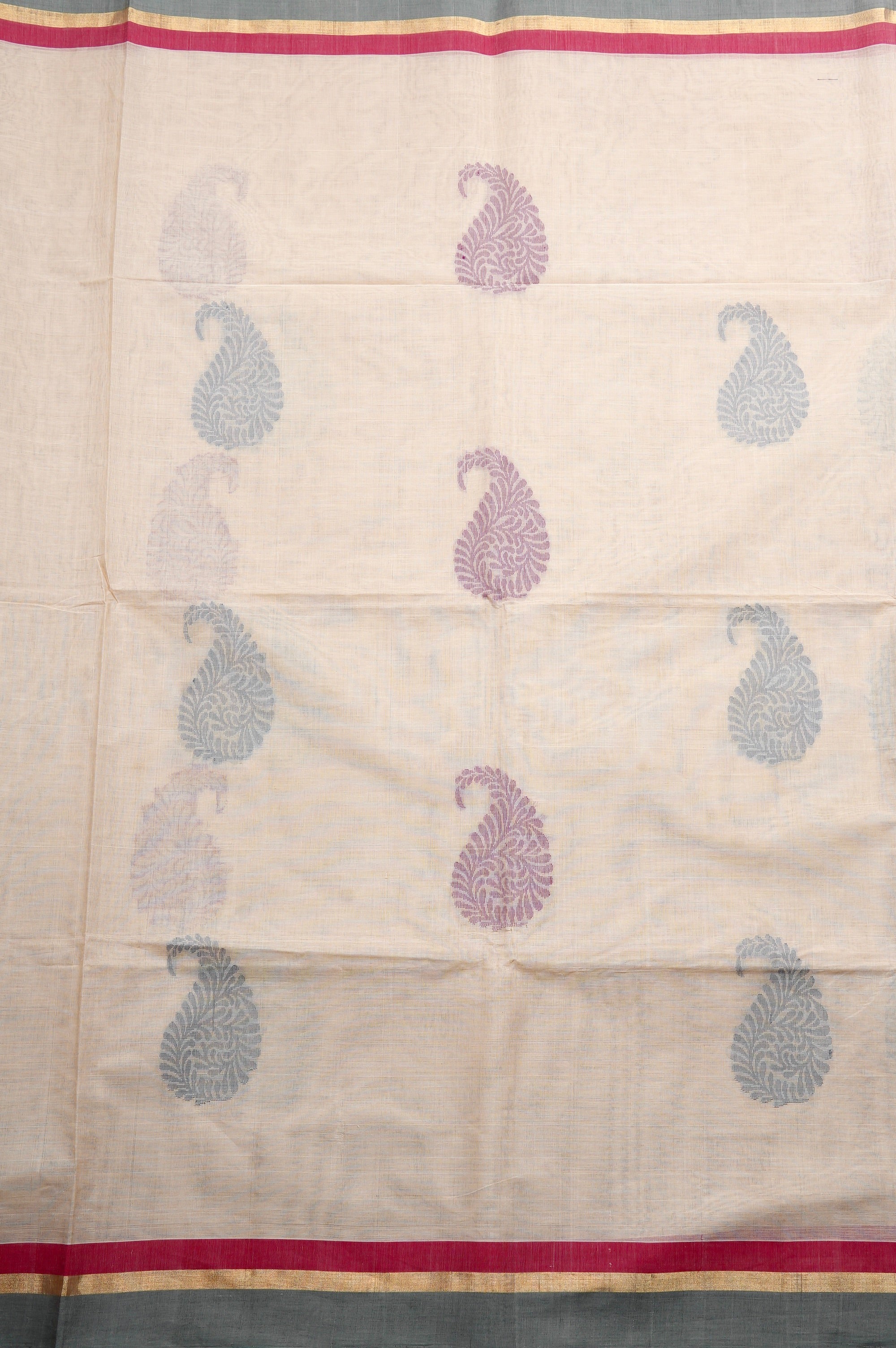 A simple yet elegant cotton saree woven in cream threads, accented with intricate mango bhuttas in red and grey. The body is framed by simple bands of red, gold and grey. The saree flows into a subtle grey pallu, starting off with a diamond grid, followed by a wide band of leafy motifs woven in gold and red.