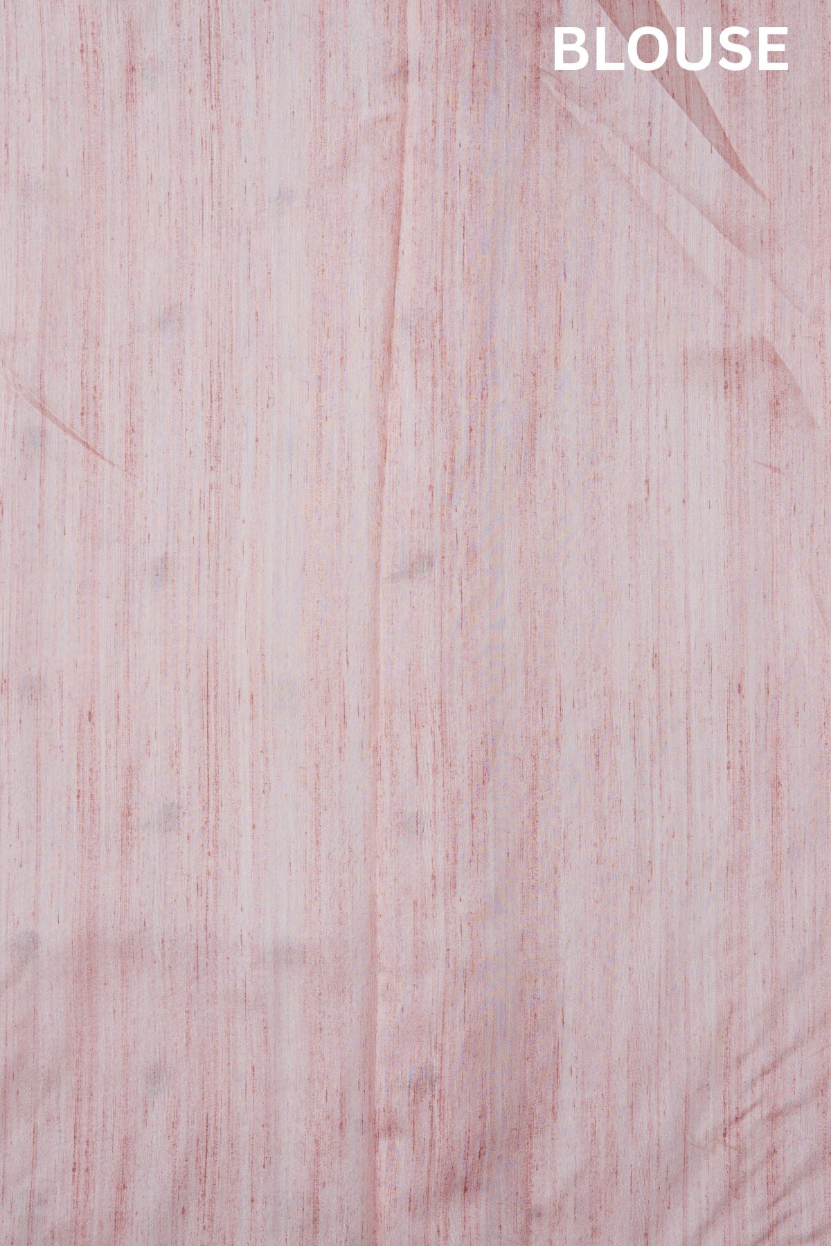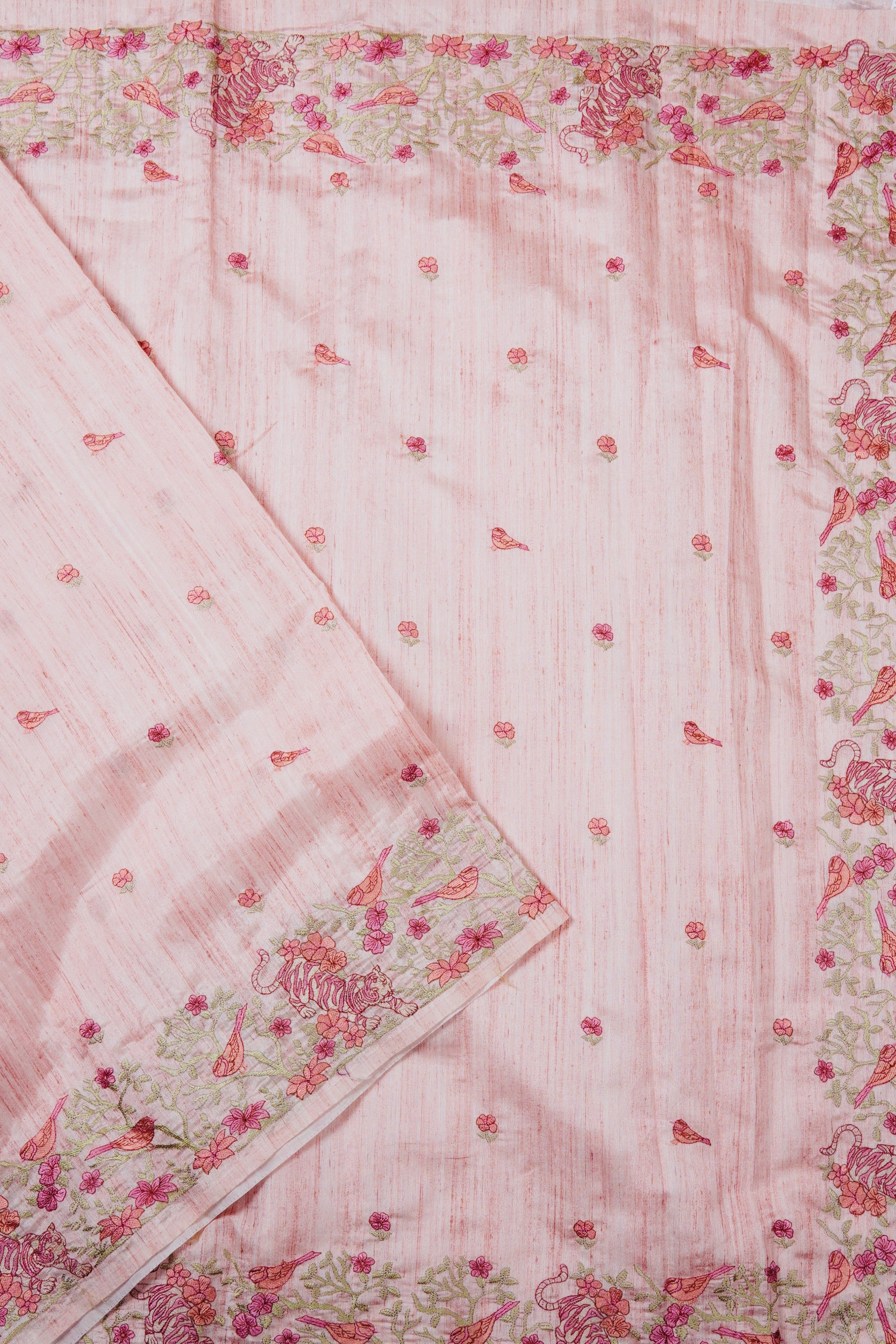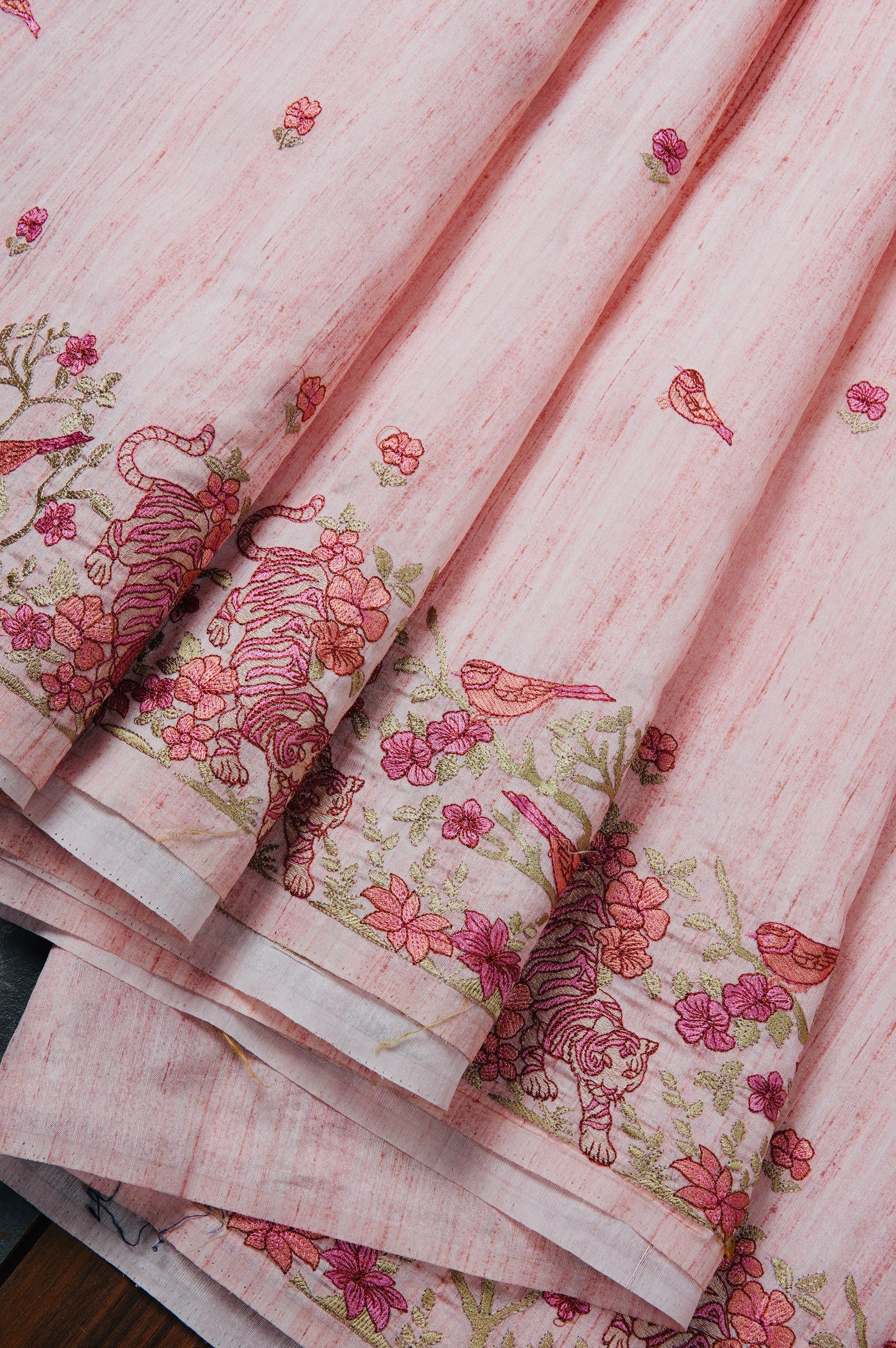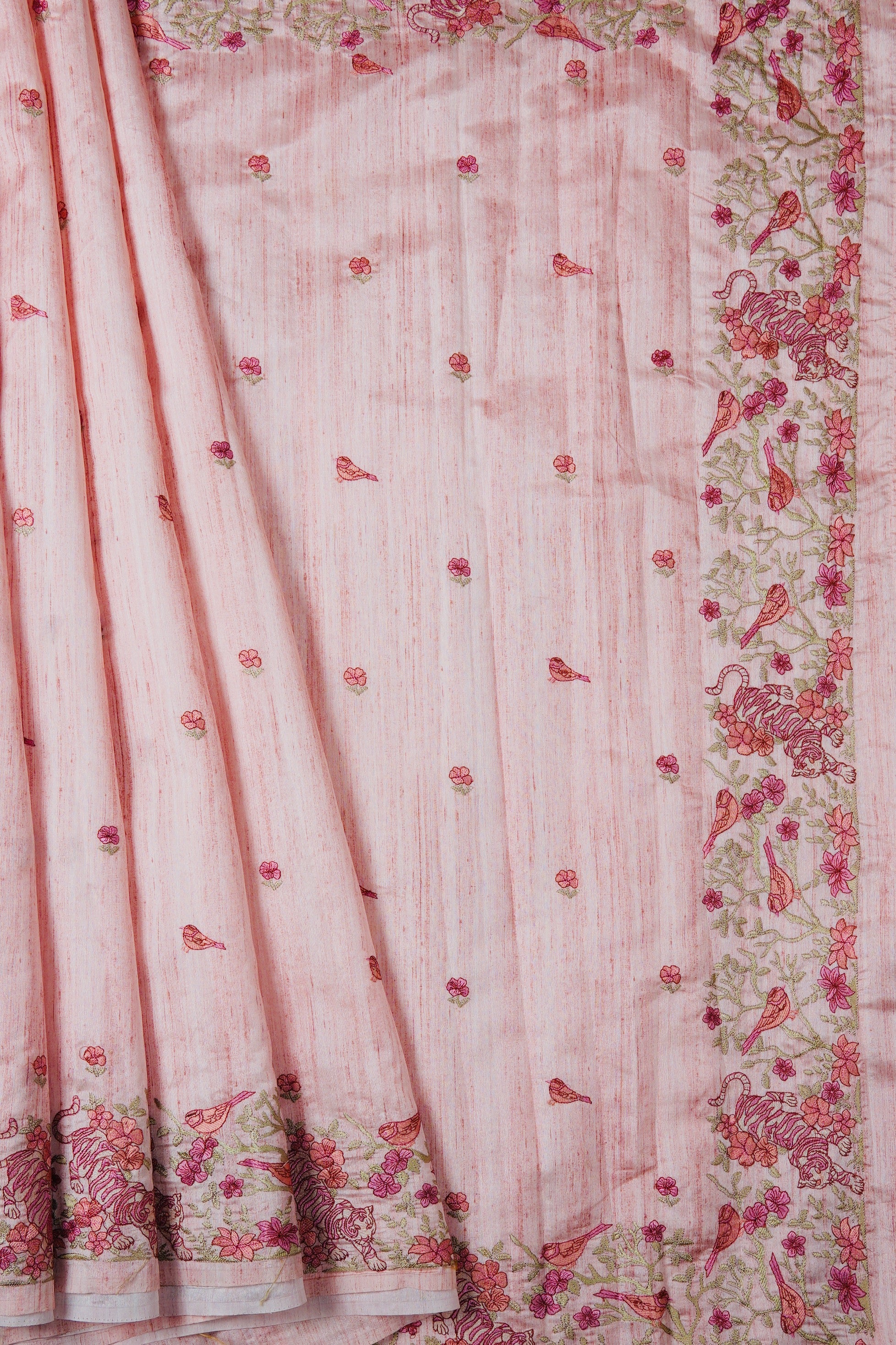 Cream pink semi tussar saree with small flower motifs with leaves woven in pink and green and bird motifs woven in pink throughout the body, extending as the pallu. The border has green trees with pink florals, birds and tiger motifs, extending towards the border of the pallu. The saree has a plain cream pink blouse.