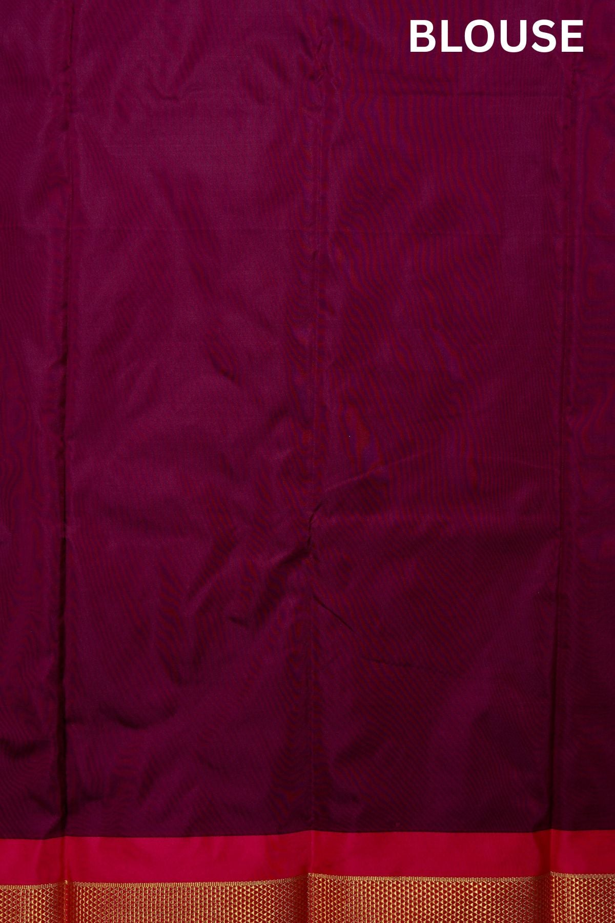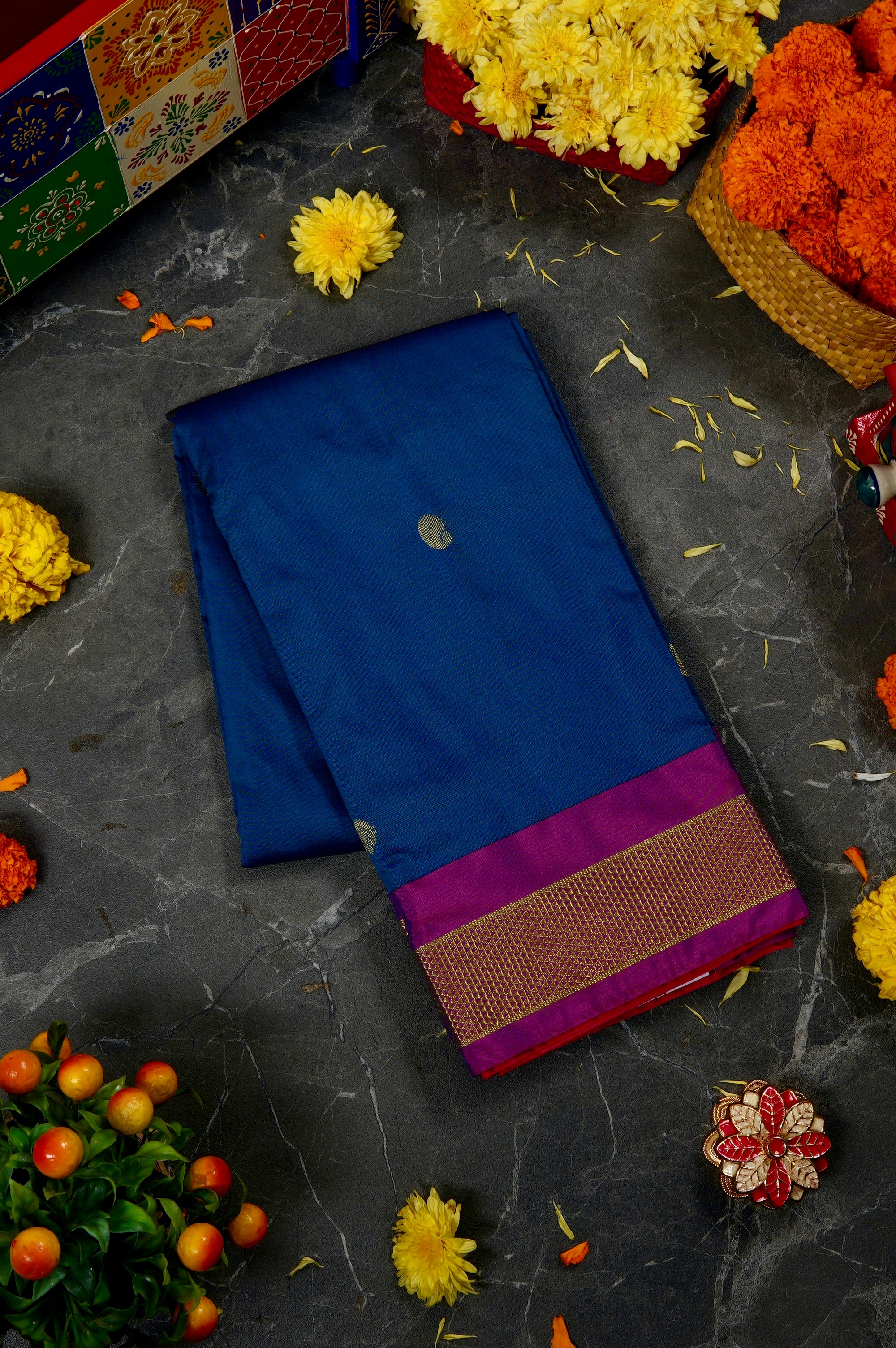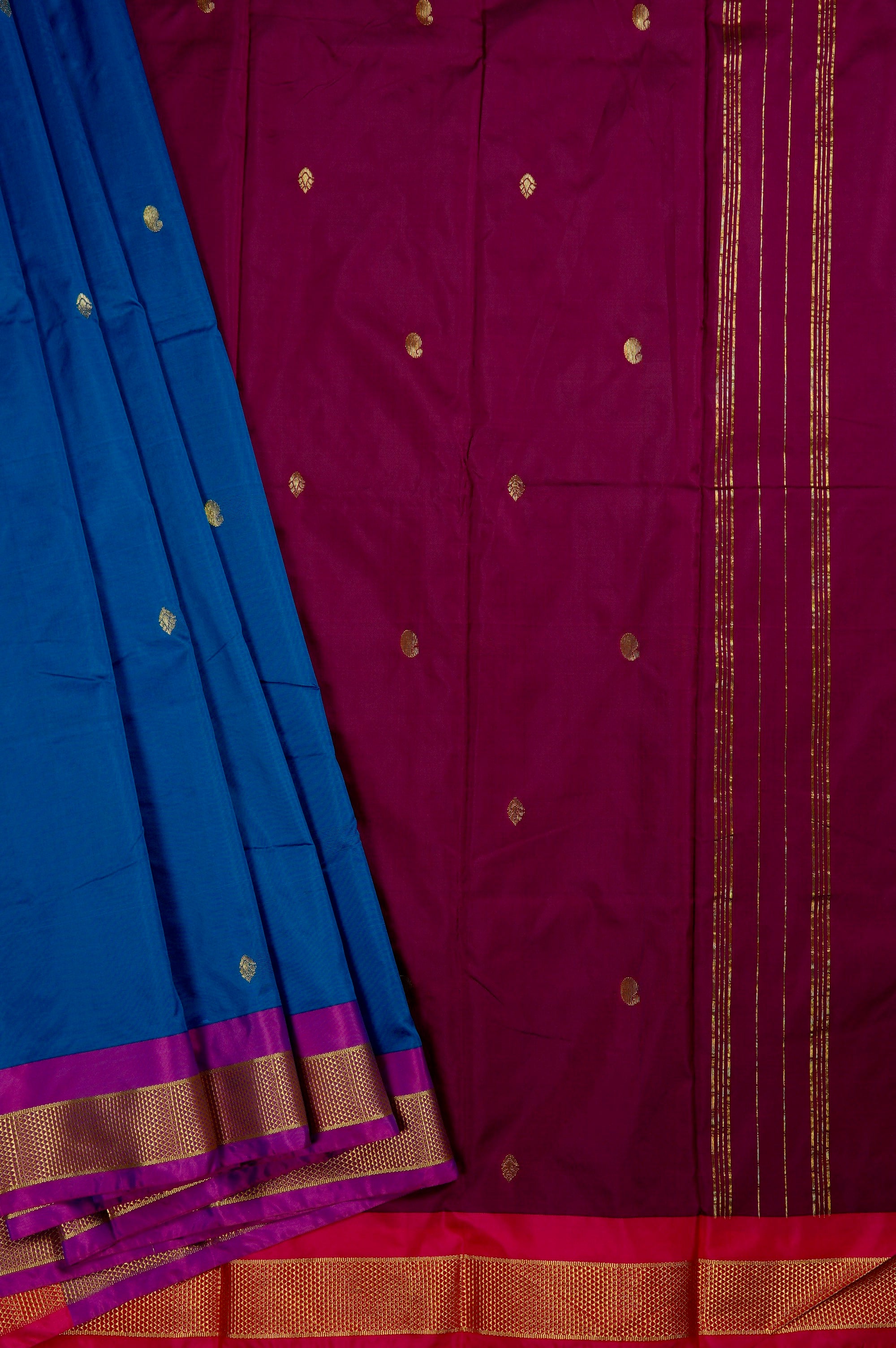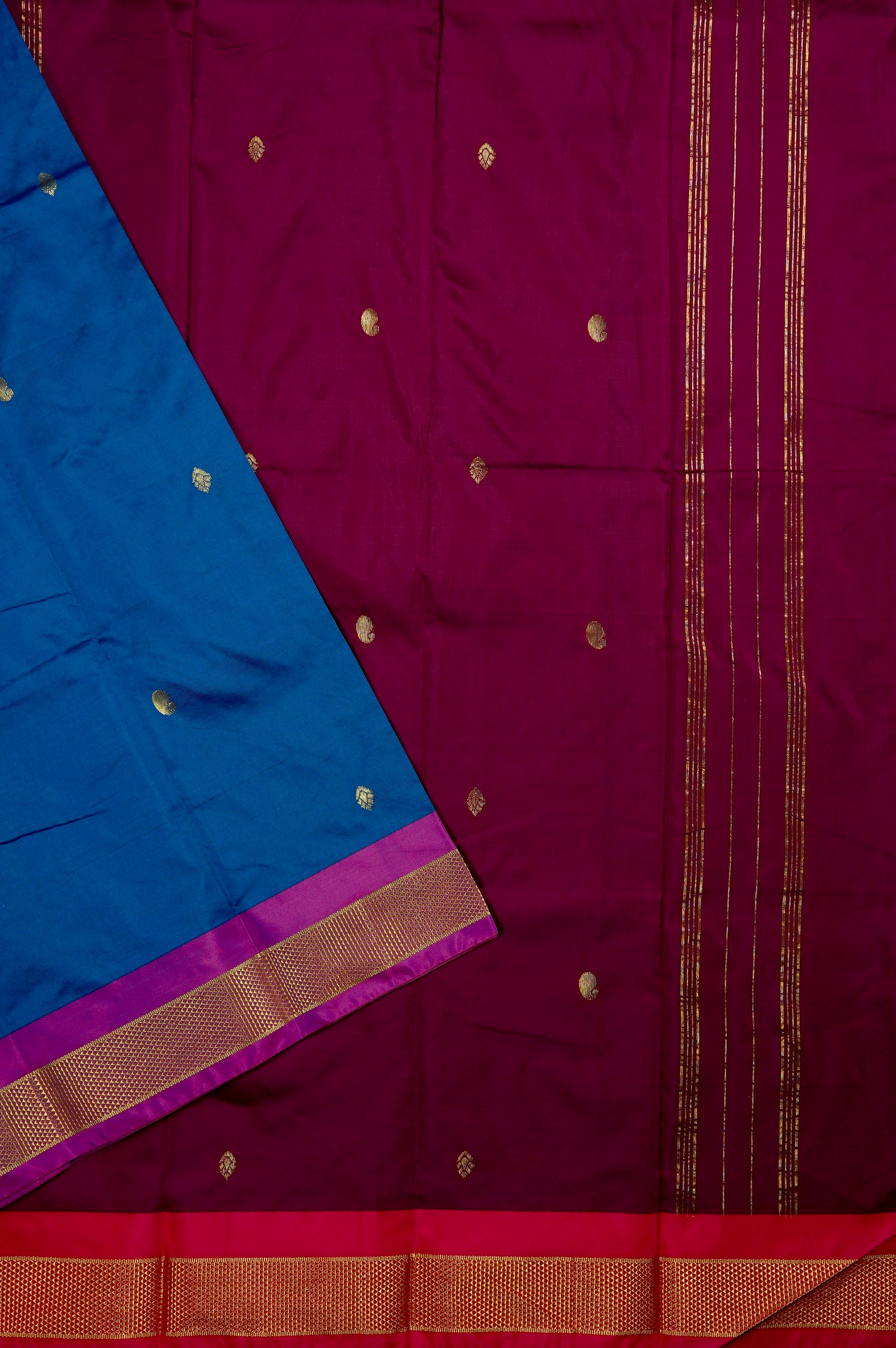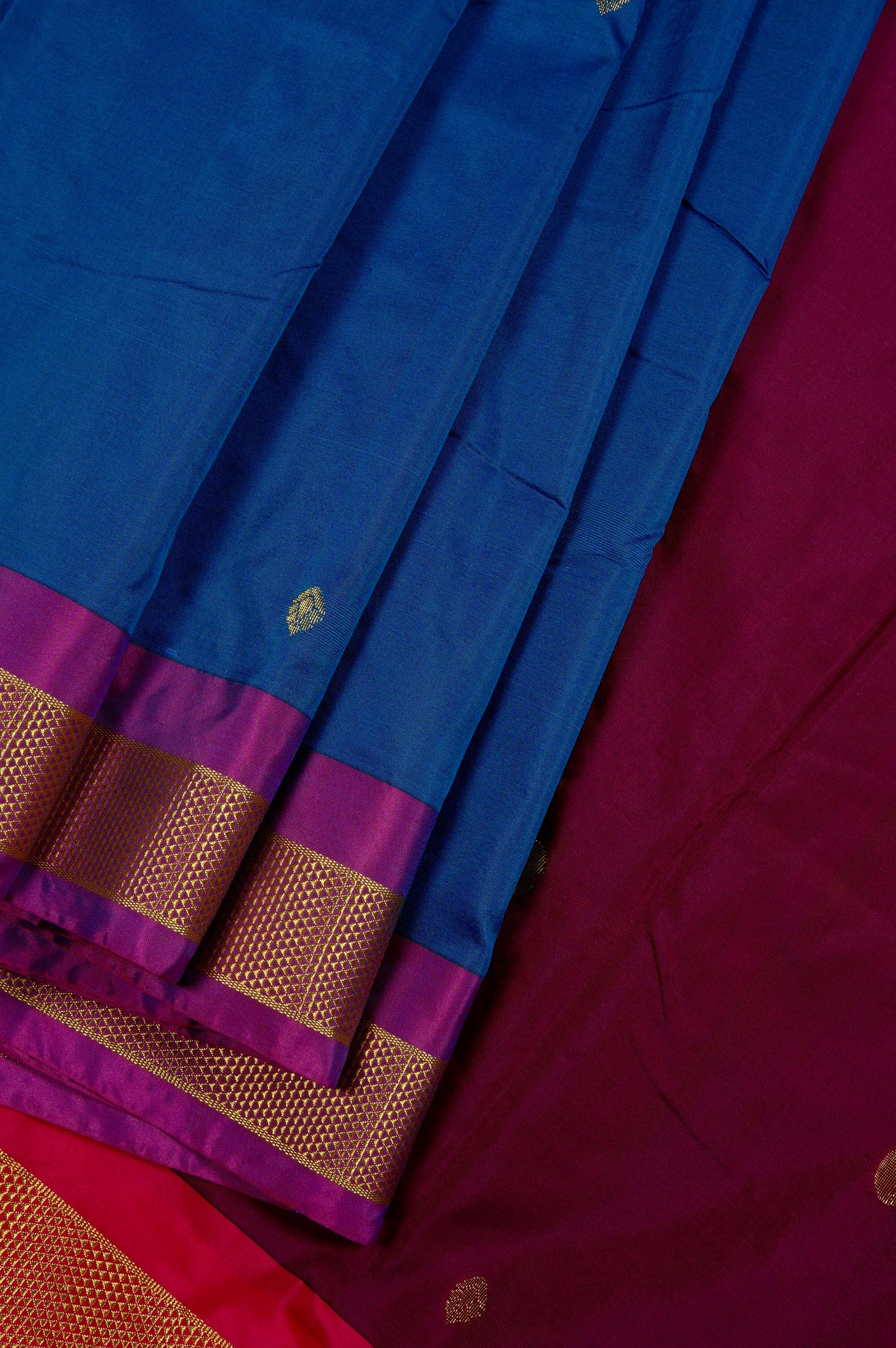 Dark Cerulean art silk saree filled with small inverted thilakam bhuttas and inverted mango bhuttas woven in gold zari throughout the body. The border has a magenta base with a small band of diamond grid woven in gold zari. The pallu has a maroon base with vaira oosi running vertically at the end, filled with the same inverted thilakam and mango bhuttas, with a light red based border continuing the diamond grid band in gold zari. The saree has a maroon blouse with thee same border as the pallu.