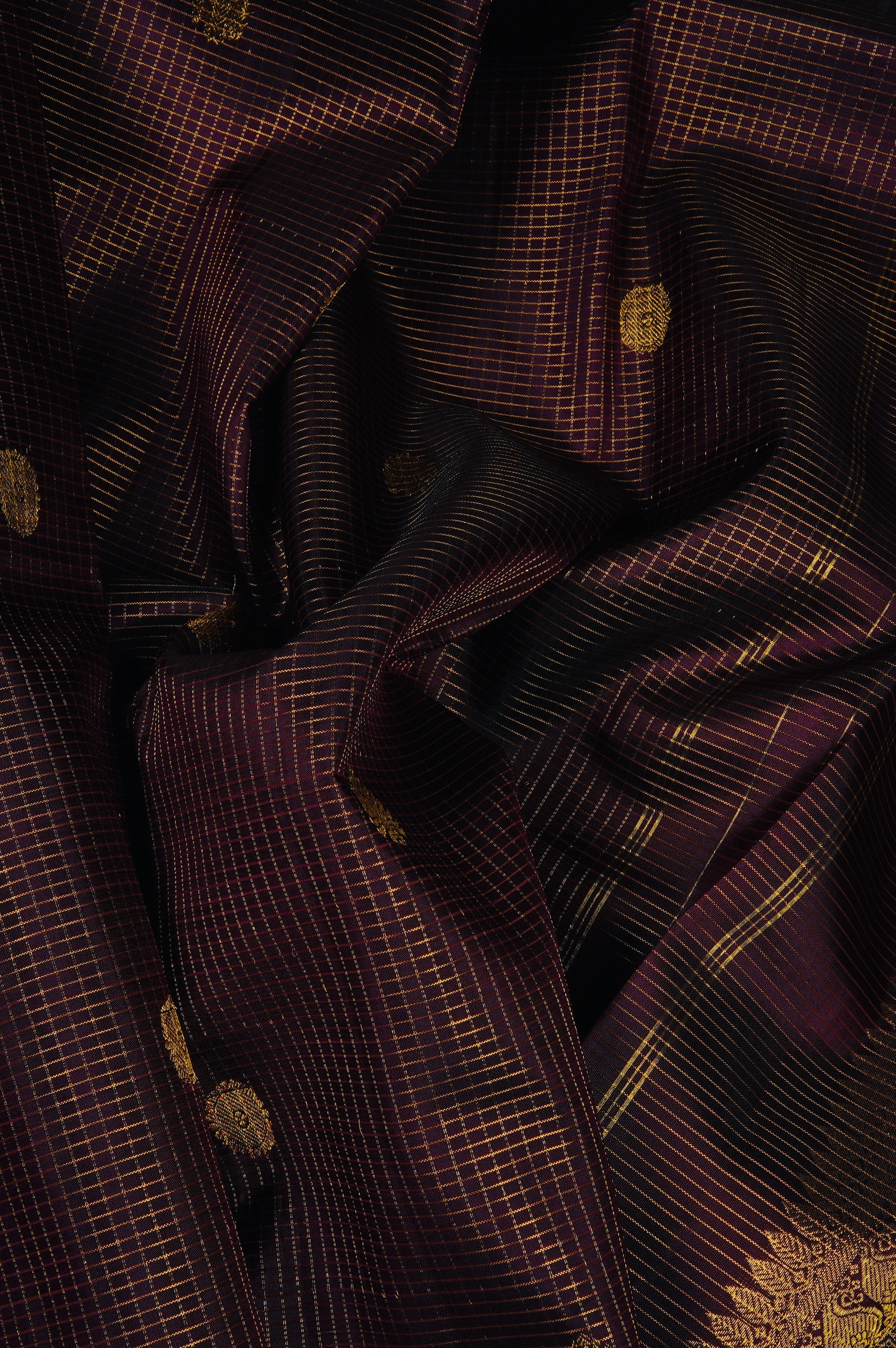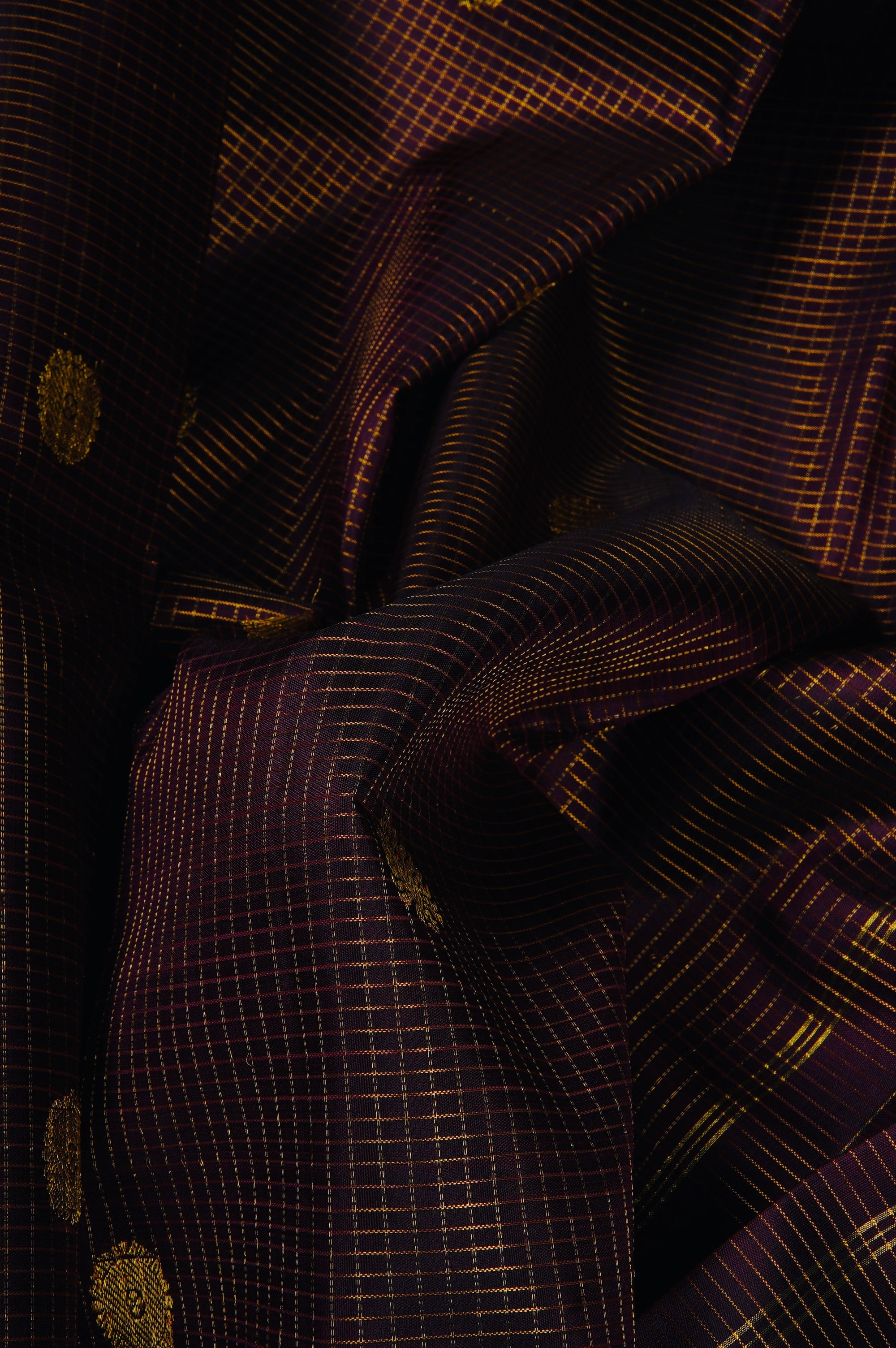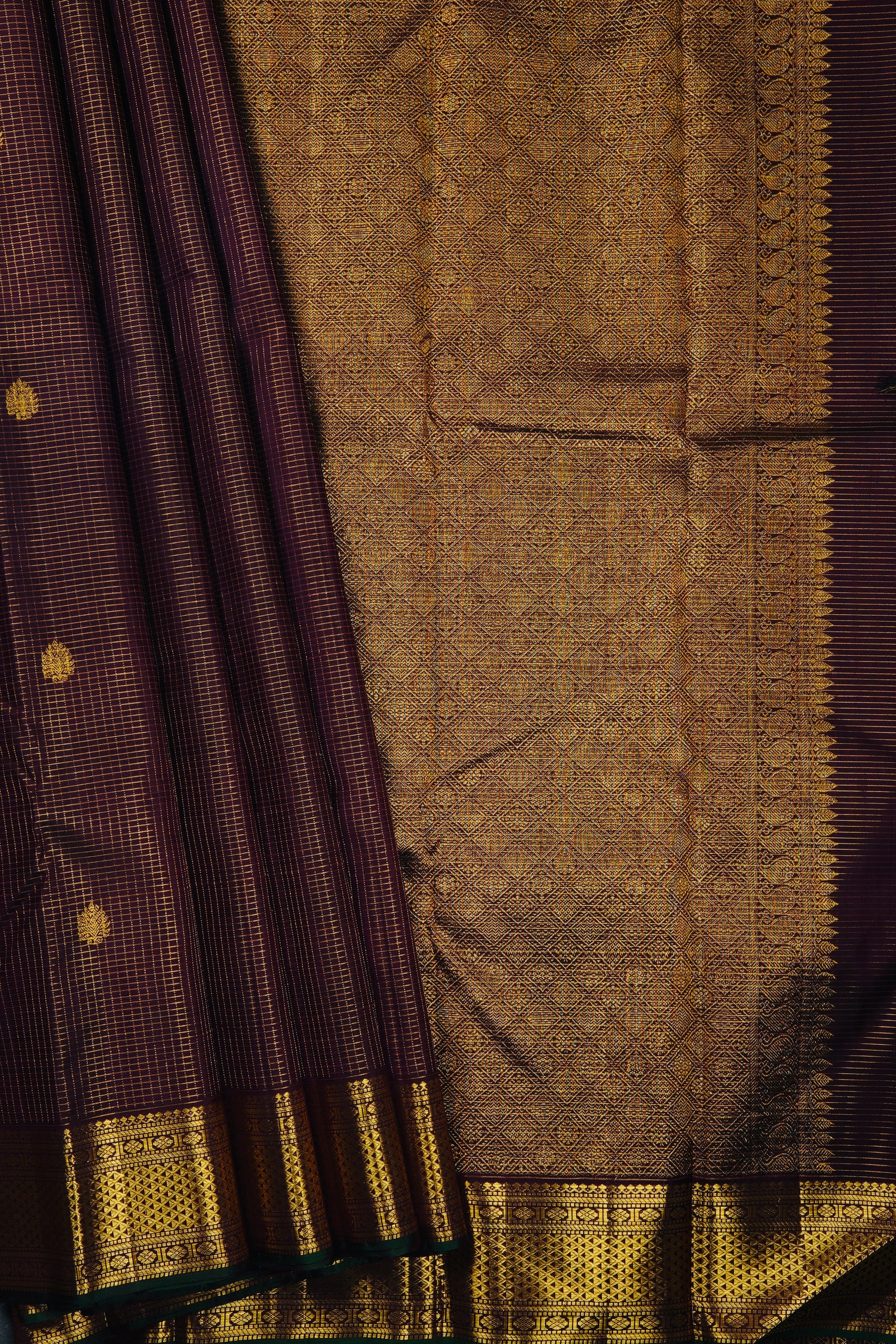 Dark plum kanchipuram silk saree with intricate checks created by gold zari threads with circular and thilakam bhuttas woven in gold zari throughout the body. The border starts with a band of rudraksham bhuttas, followed by diamond grids with half filled diamonds woven in gold zari. The pallu is a wide expanse of diamond grid with each diamond filled alternatively with stylised diamonds and florals, followed by a band of mango bhuttas. The saree has a dark plum blouse with horizontal gold zari lines and the same border.