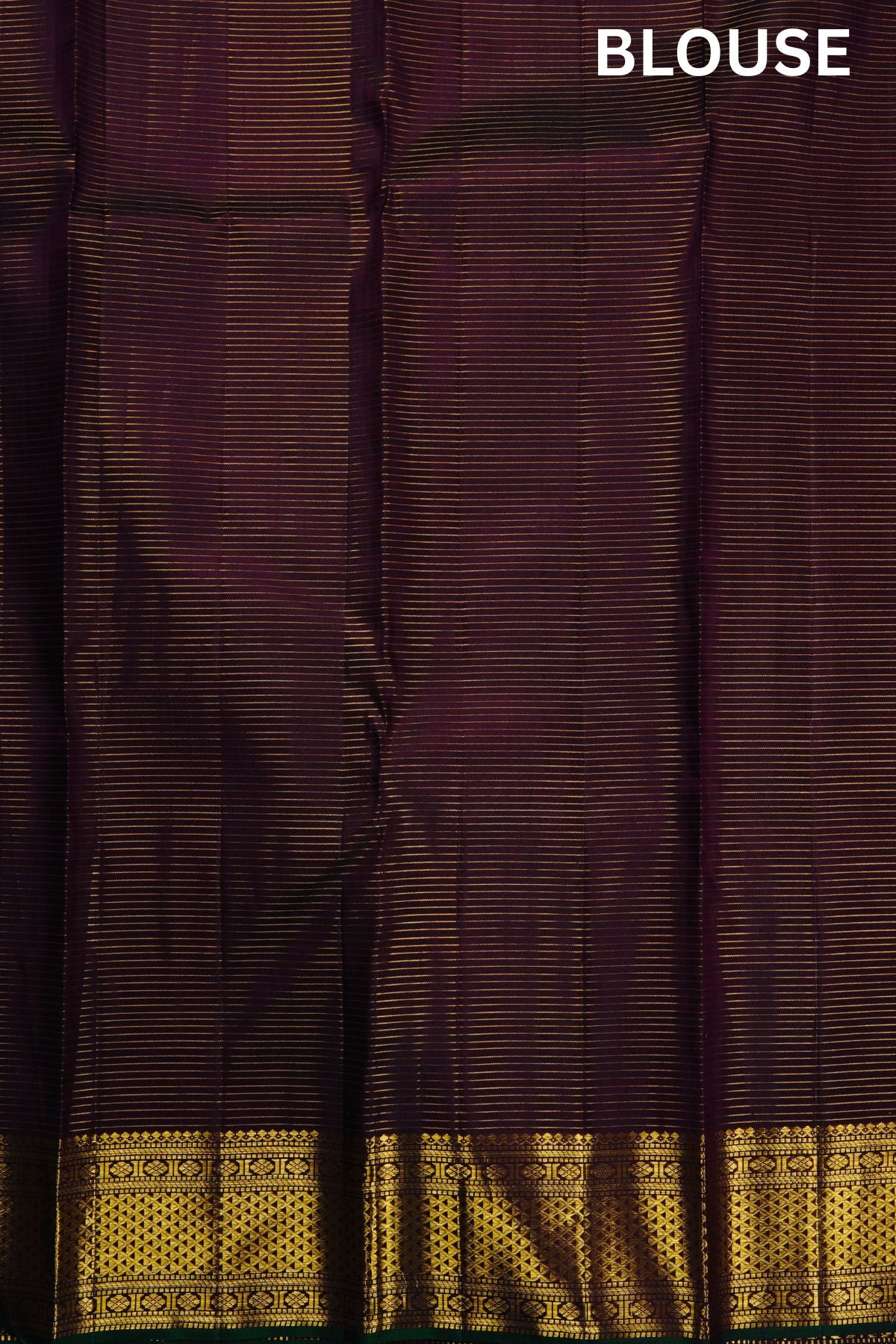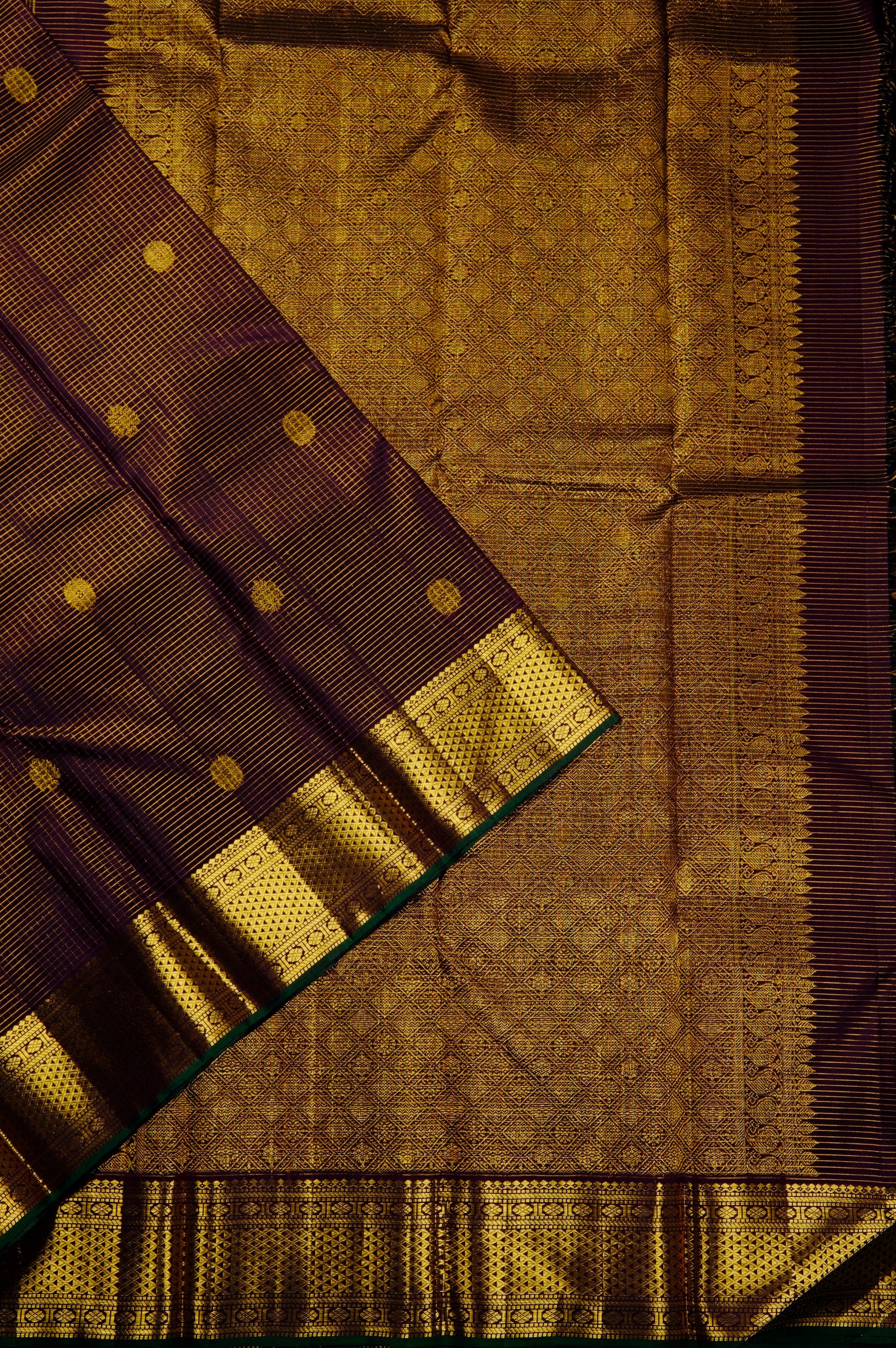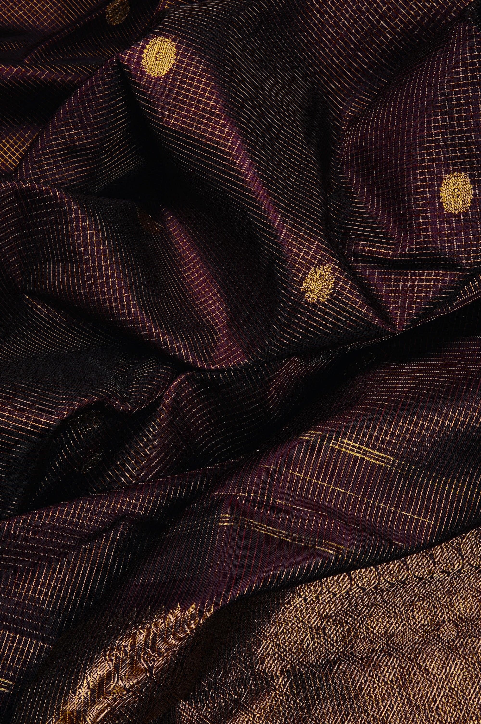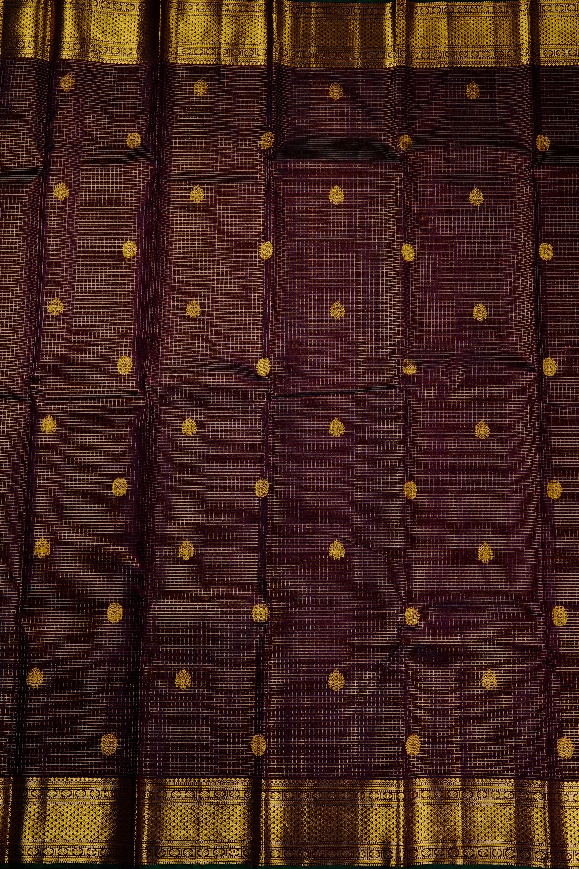 Dark plum kanchipuram silk saree with intricate checks created by gold zari threads with circular and thilakam bhuttas woven in gold zari throughout the body. The border starts with a band of rudraksham bhuttas, followed by diamond grids with half filled diamonds woven in gold zari. The pallu is a wide expanse of diamond grid with each diamond filled alternatively with stylised diamonds and florals, followed by a band of mango bhuttas. The saree has a dark plum blouse with horizontal gold zari lines and the same border.