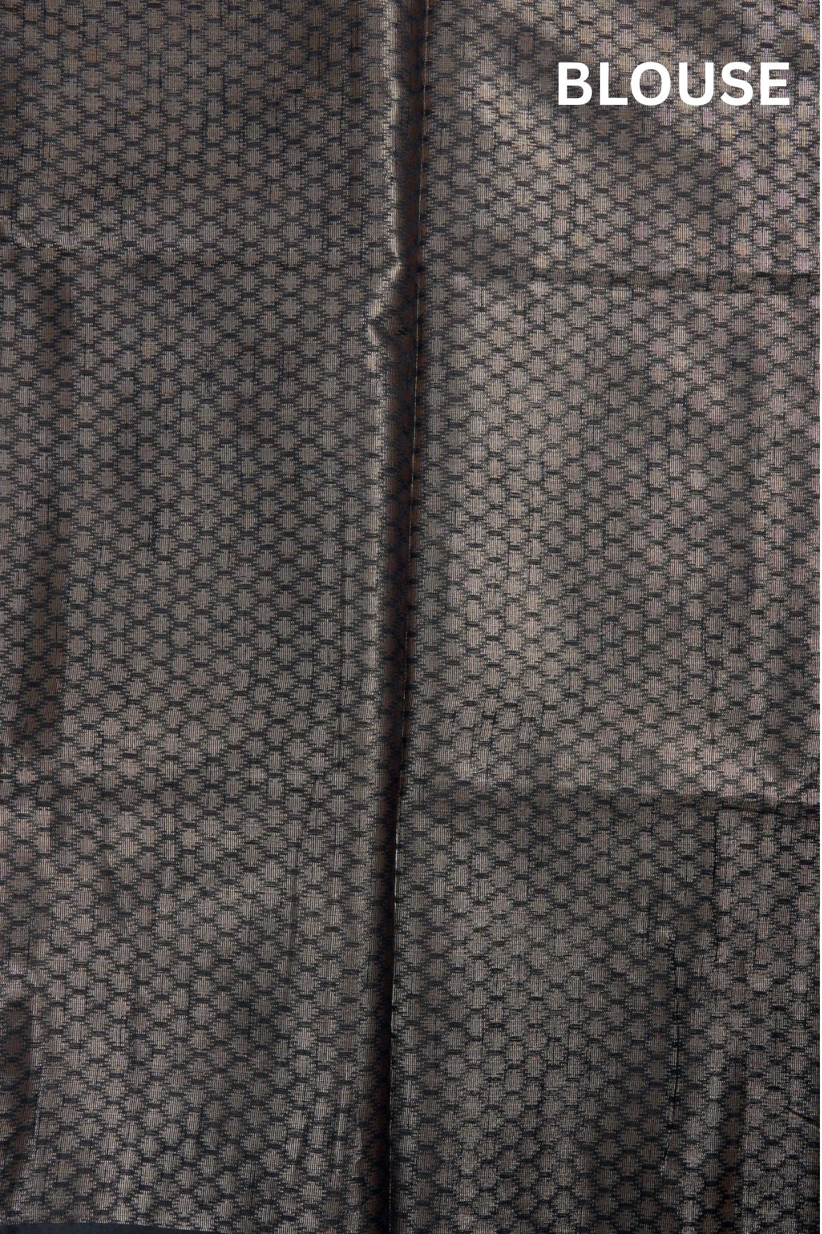 A regal gold body, woven intricately with linear bands of motifs with florals, waves, dots and curves in gold zari. Having a very subtle gold band as its border, it transitions into a silver pallu, with black temple rek patterns as its borer.