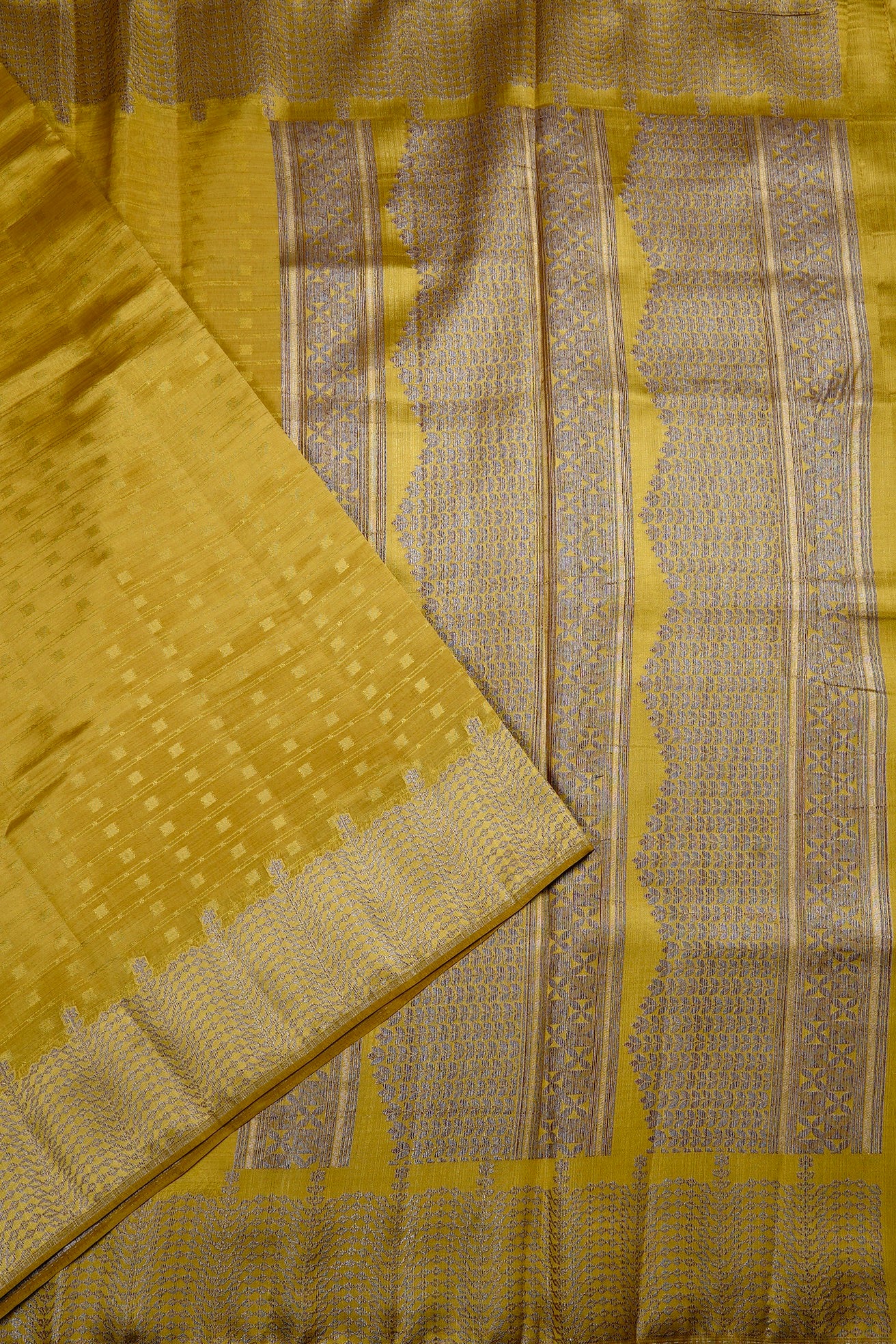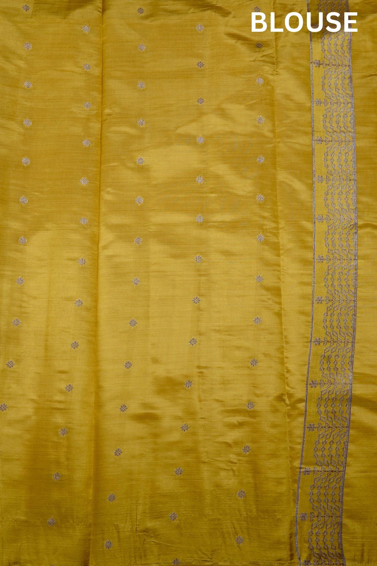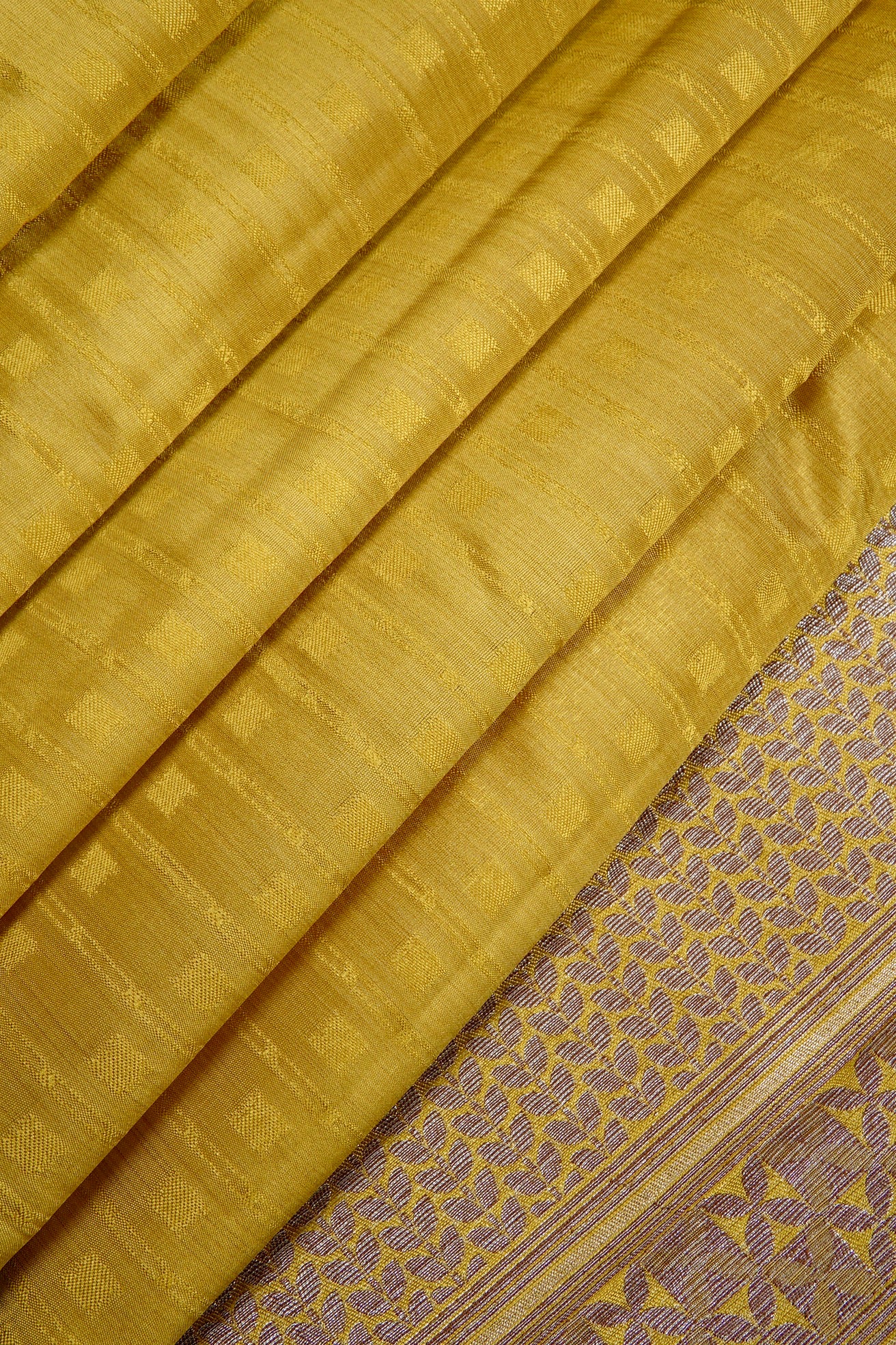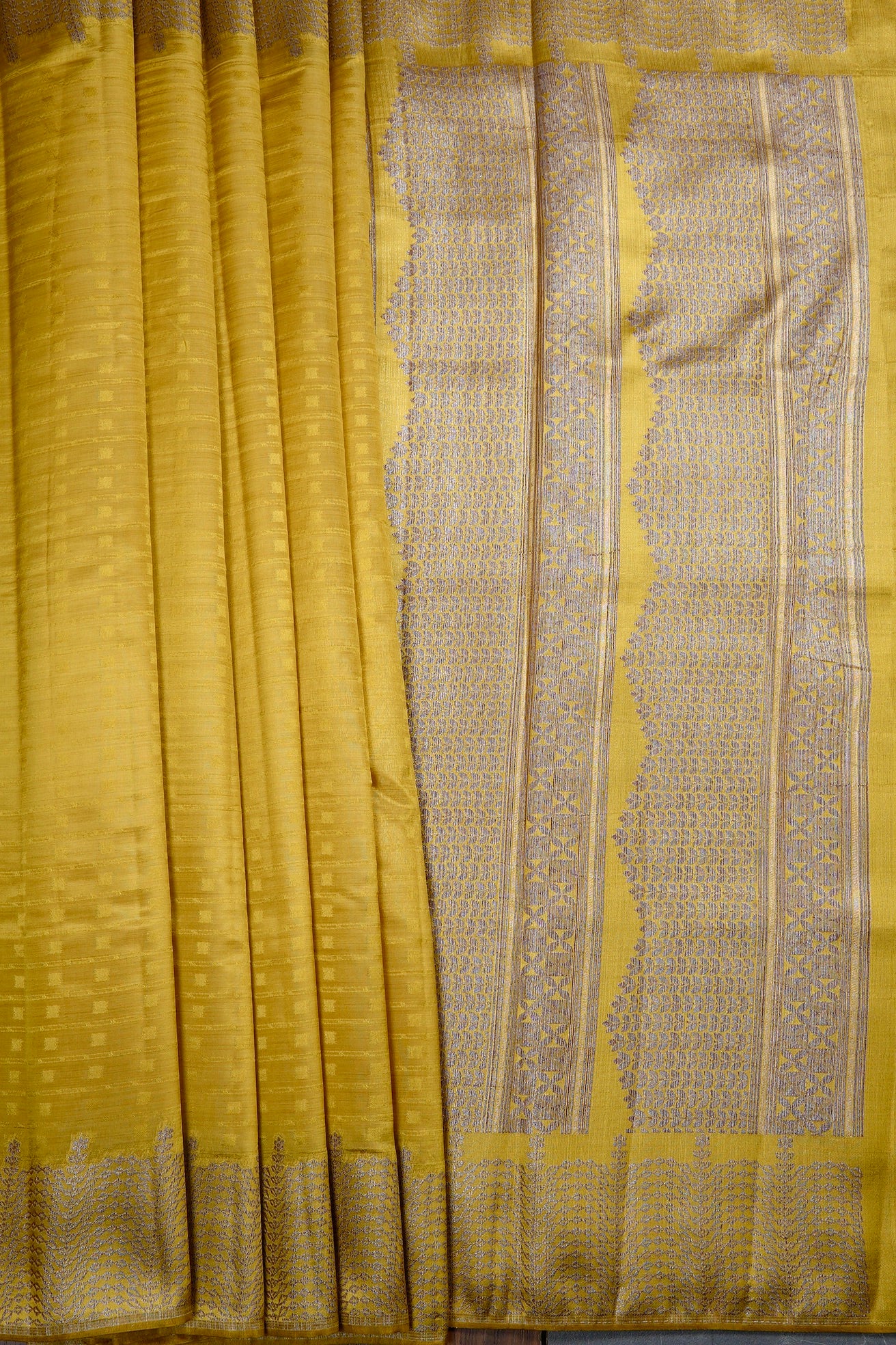 A radiant golden yellow semi tussar saree featuring a subtle, all-over pattern of miniature square buttas woven in silver zari. The saree is framed by an intricate silver zari border showcasing a repeating vine and leaf motif with a delicate scalloped edge. This leads to a stunning pallu detailed with broad vertical panels of dense, shimmering zari in ornate geometric and floral designs. Completing the look is a matching golden yellow blouse adorned with scattered silver floral buttas and a coordinated zari border.