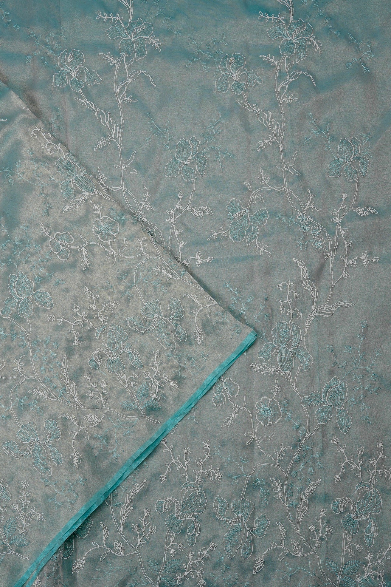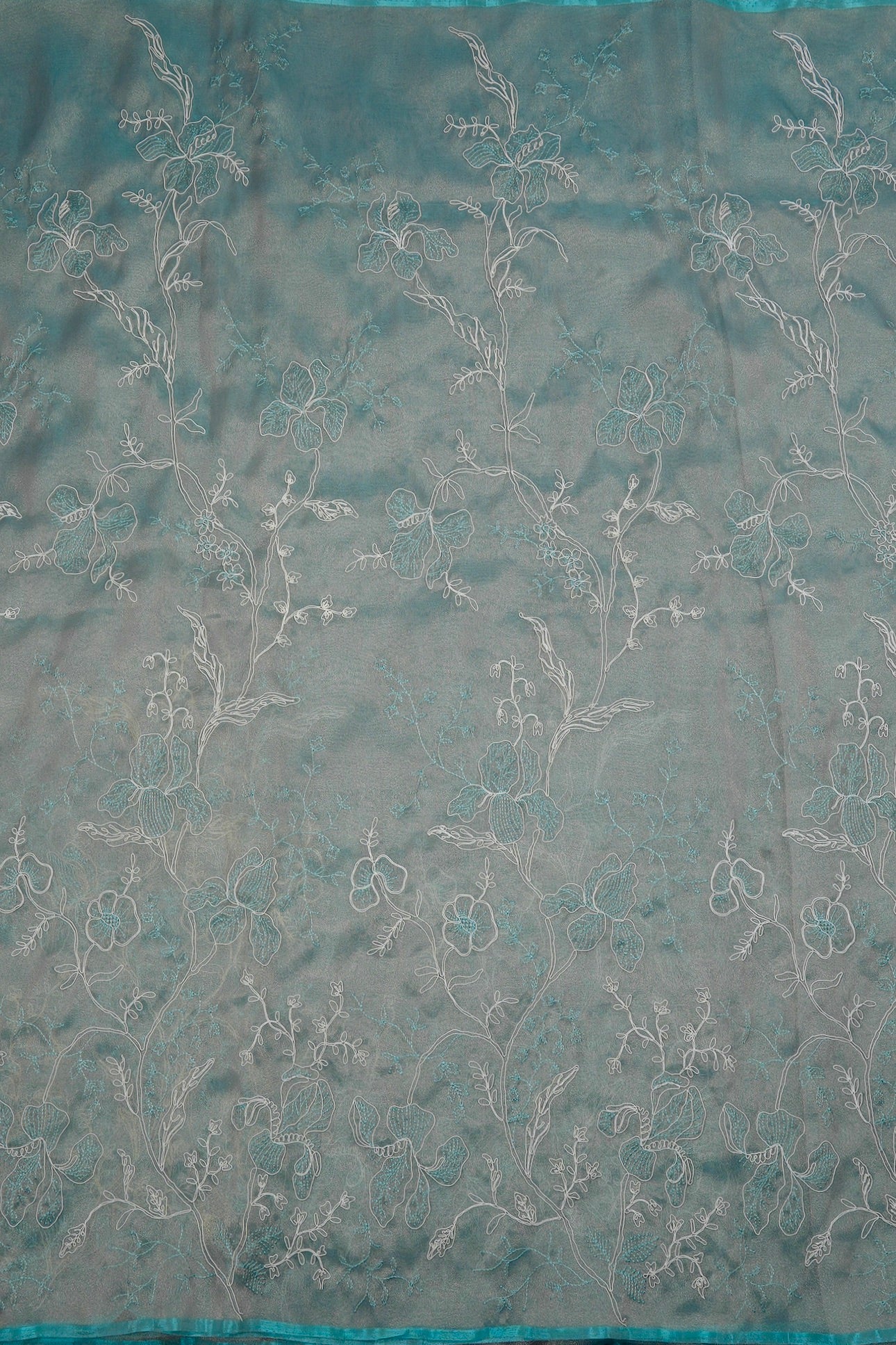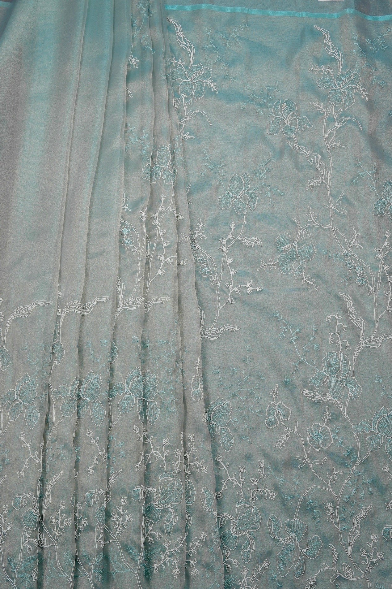 An elegant ice blue semi tussar saree featuring a graceful, all-over body of embroidered floral vines in a delicate white and light blue threads. The saree is framed by a simple, matching light blue border that allows the intricate climbing floral patterns to remain the primary focus. The pallu flowers naturally, resembling the body of the saree.