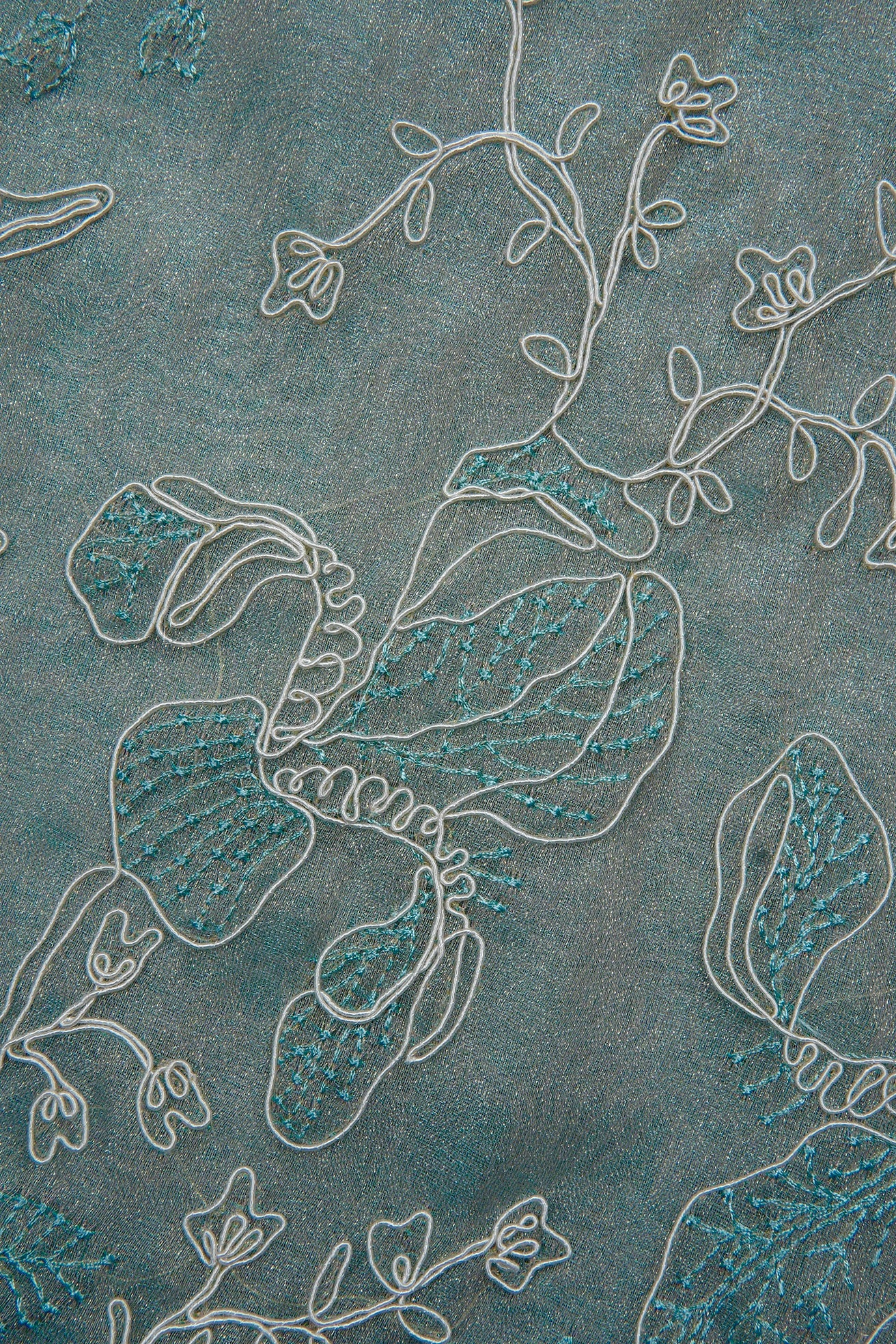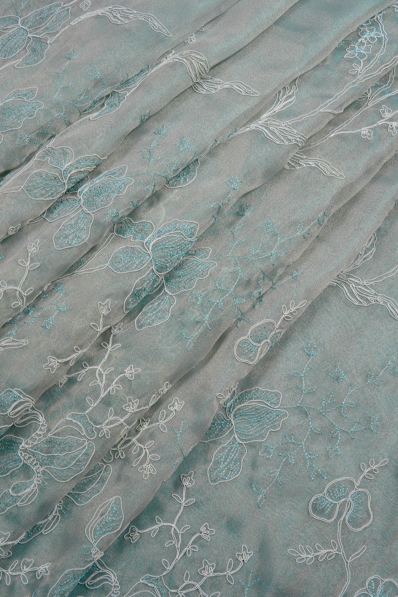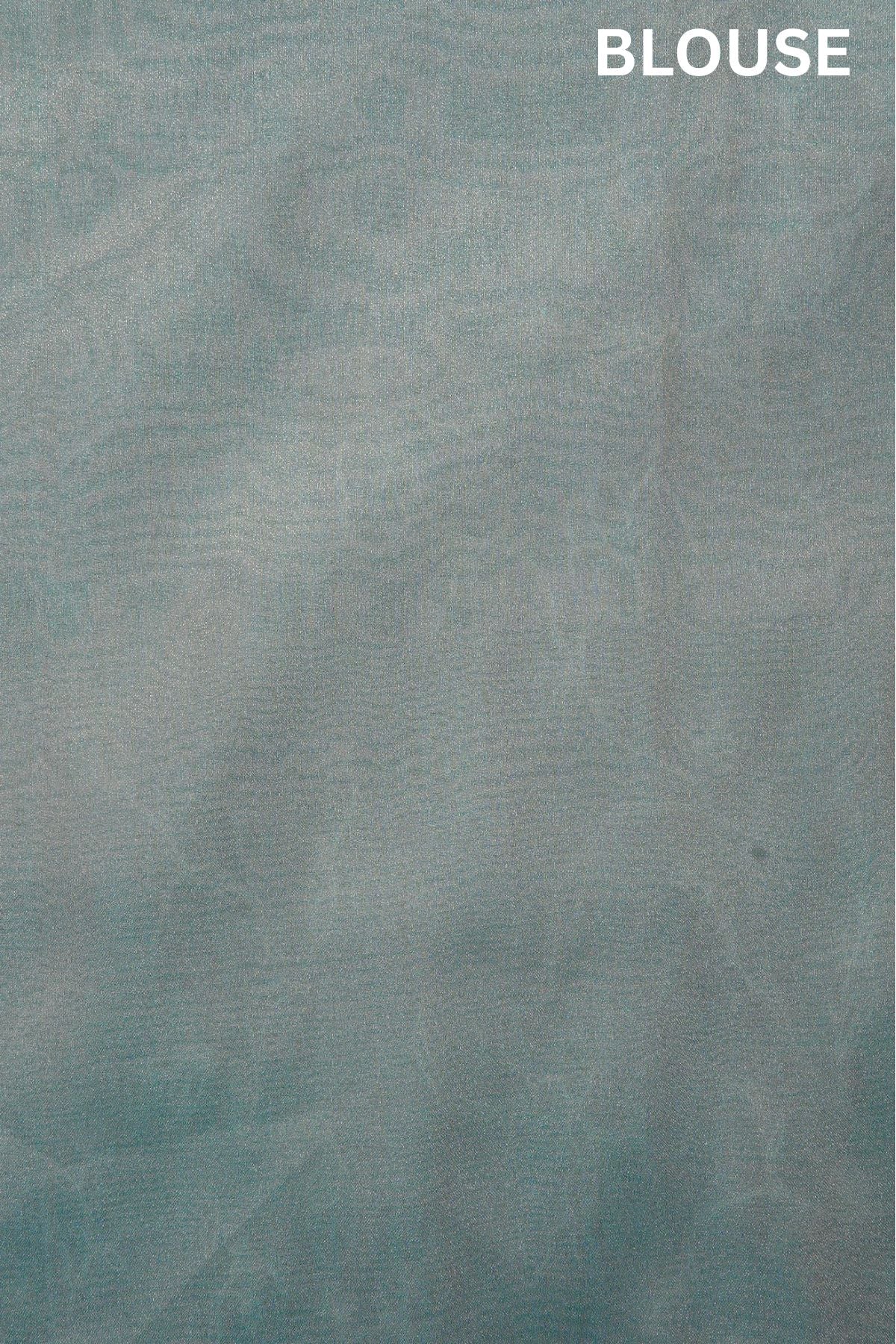 An elegant ice blue semi tussar saree featuring a graceful, all-over body of embroidered floral vines in a delicate white and light blue threads. The saree is framed by a simple, matching light blue border that allows the intricate climbing floral patterns to remain the primary focus. The pallu flowers naturally, resembling the body of the saree.