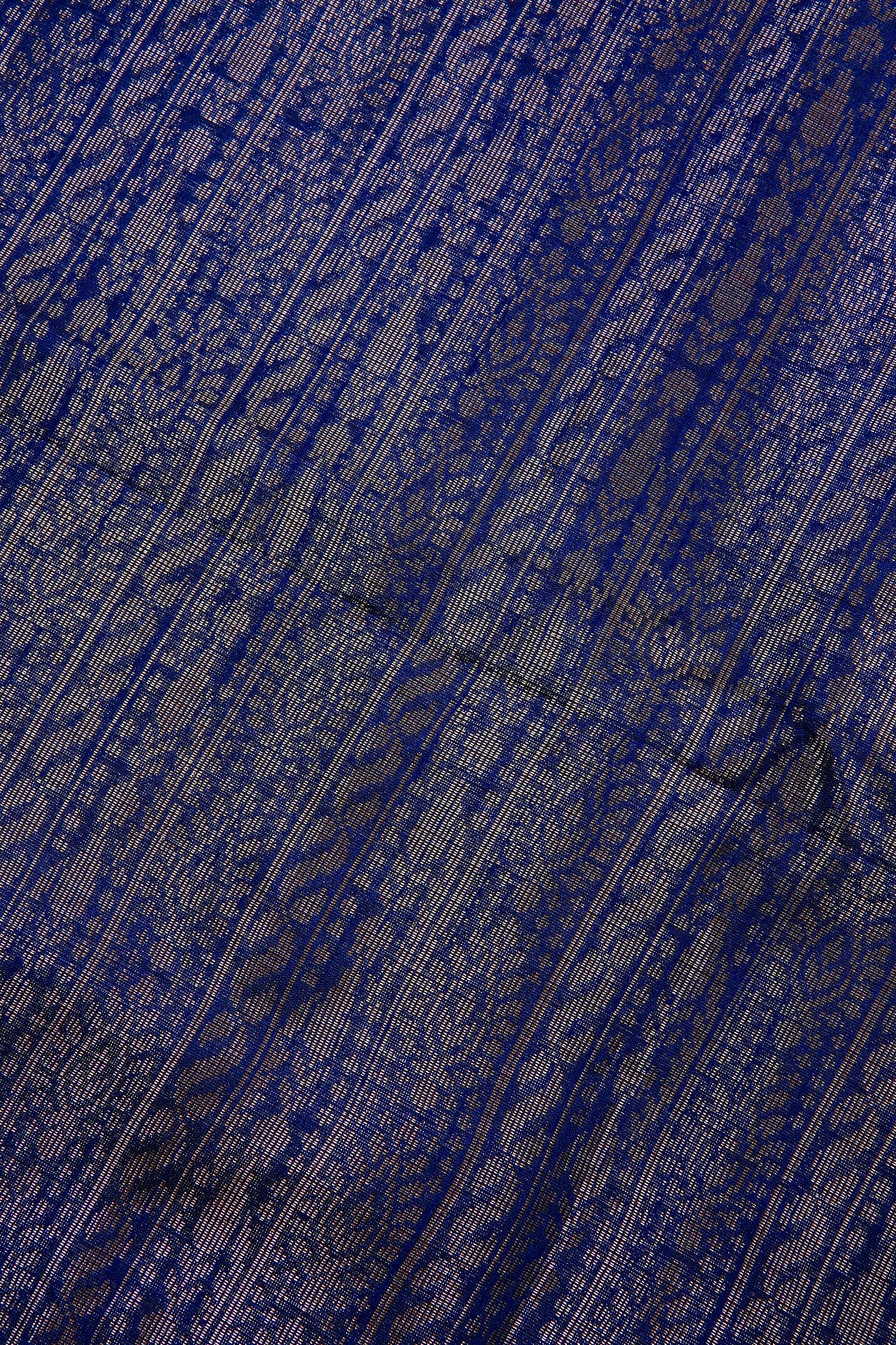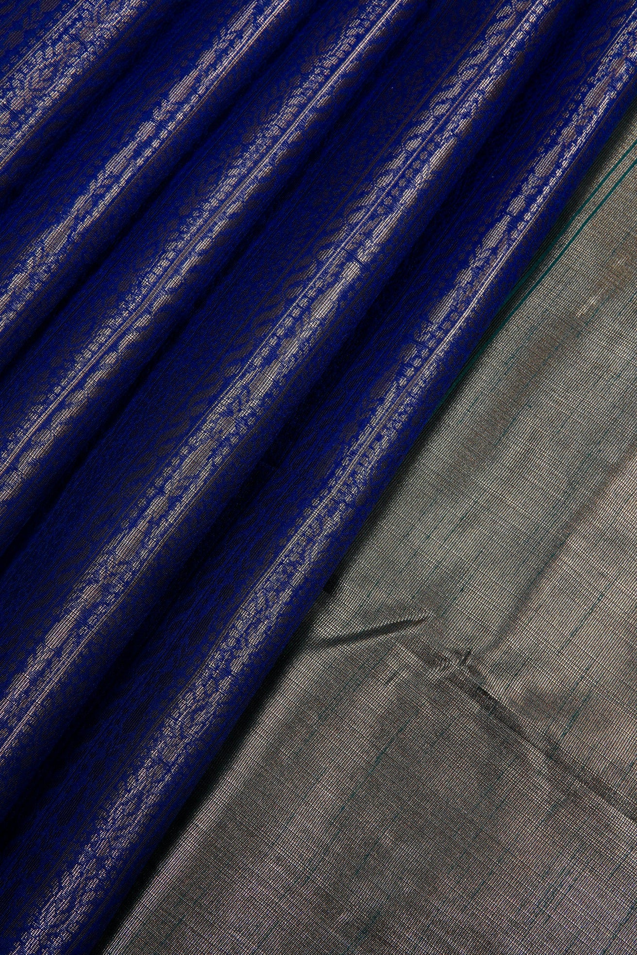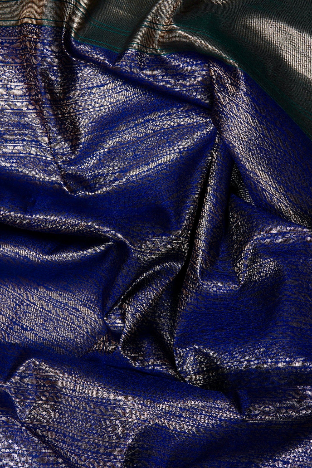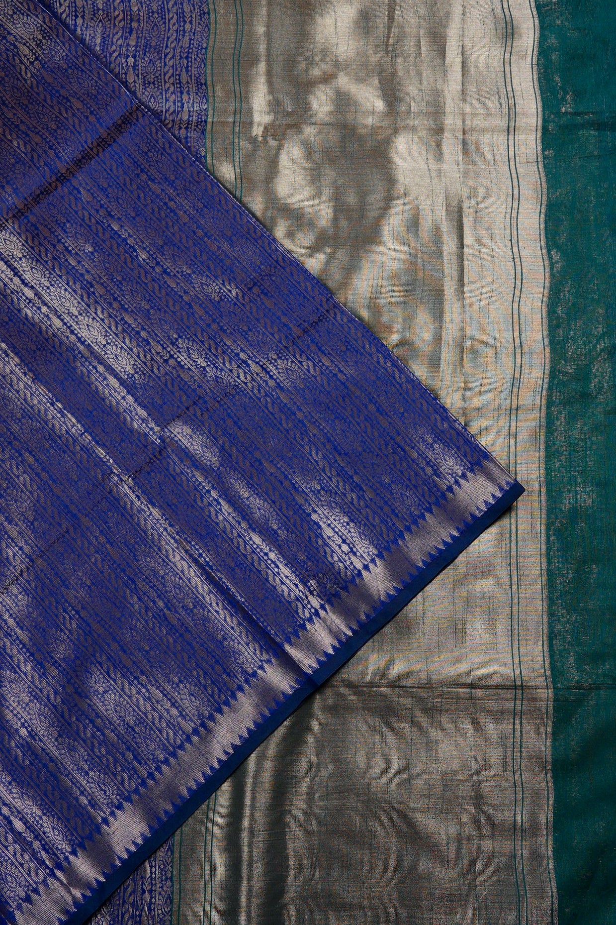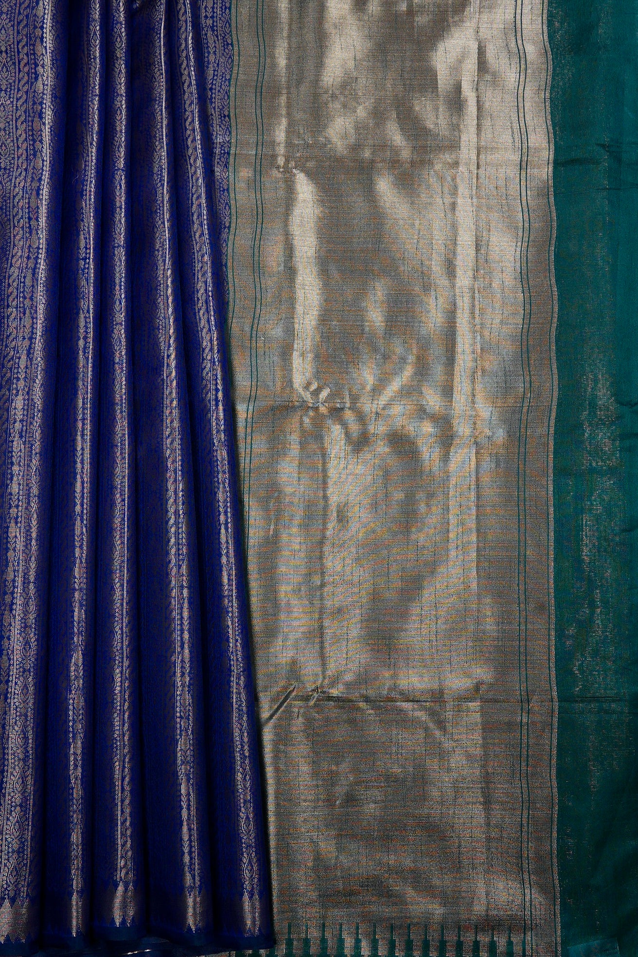 An indigo blue semi tussar saree featuring a sophisticated body covered in dense, vertical columns of intricate silver zari geometric and floral patterns. The border is defined by a clean silver band accented with a sharp diamond patterns. The pallu transitions into a solid, shimmering expanse of brilliant silver zari, ending with a band of teal. Completing the ensemble is a coordinated teal blouse adorned with a fine, all-over silver weave and a matching border woven in silver