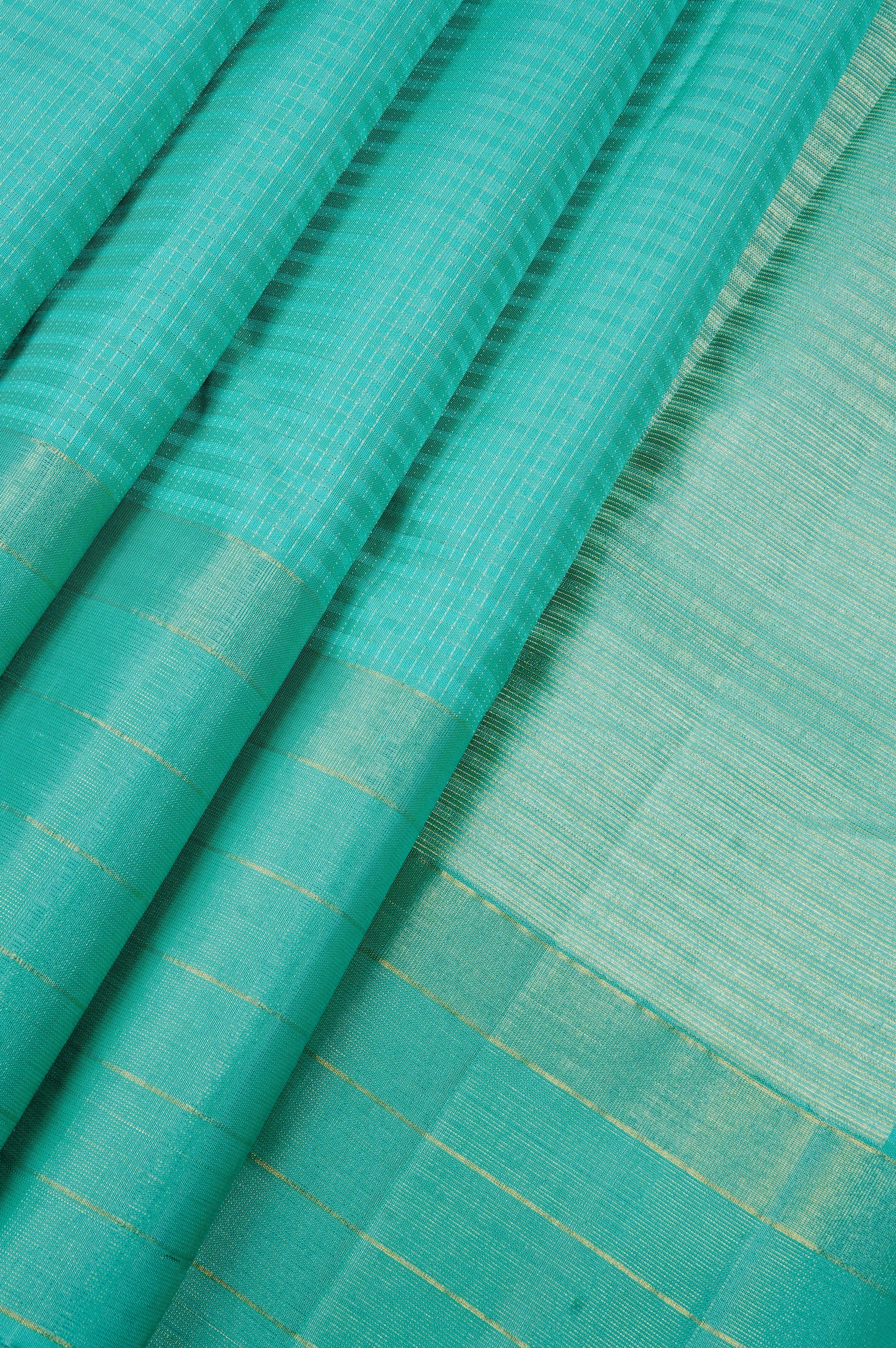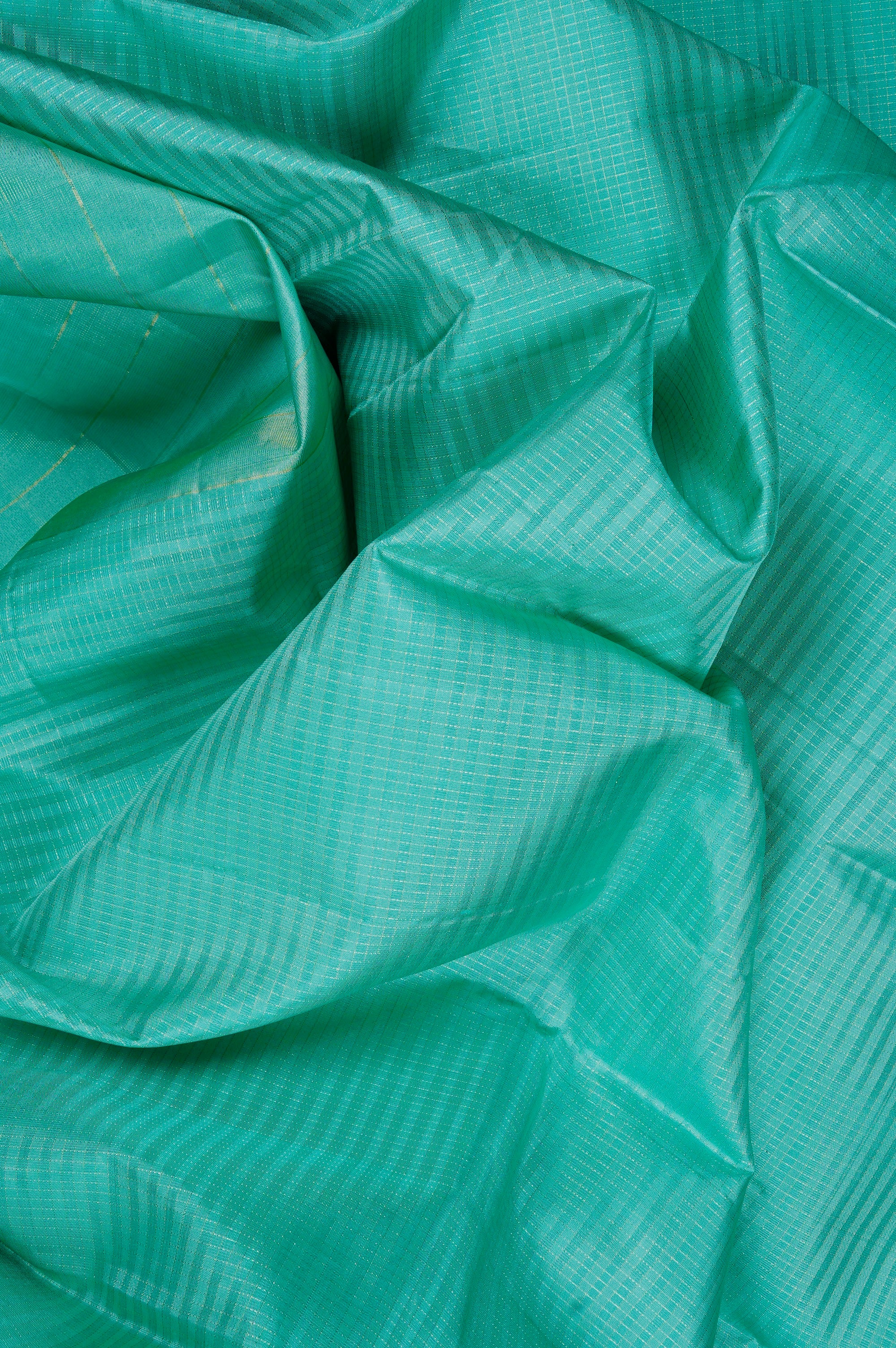 Jade mountain kanchipuram silk saree with very intricate and small checks created by zari and a subtle horizontal stripes effect created by darker threads. The border is of the same color, starting with a band of gold zari followed by smaller horizontal stripes woven in gold zari. The pallu has a wide vertical area of gold zari followed by smaller lines woven in gold zari. The saree has a monochromic blouse identical to the body and the same border.