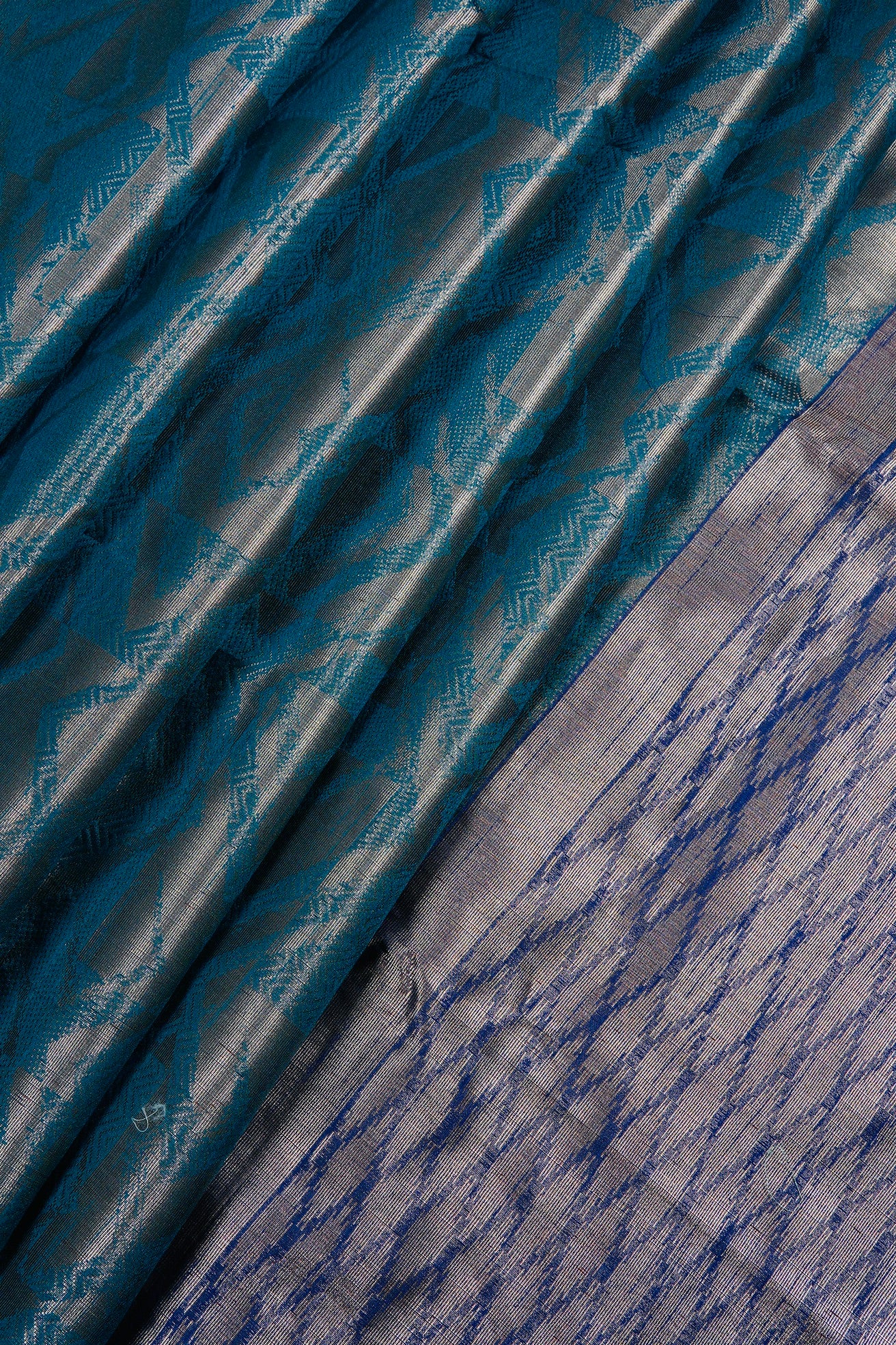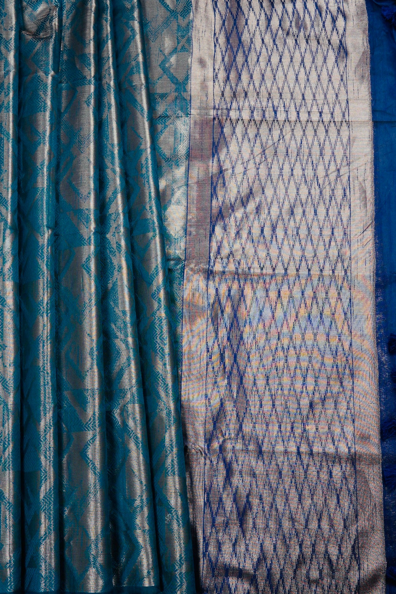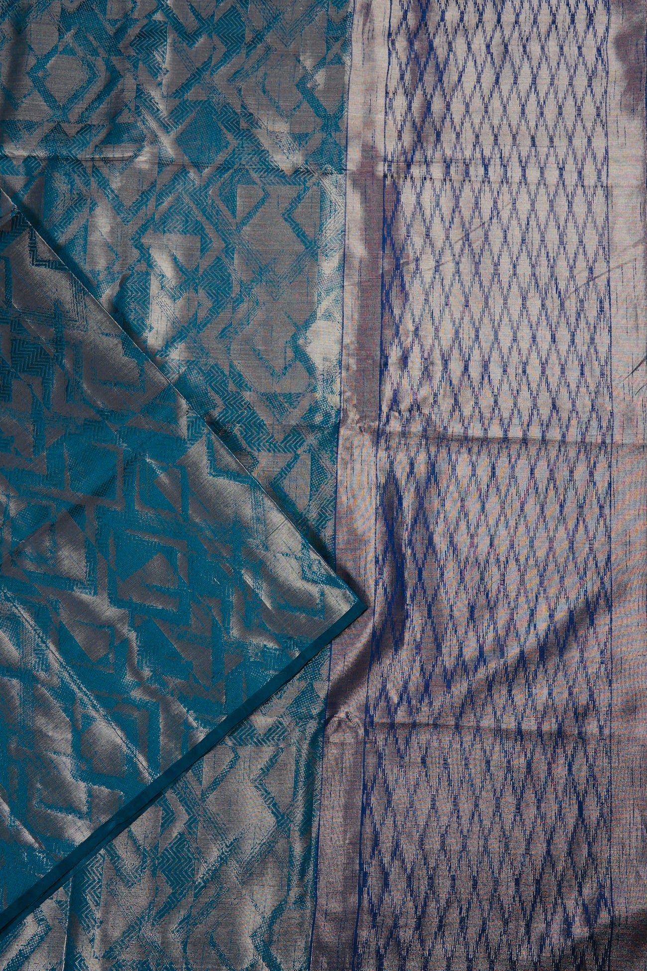 A light blue semi tussar saree featuring a modern, all-over body of abstract geometric diamond patterns woven in silver zari. The pallu transitions into a bold display of dense diamond-weave panels in shimmering silver on a navy blue base. The look is completed by a navy blue blouse adorned with an intricate silver honeycomb weave.