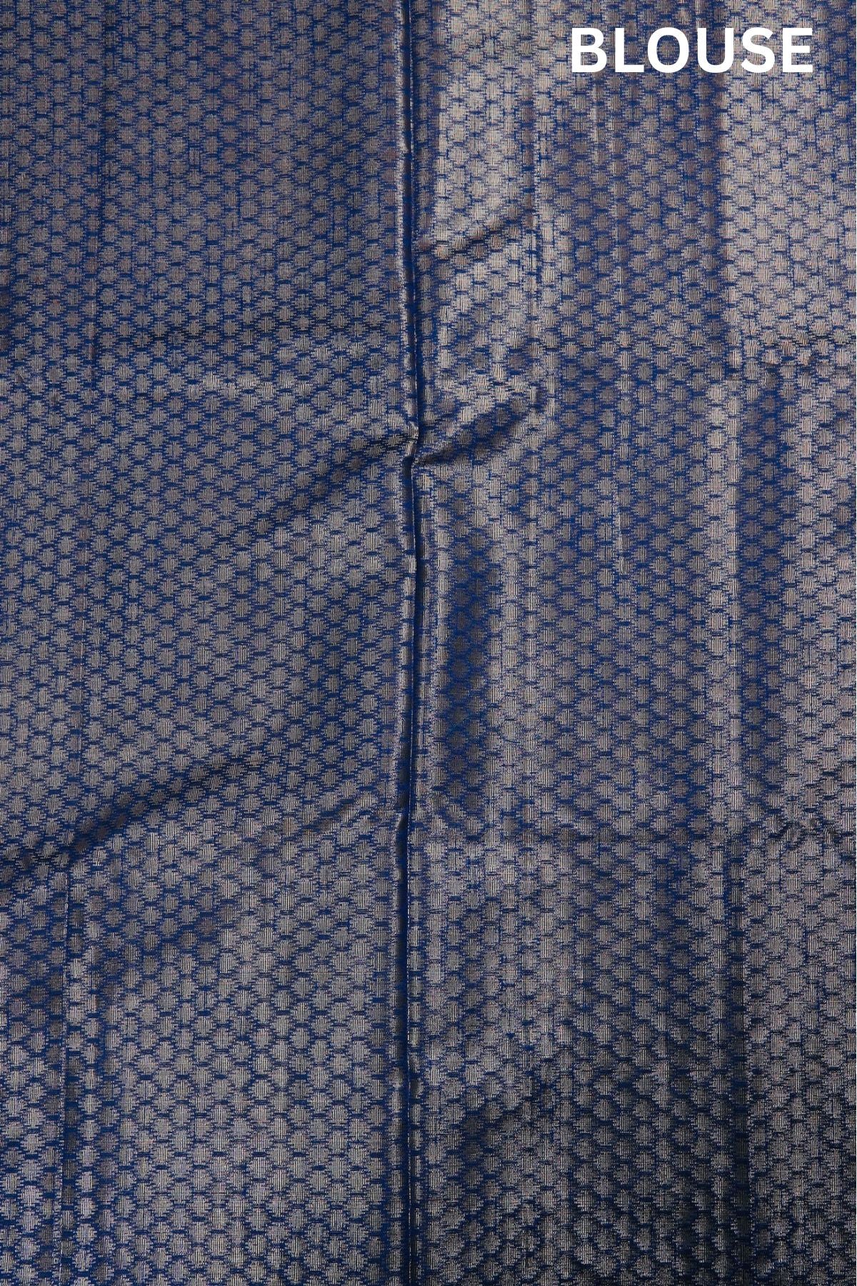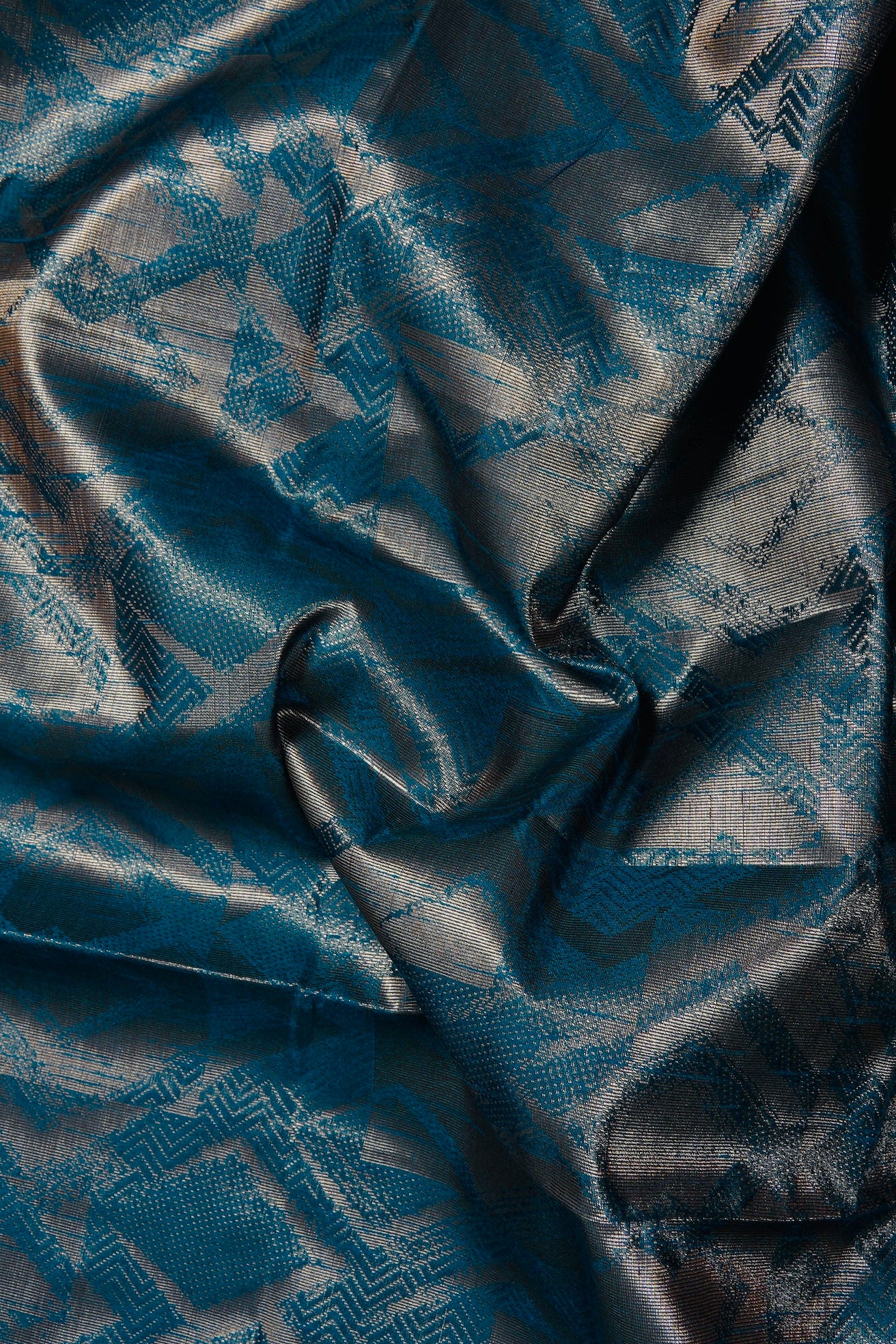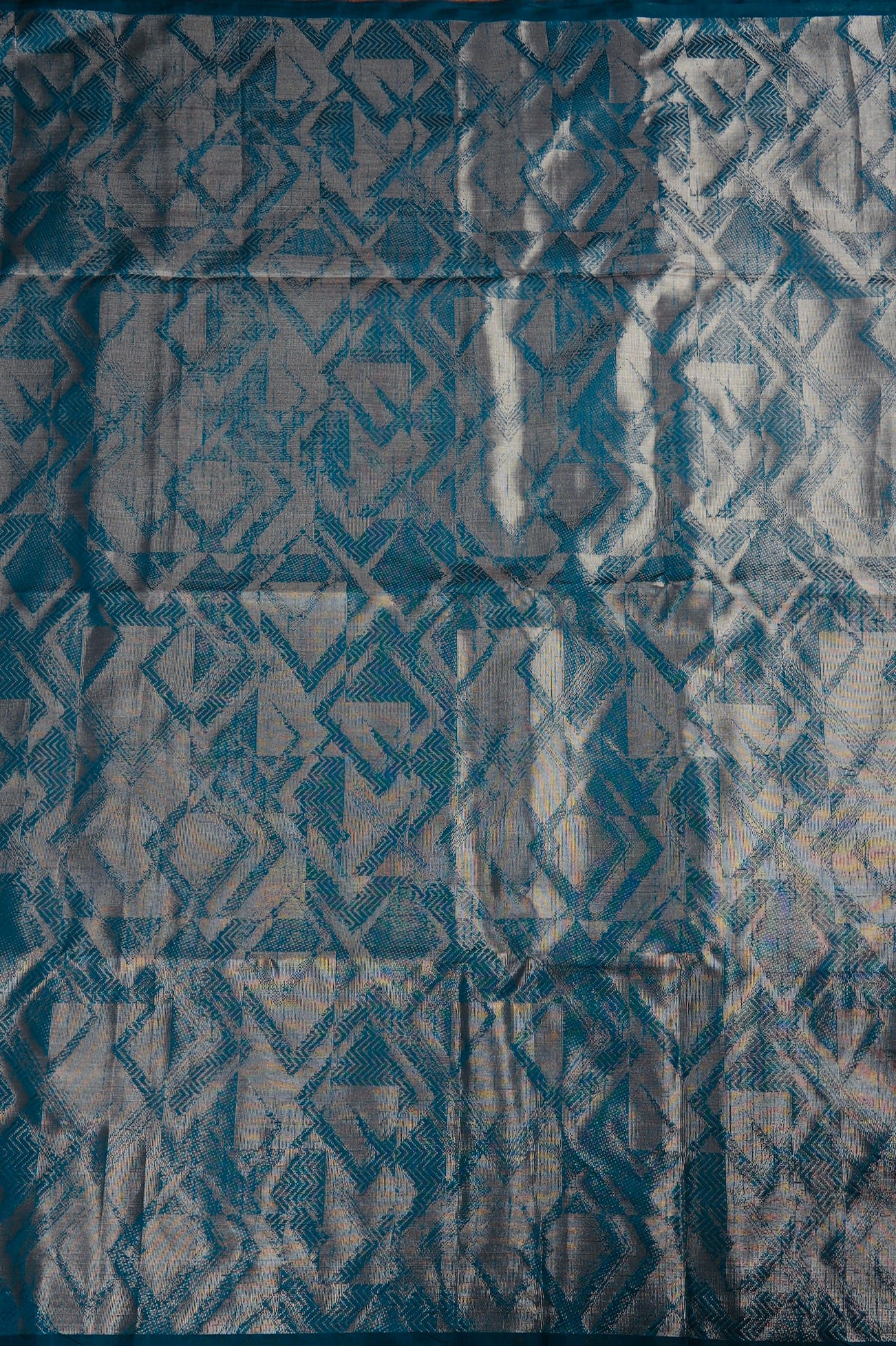 A light blue semi tussar saree featuring a modern, all-over body of abstract geometric diamond patterns woven in silver zari. The pallu transitions into a bold display of dense diamond-weave panels in shimmering silver on a navy blue base. The look is completed by a navy blue blouse adorned with an intricate silver honeycomb weave.