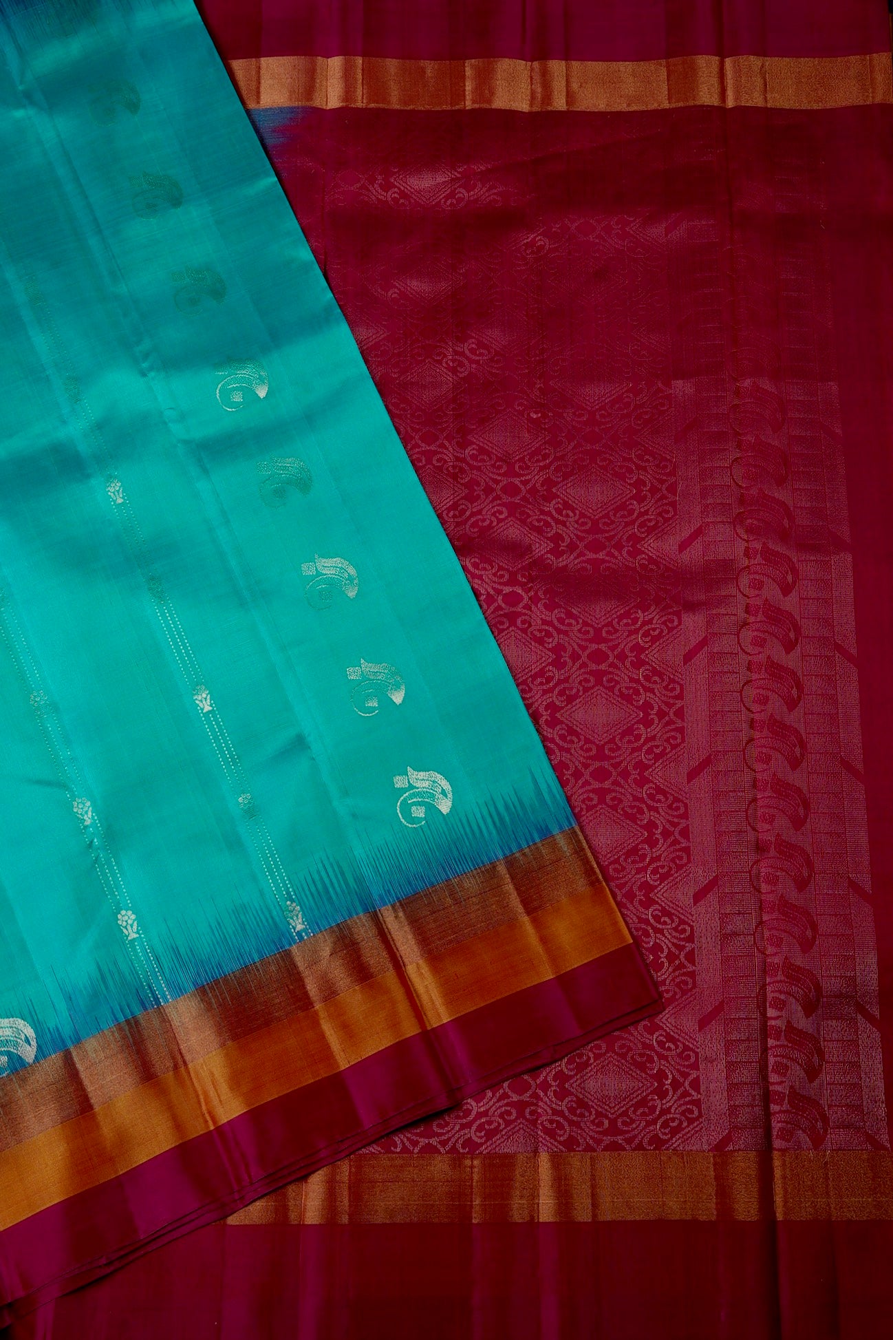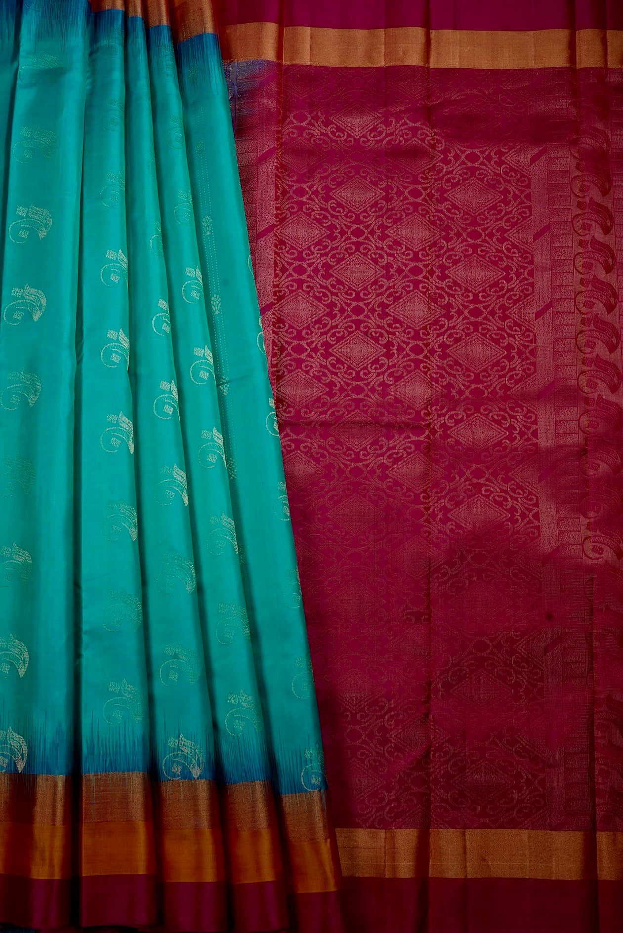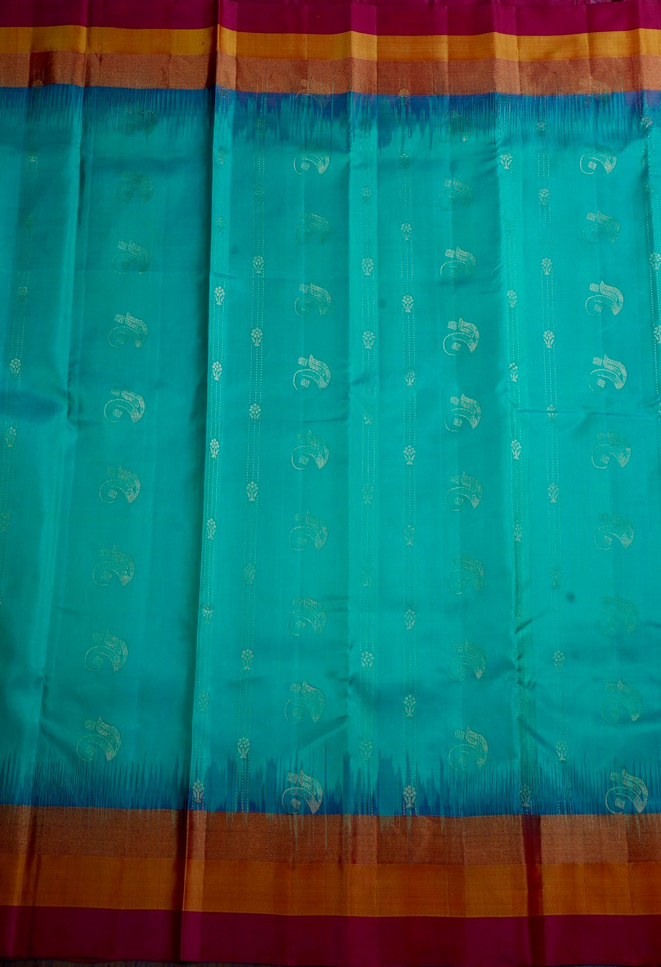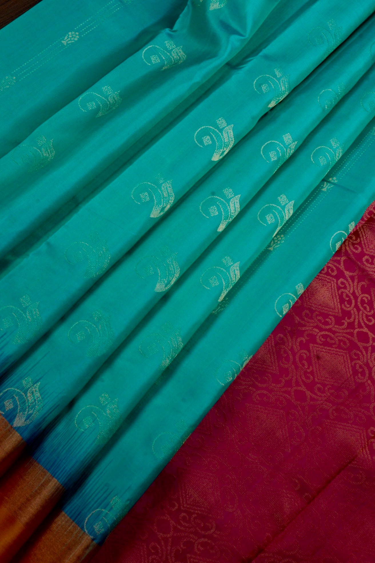 Light teal soft silk saree filled with small curved motifs, separated by stylised lines holding flowers woven in gold zari, leading to a simple border holding a series of bands woven in gold, orange and rani pink. The pallu has a rani pink base holding diamond motifs surrounded by vine motifs woven in zari. The saree has a solid rani pink blouse with a simple gold zari border.