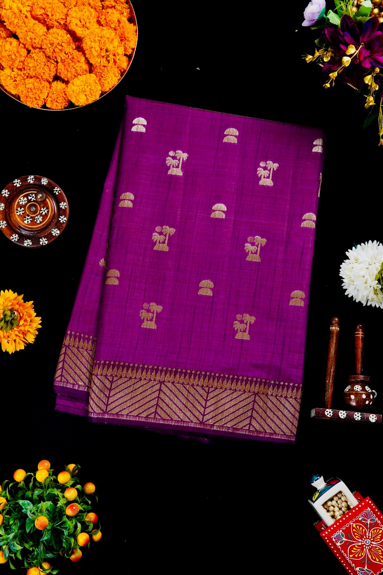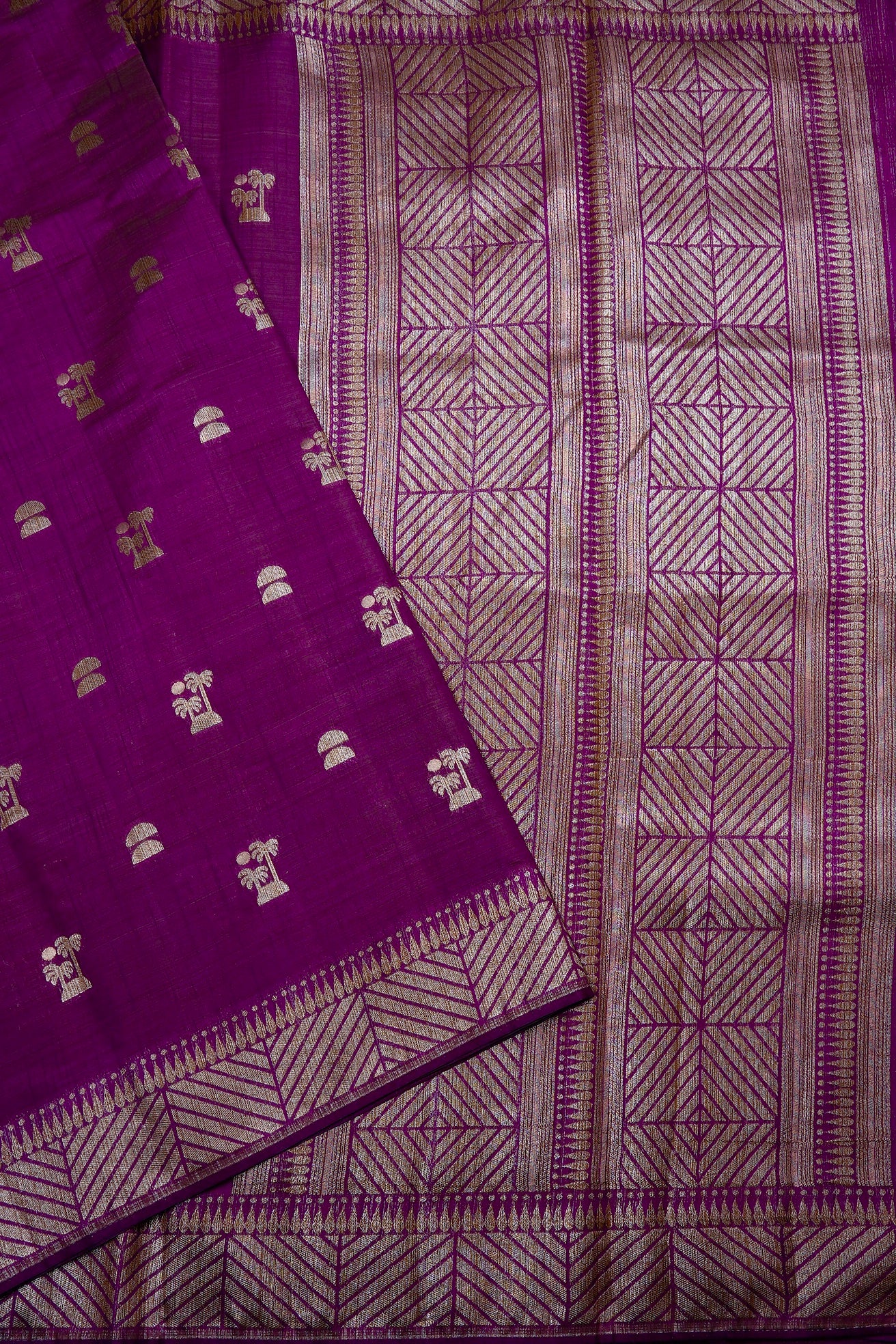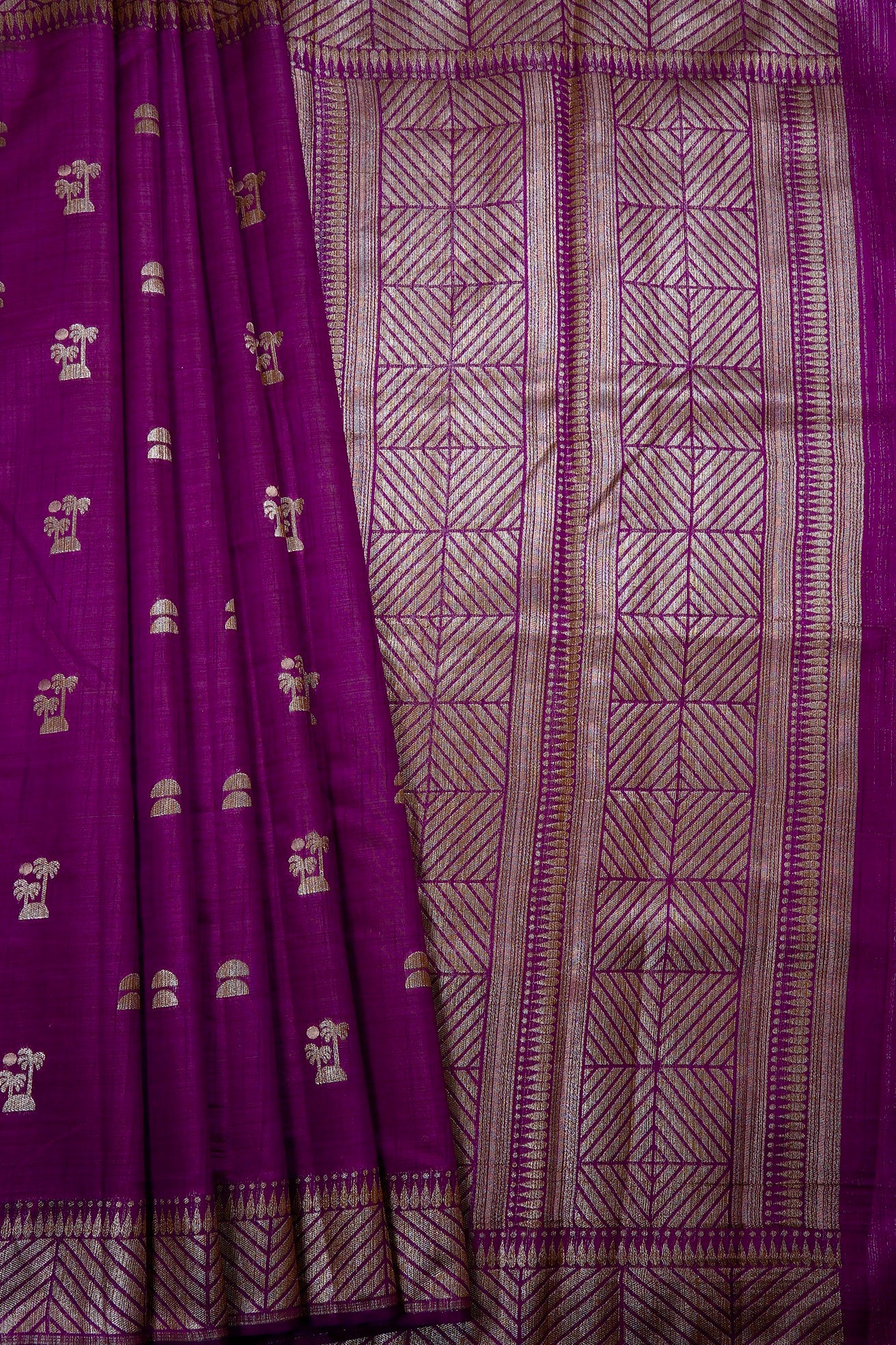 A magenta semi tussar saree featuring a delicate scattered pattern of zari buttas portraying tropical trees and dual half moons. The border is defined by a bold, geometric chevron pattern in gold zari, lending a structured elegance to the drape. The pallu is filled with elaborate diamond and linear geometric weaves in shimmering zari, resembling the border. Completing the look is a matching magenta blouse adorned with fine floral buttas and a coordinated geometric border.