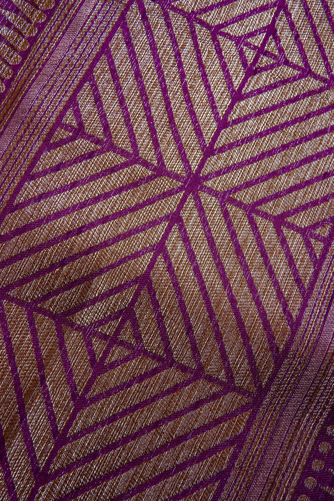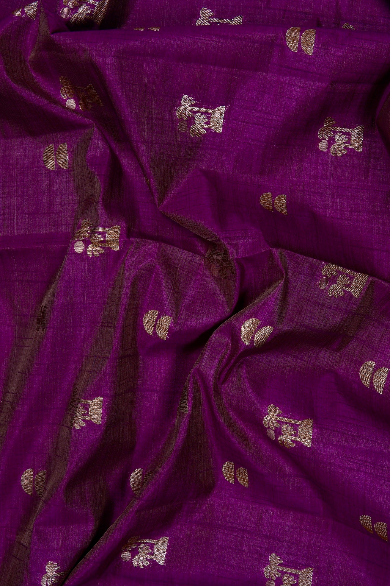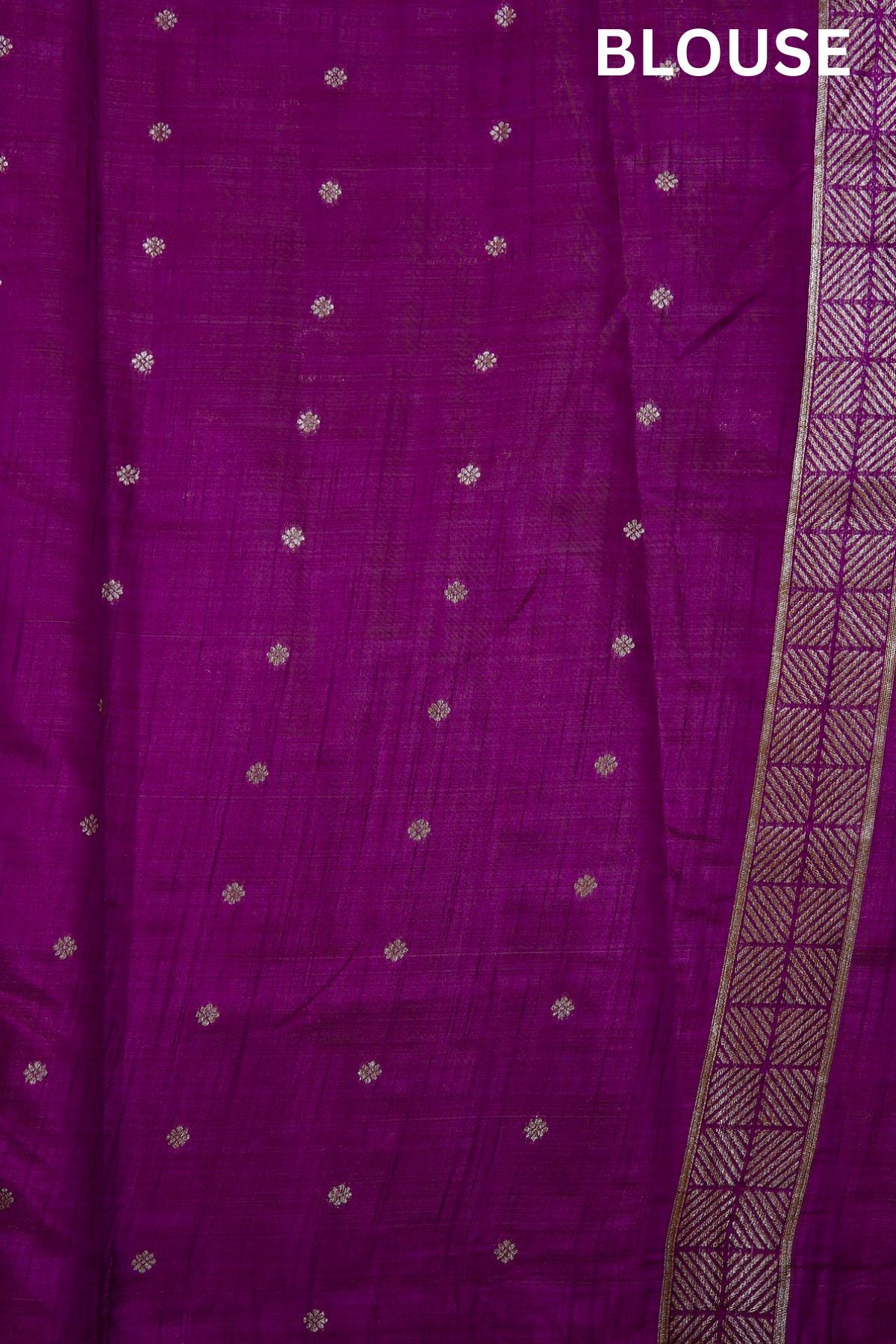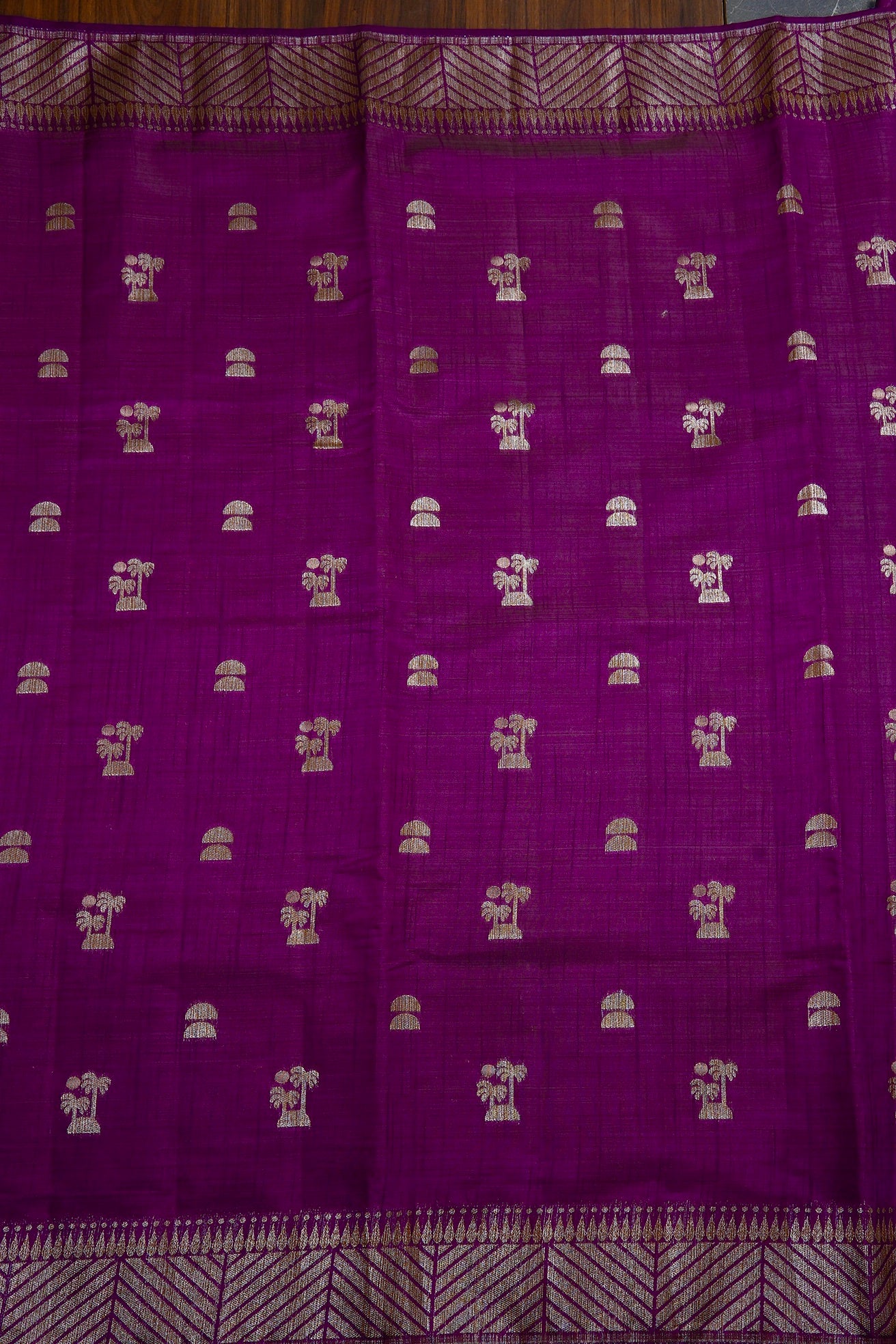 A magenta semi tussar saree featuring a delicate scattered pattern of zari buttas portraying tropical trees and dual half moons. The border is defined by a bold, geometric chevron pattern in gold zari, lending a structured elegance to the drape. The pallu is filled with elaborate diamond and linear geometric weaves in shimmering zari, resembling the border. Completing the look is a matching magenta blouse adorned with fine floral buttas and a coordinated geometric border.
