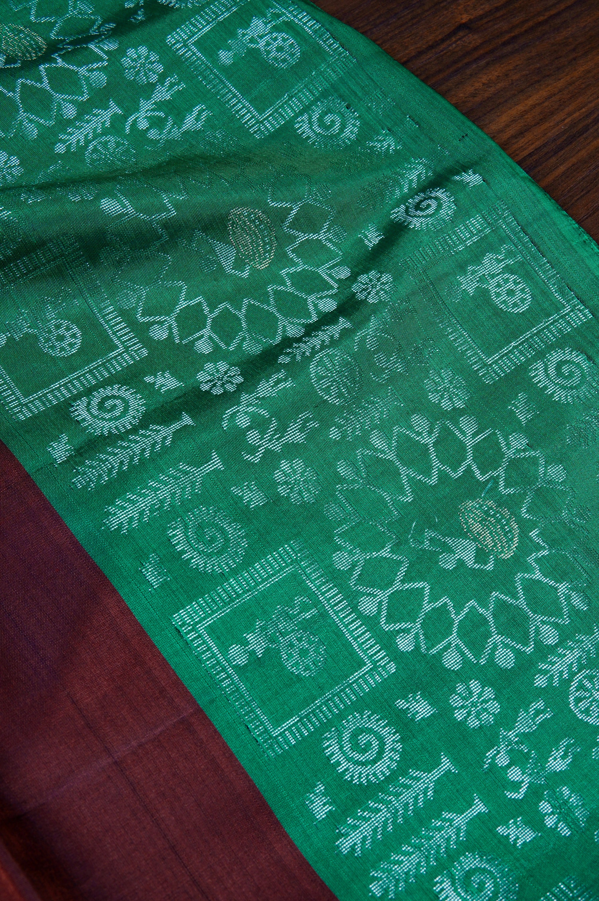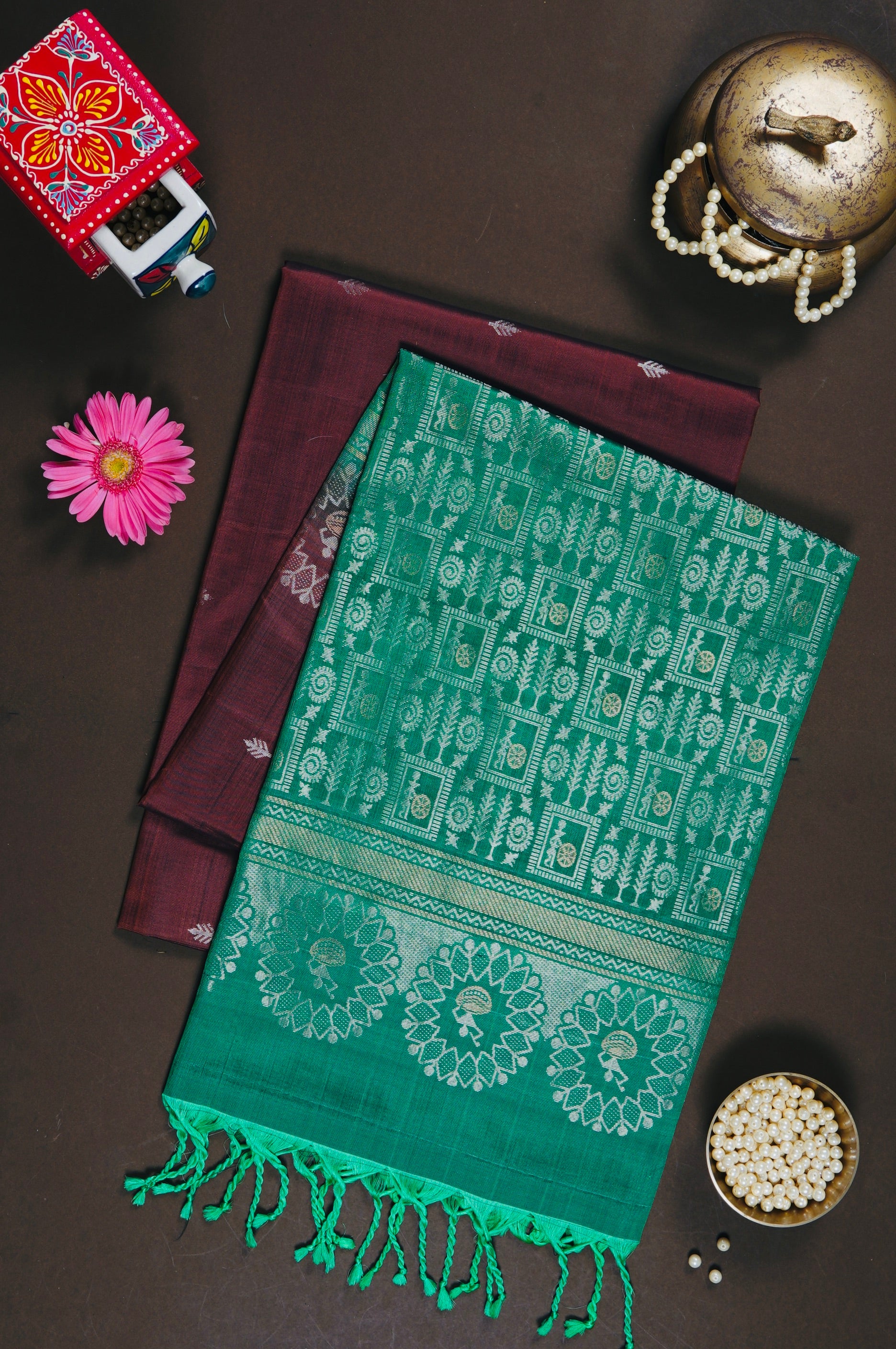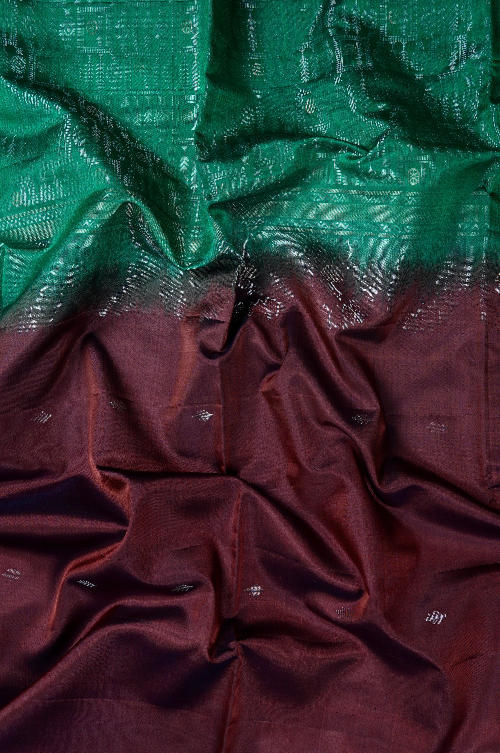 Step into timeless sophistication with this exquisite soft silk saree, featuring a rich maroon body delicately sprinkled with dainty, evenly spaced silver zari buttas. A striking contrast is achieved through the vibrant jade green border, intricately woven with shimmering silver zari to display a mesmerizing sequence of circular patterns, traditional square frames and other small abstract motifs falling right into place though looking scattered. The ensemble is beautifully finished by a lavish jade green pallu, commanding attention with its dense silver zari brocade that masterfully echoes the border's ornate geometric patterns for a truly opulent drape.