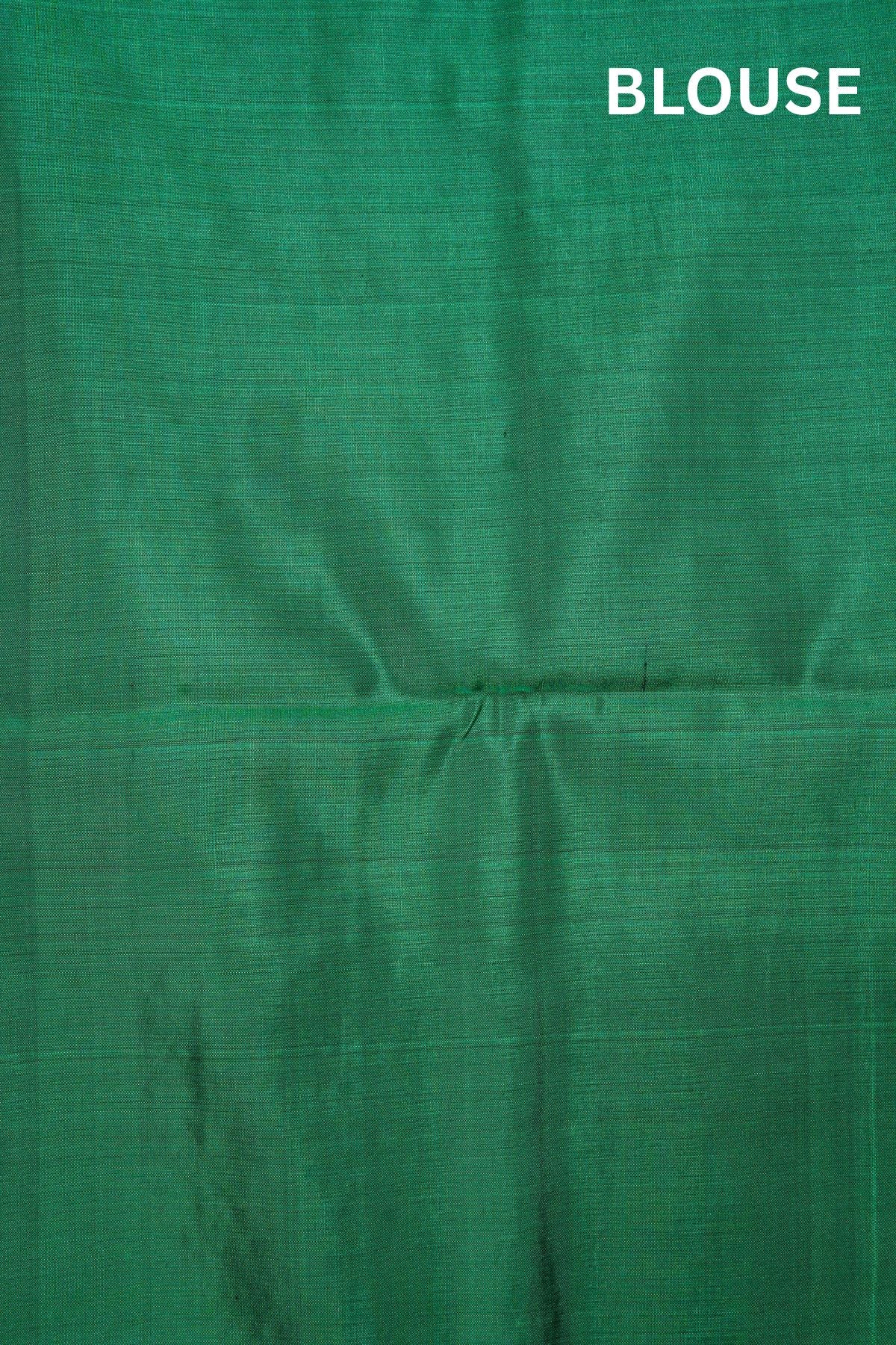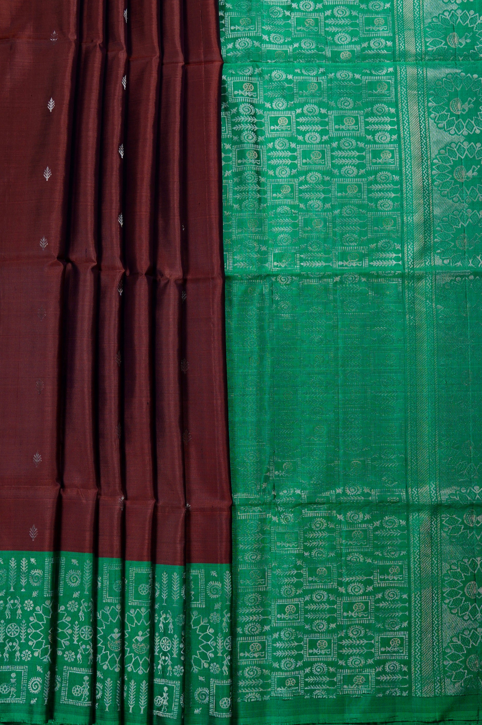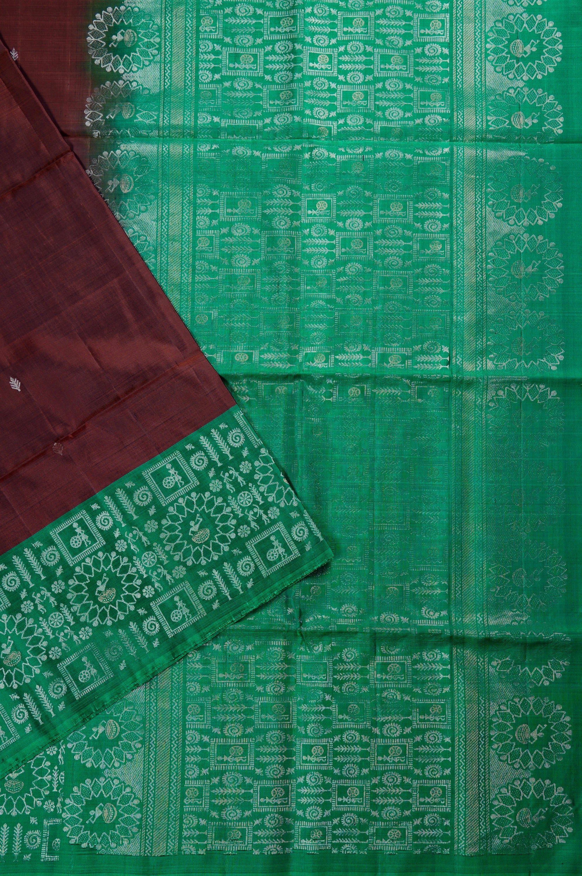 Step into timeless sophistication with this exquisite soft silk saree, featuring a rich maroon body delicately sprinkled with dainty, evenly spaced silver zari buttas. A striking contrast is achieved through the vibrant jade green border, intricately woven with shimmering silver zari to display a mesmerizing sequence of circular patterns, traditional square frames and other small abstract motifs falling right into place though looking scattered. The ensemble is beautifully finished by a lavish jade green pallu, commanding attention with its dense silver zari brocade that masterfully echoes the border's ornate geometric patterns for a truly opulent drape.