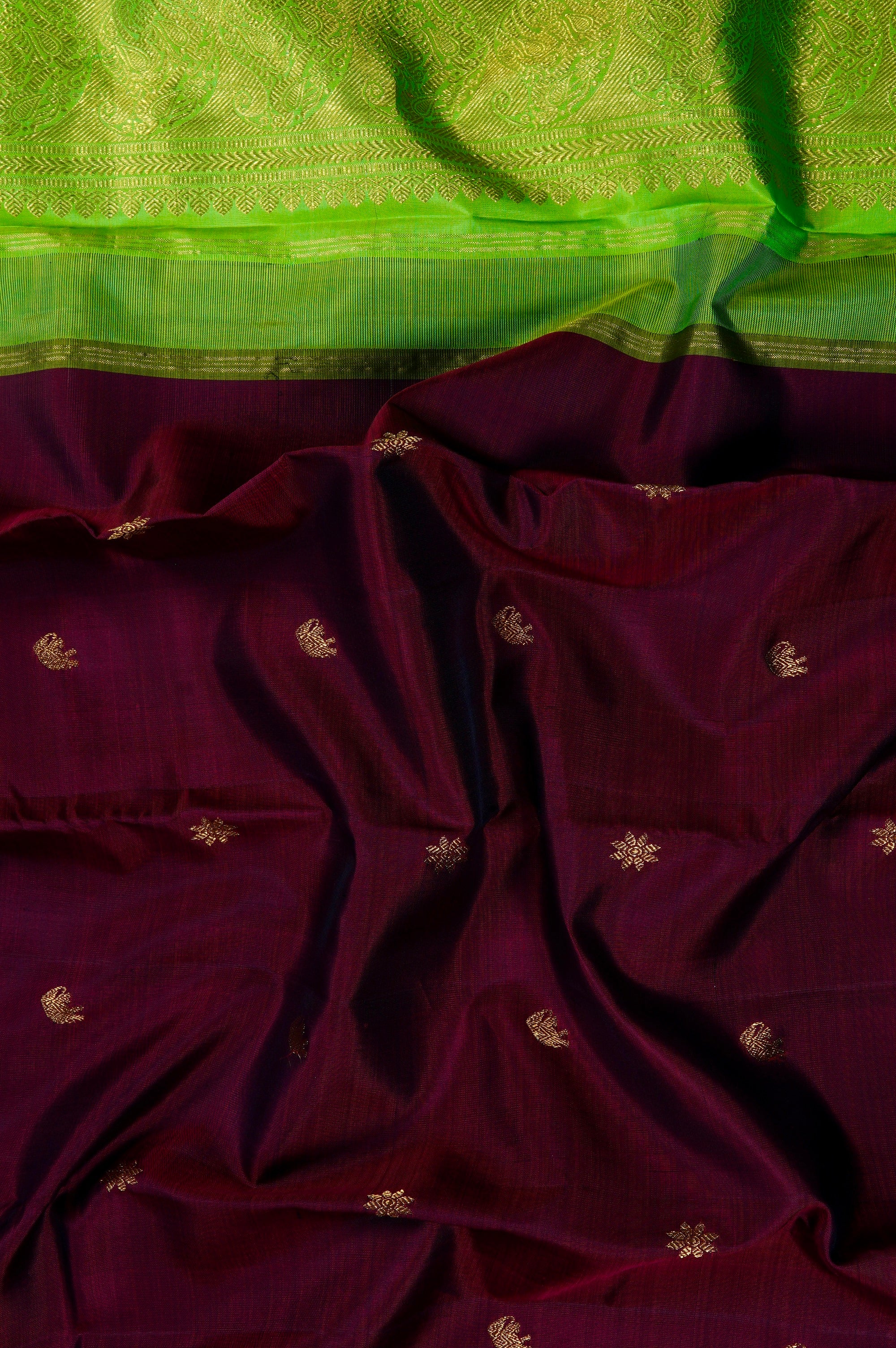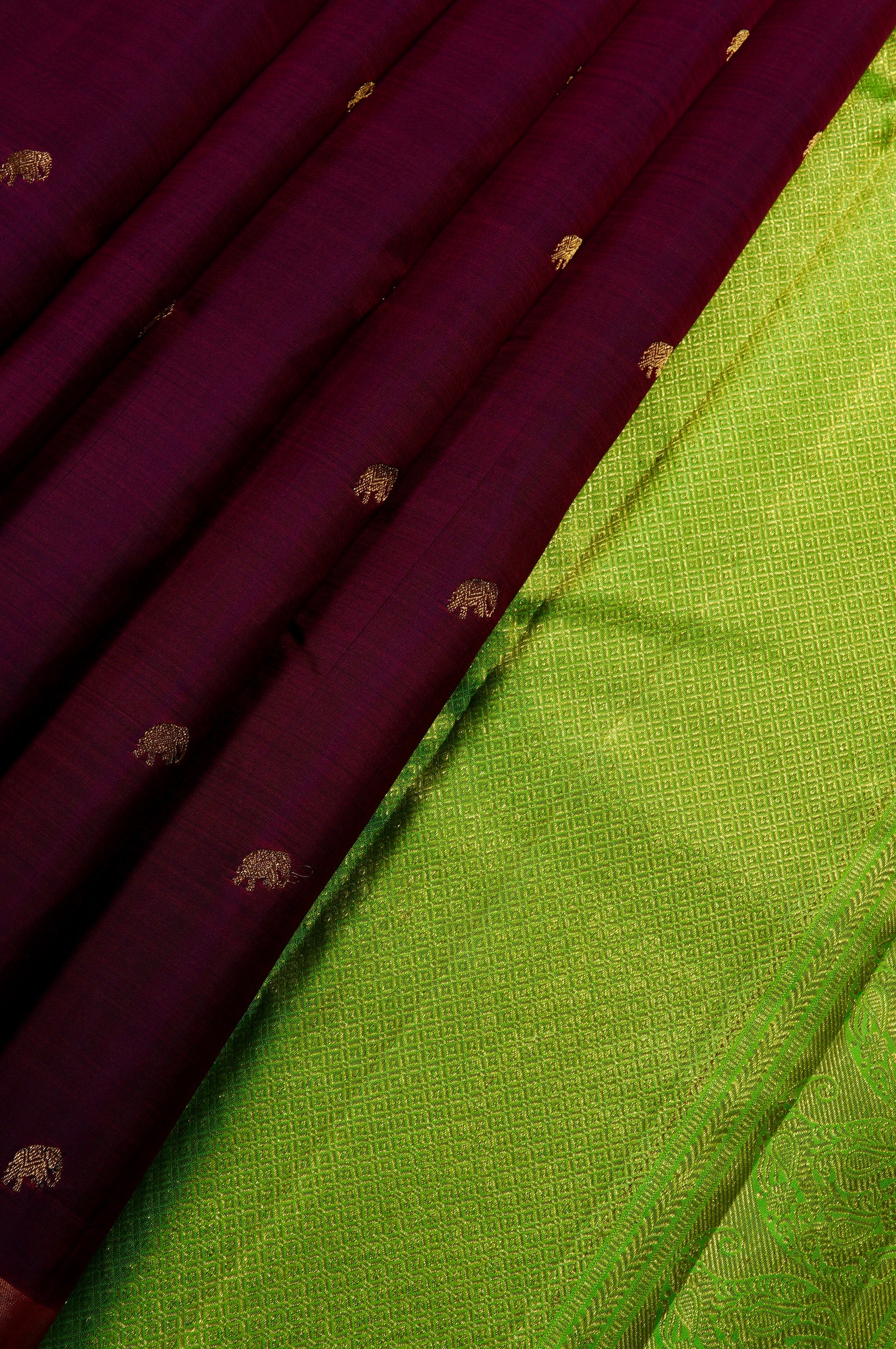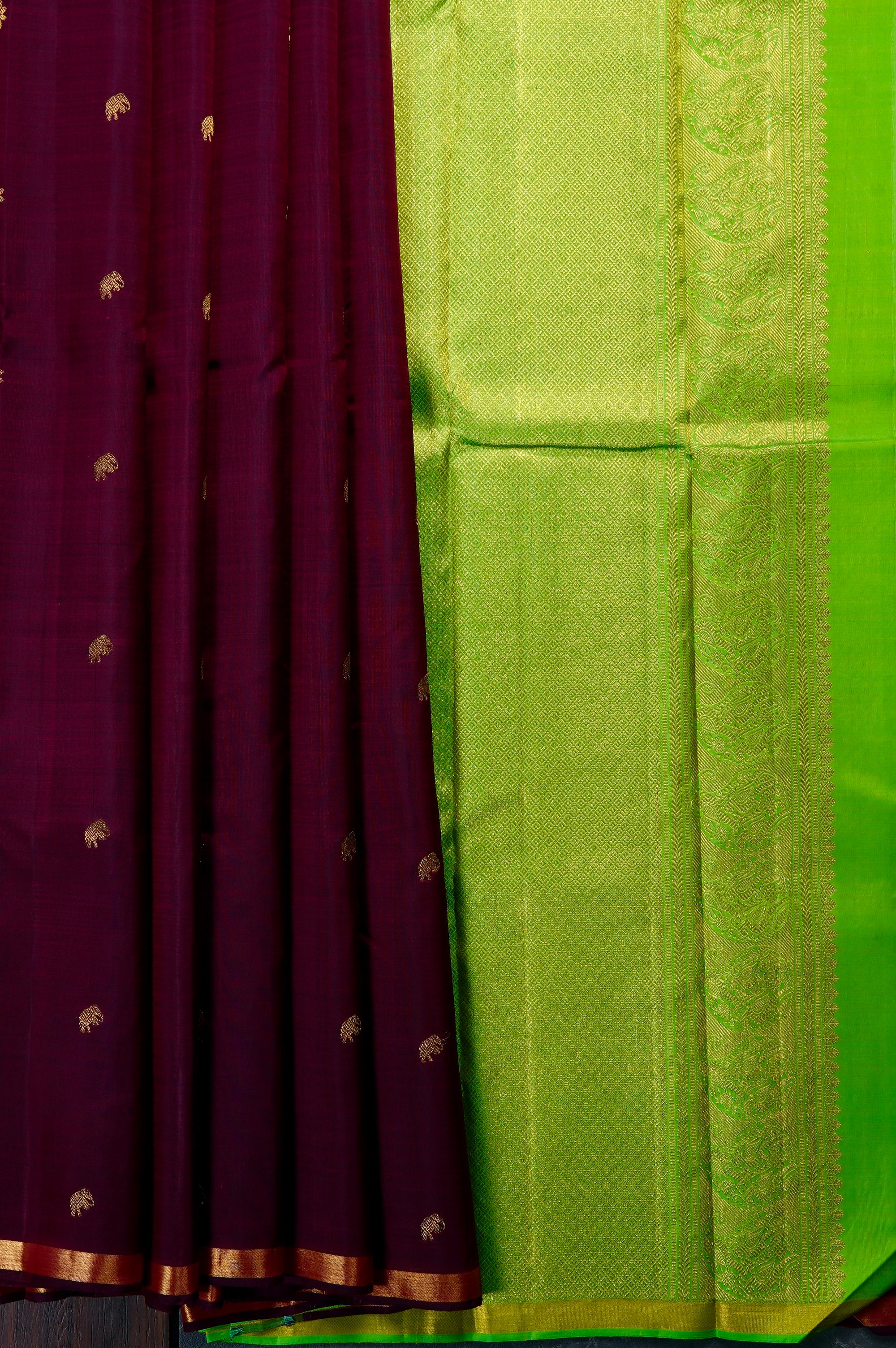 Make a bold, traditional statement with this exquisite Kanchipuram silk saree, an eye-catching masterpiece that balances a dramatic color contrast. The deep maroon-crimson body exudes meticulously adorned alternating gold zari floral and elephant bhuttas. It is framed by a simple band of gold zari. Elevating the design is a vibrant, contrasting parrot green pallu, intricately woven with a dense, shimmering gold zari brocade and framed by bold mango bhuttas motifs.