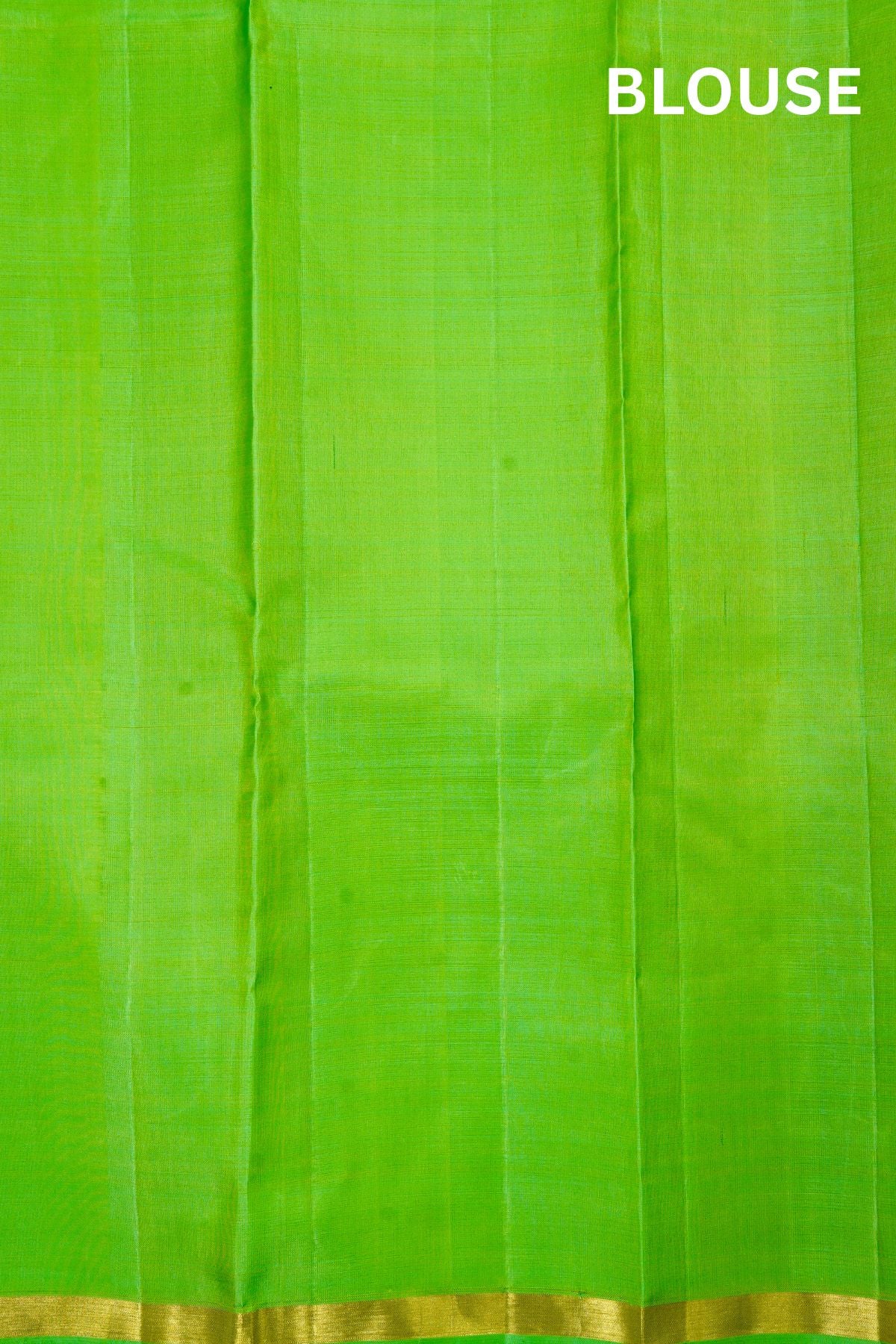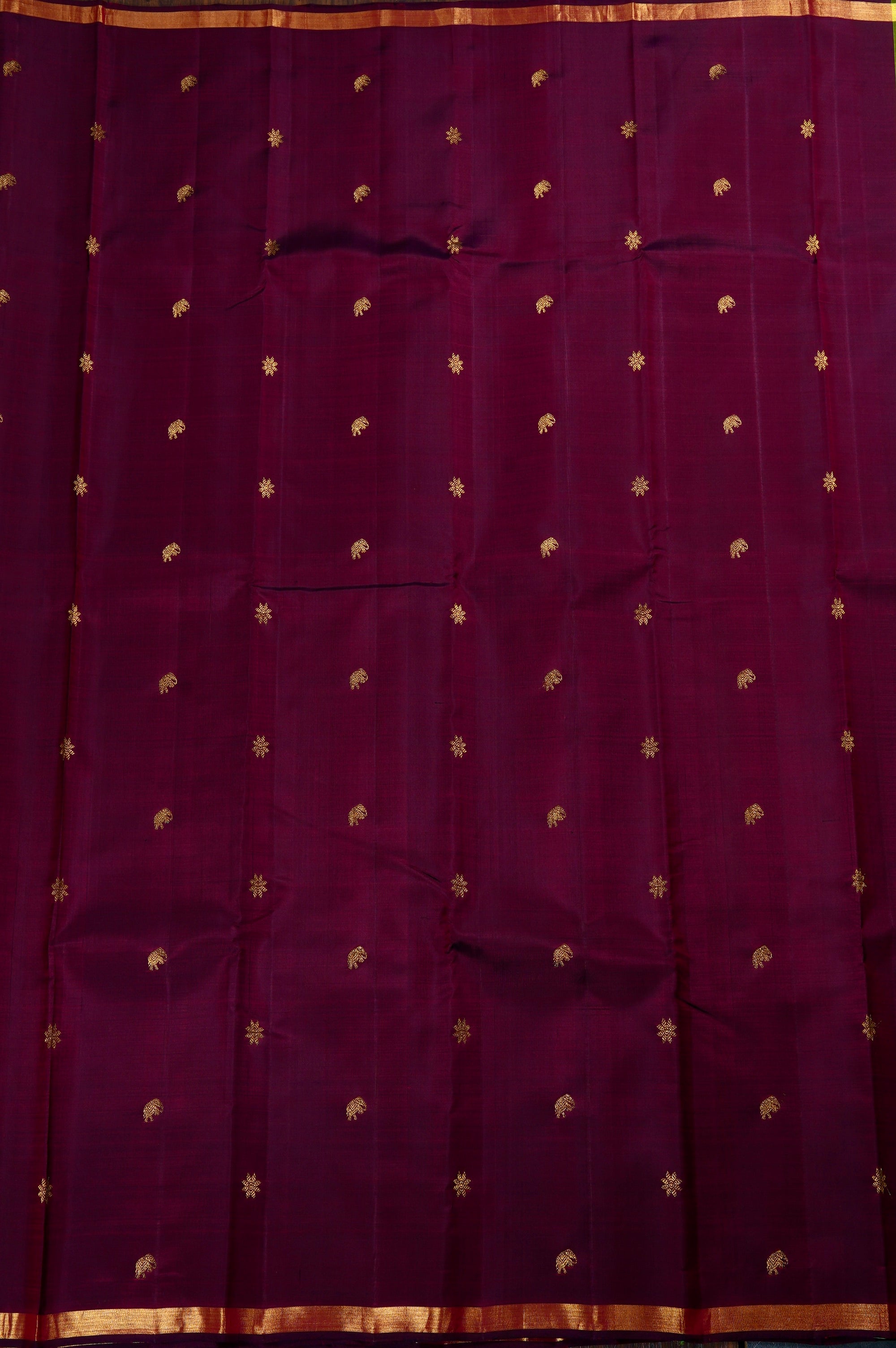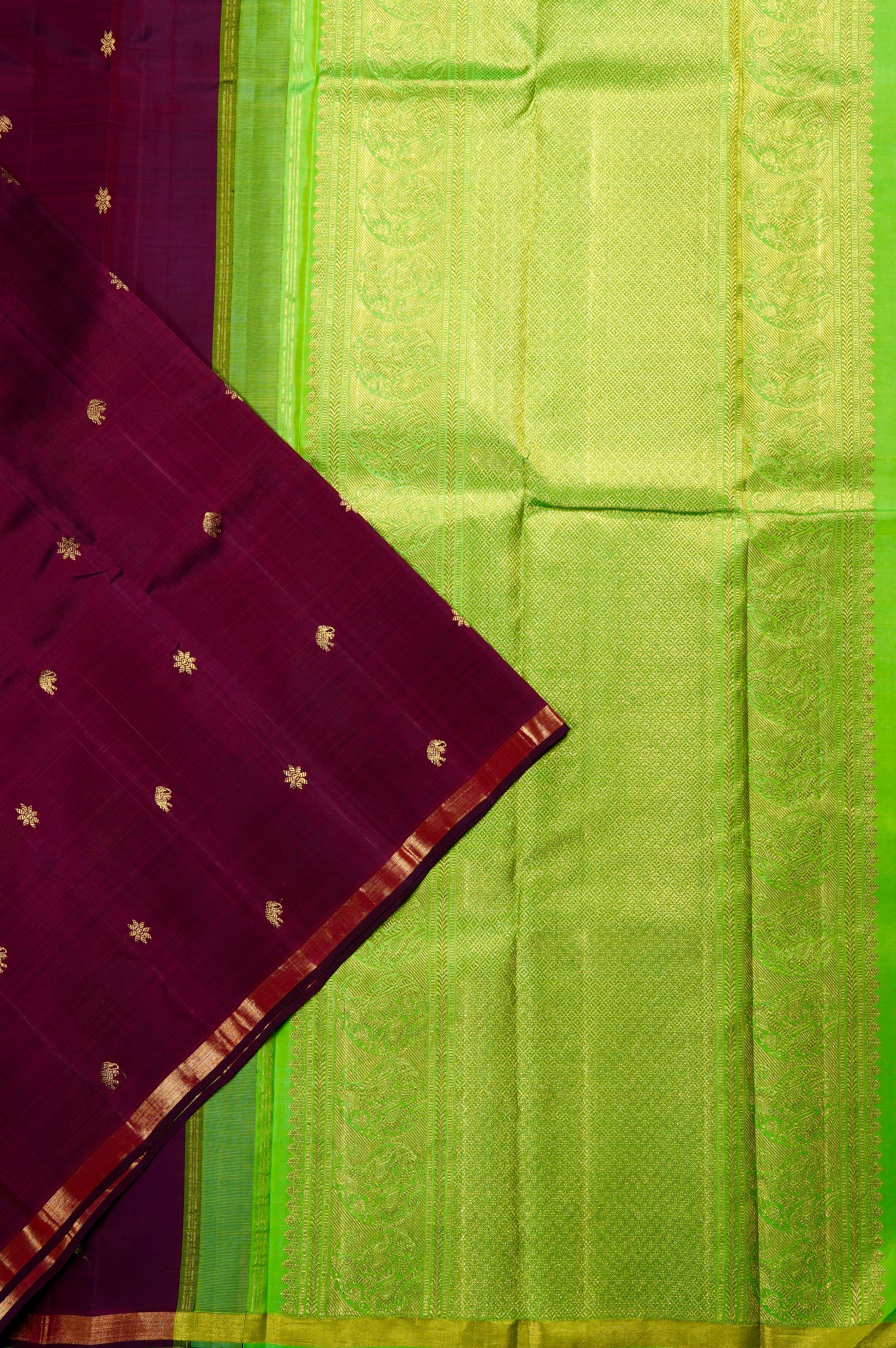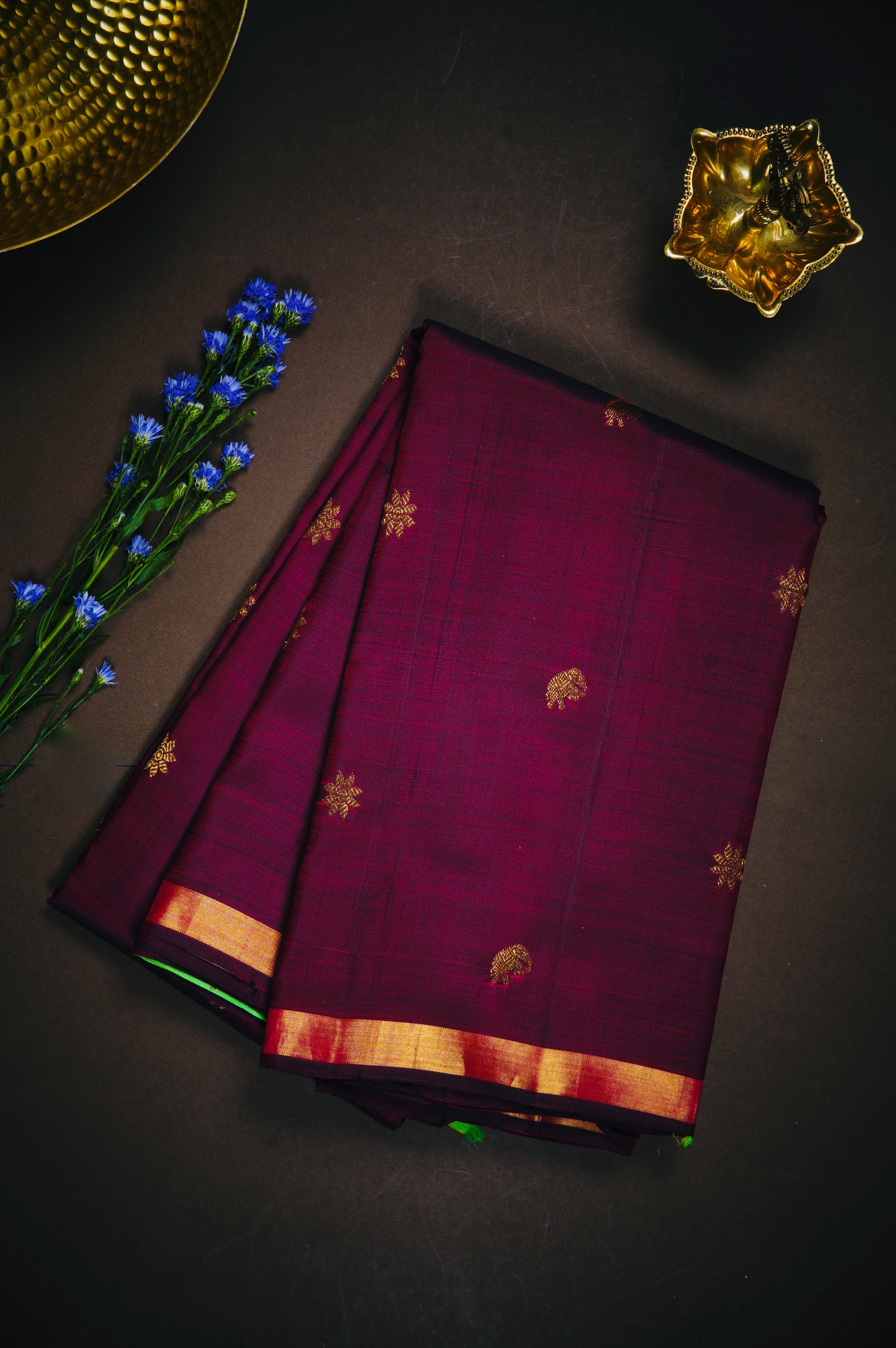 Make a bold, traditional statement with this exquisite Kanchipuram silk saree, an eye-catching masterpiece that balances a dramatic color contrast. The deep maroon-crimson body exudes meticulously adorned alternating gold zari floral and elephant bhuttas. It is framed by a simple band of gold zari. Elevating the design is a vibrant, contrasting parrot green pallu, intricately woven with a dense, shimmering gold zari brocade and framed by bold mango bhuttas motifs.