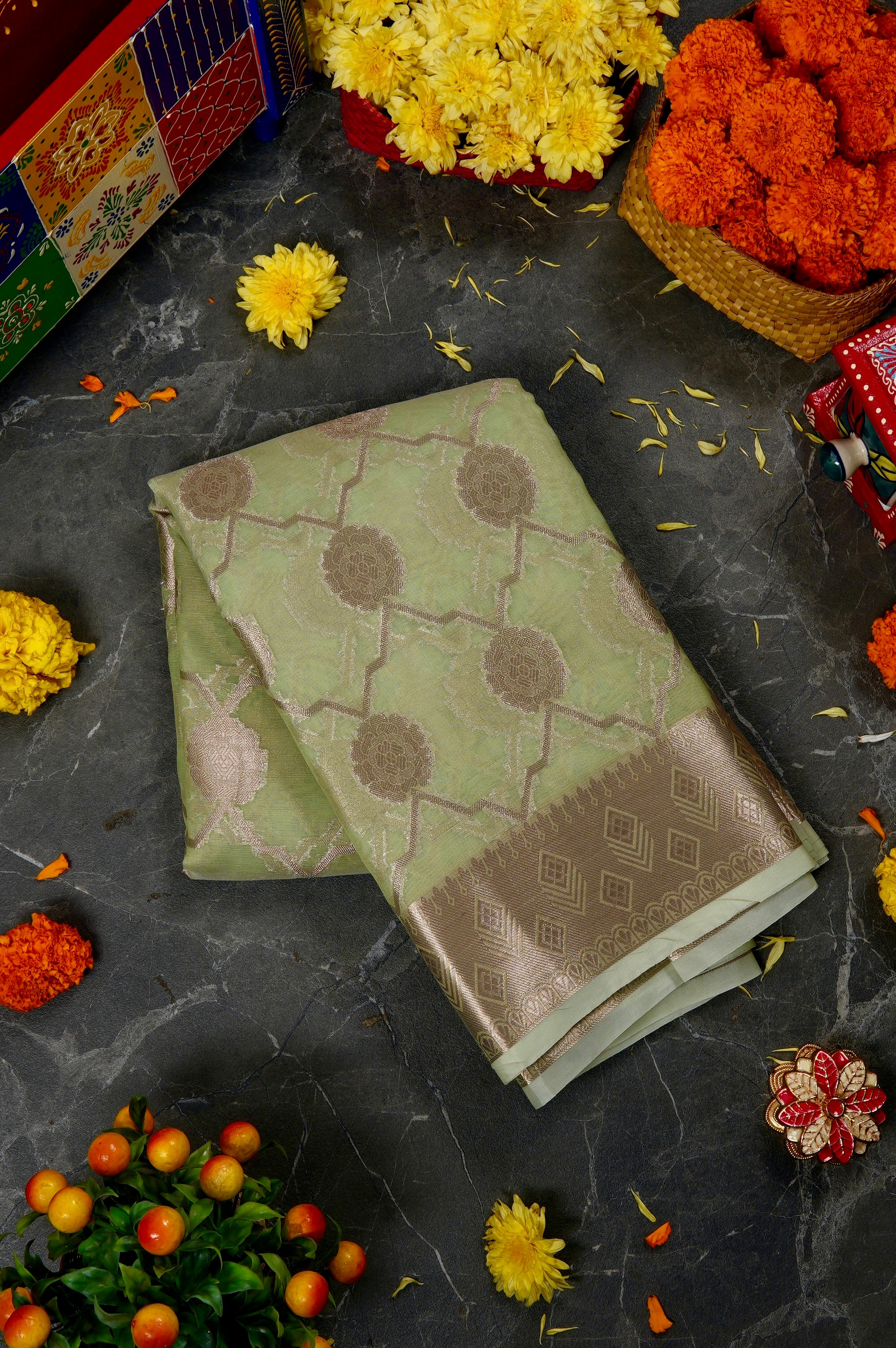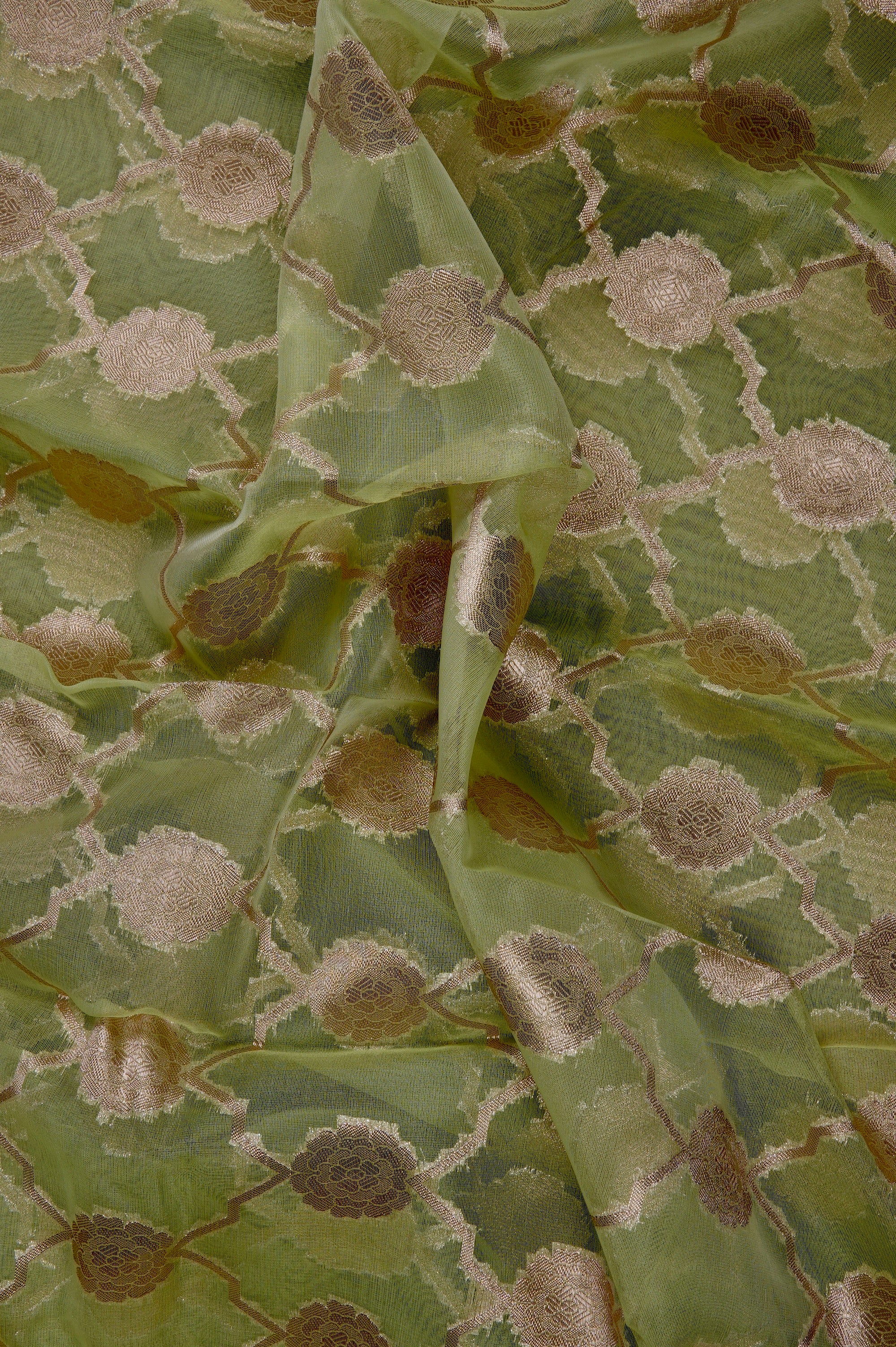 Moss green organza saree with stylised diamond grids woven with broad flowers with bold petals on their ends in gold zari, with a border that has a zari base and stacked up diamond motifs. The pallu has a wide band of zari filled with small diamond motifs with one end extended, resembling a manta ray. The saree has a zari blouse blouse filled with small diamond-grid motifs.