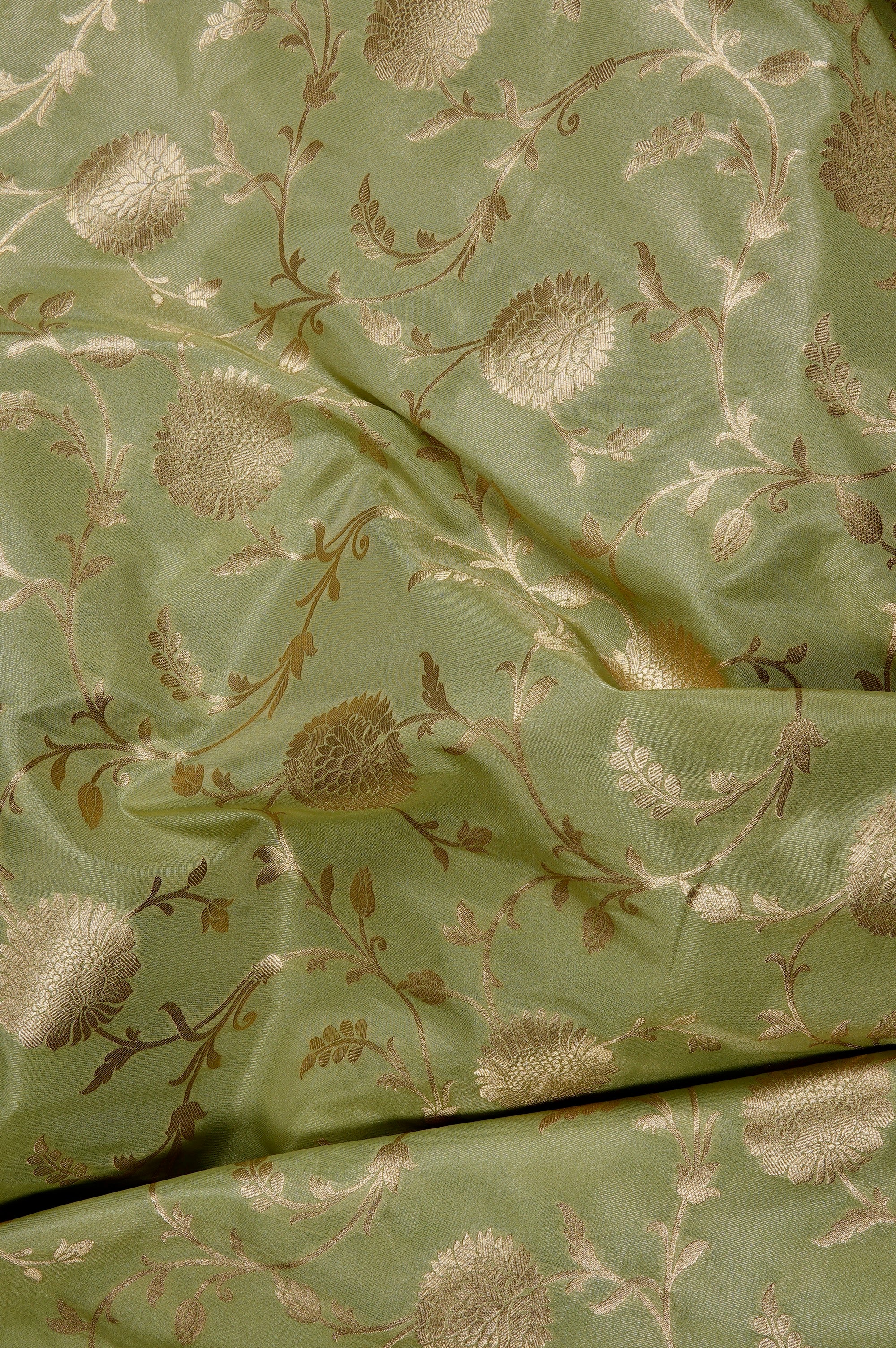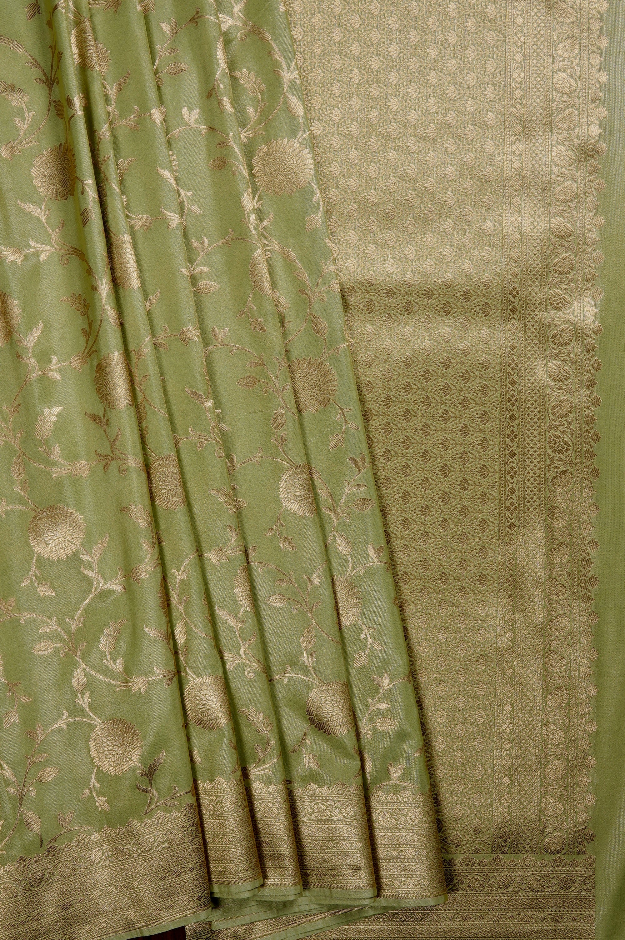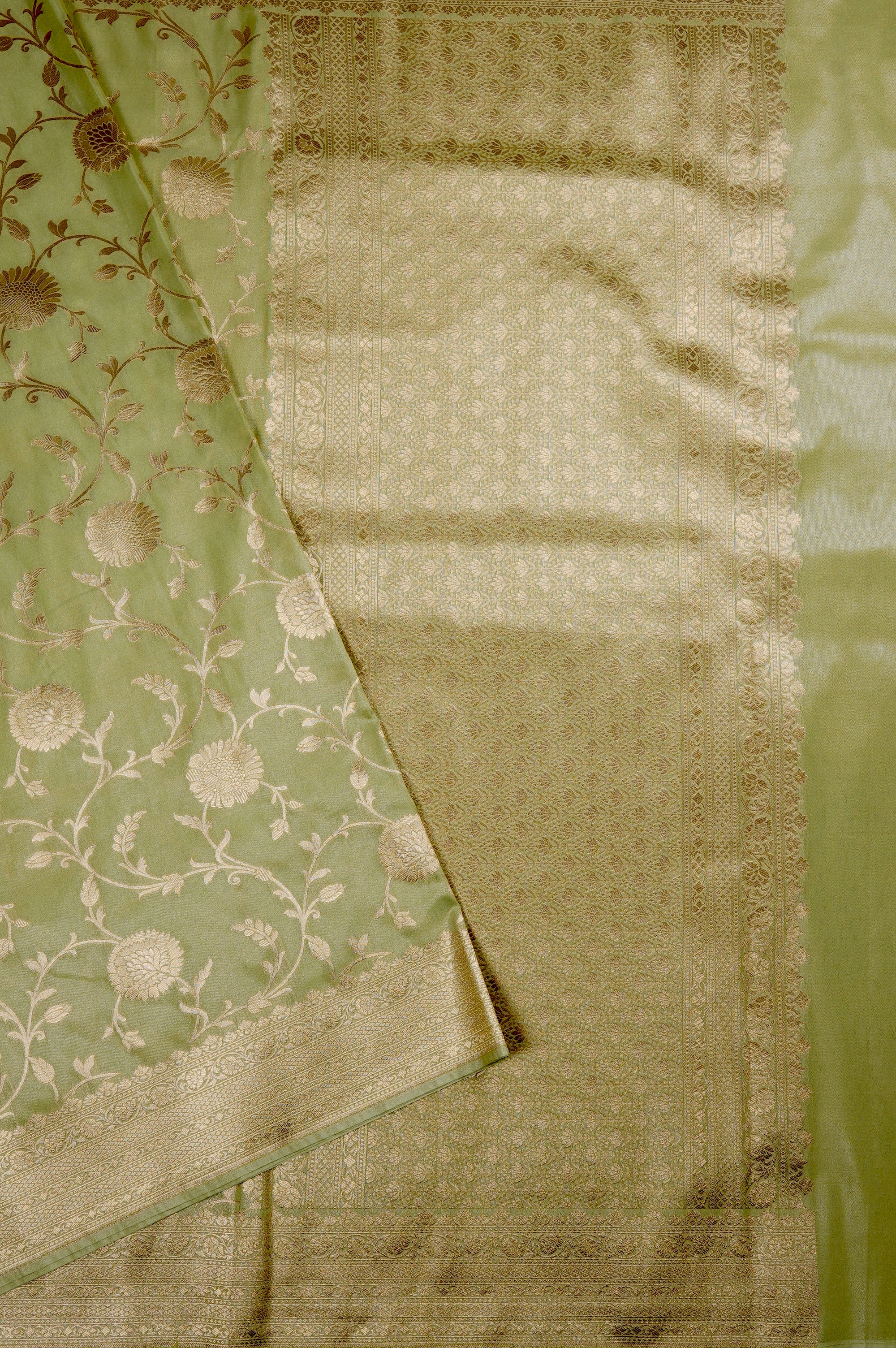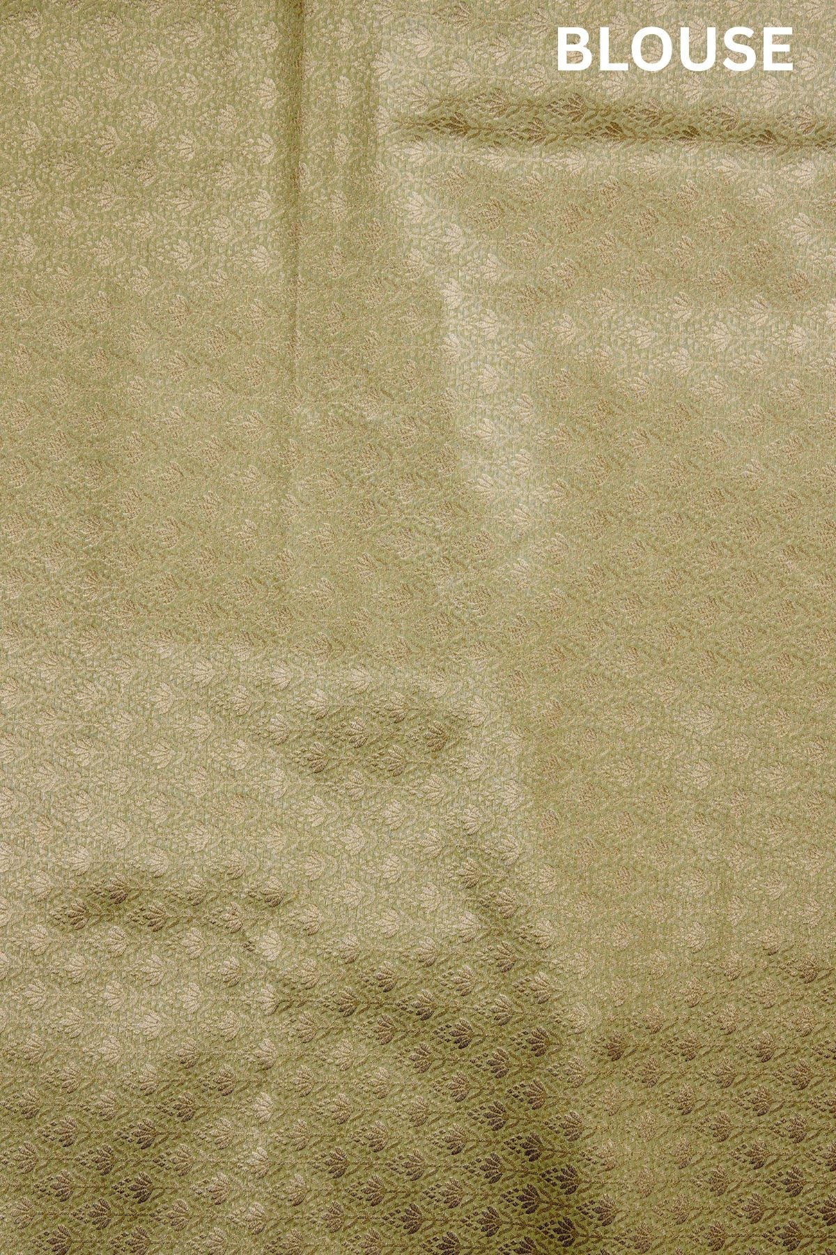 Moss green semi tussar saree with broad vines woven with elegant flowers looking like dandelions with bold petals woven in gold zari, with a border that has a series of traditional patterns including Kodi and diamond grid patterns woven in gold zari. The pallu is rich with recurring floral motifs forming an arranged floral pattern, bordered by bands of smaller motifs woven in gold zari. The saree has a moss green blouse filled with lotus like floral motifs woven in gold zari.