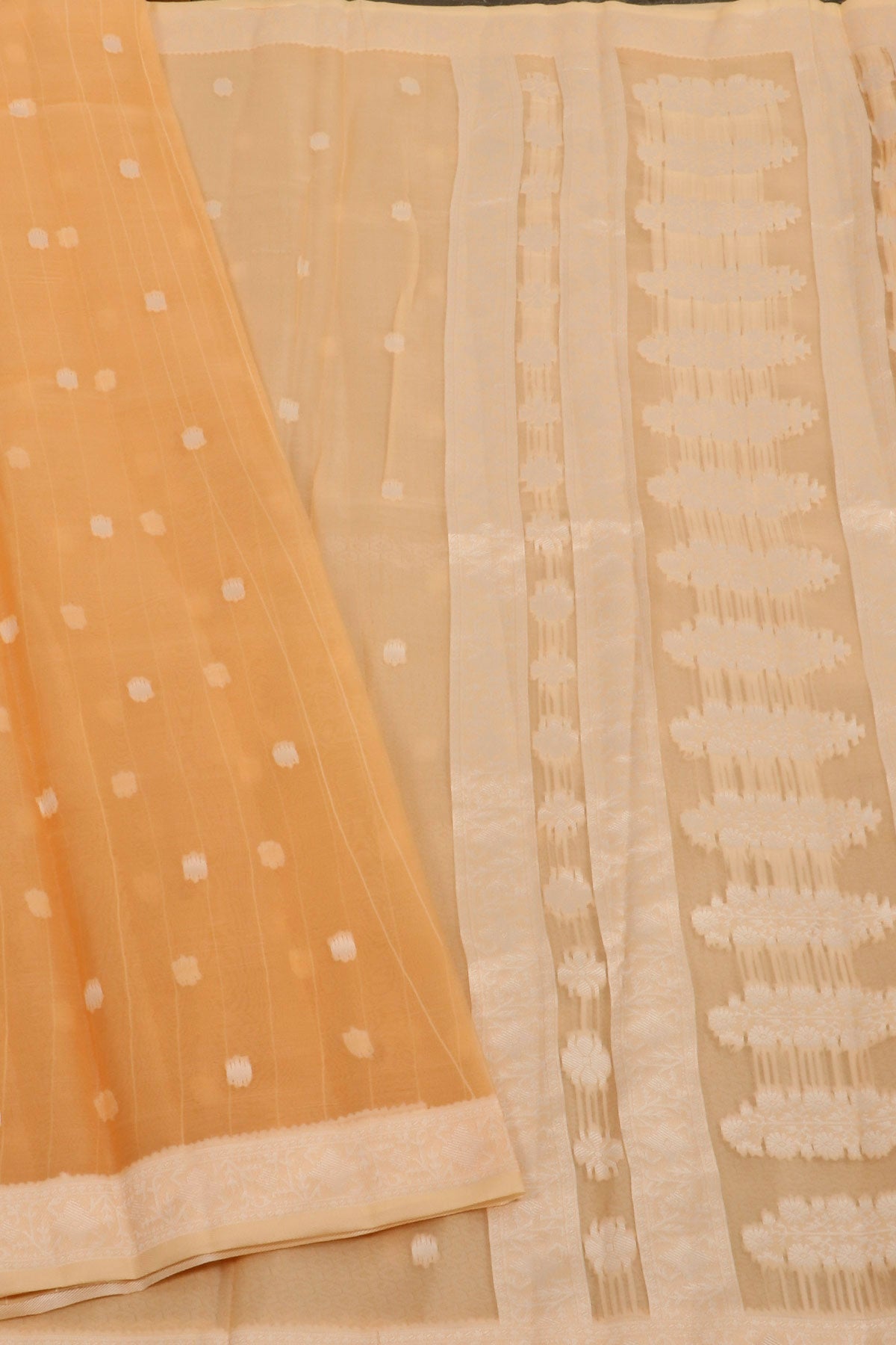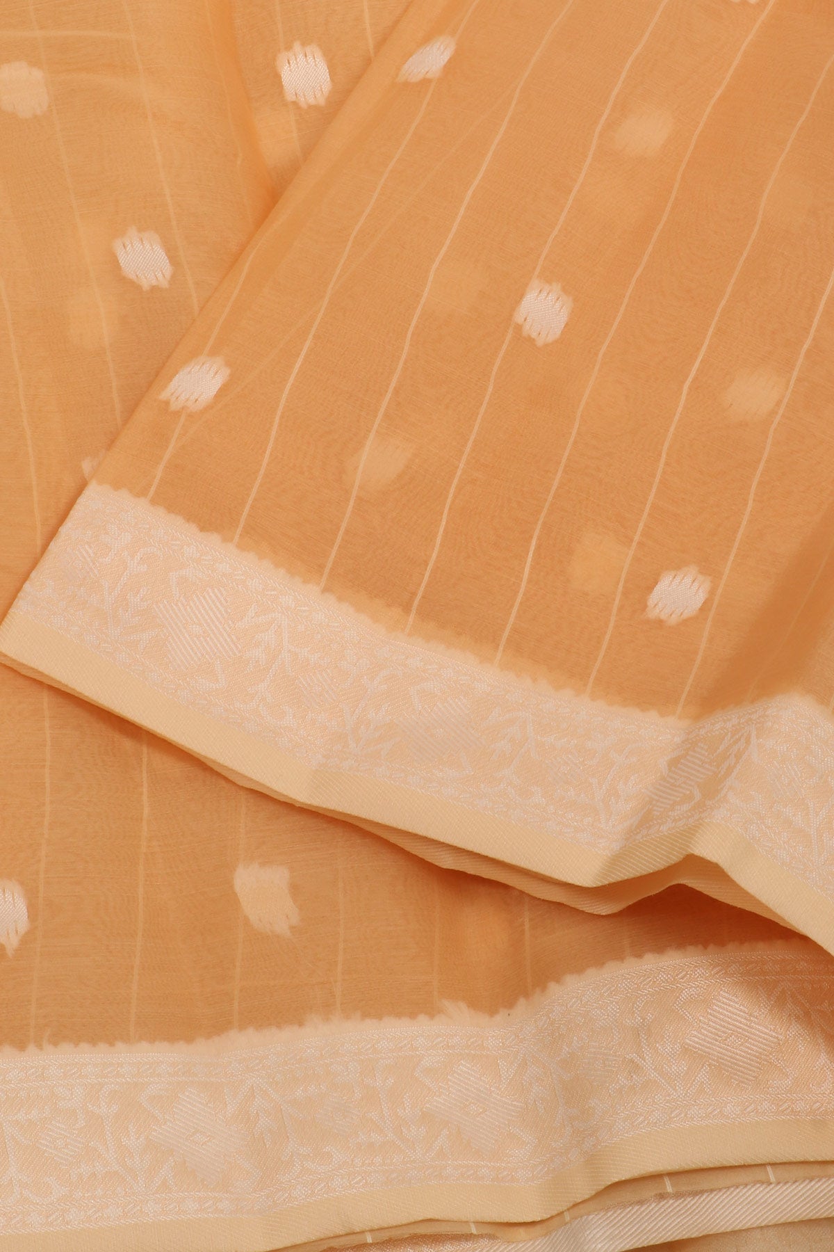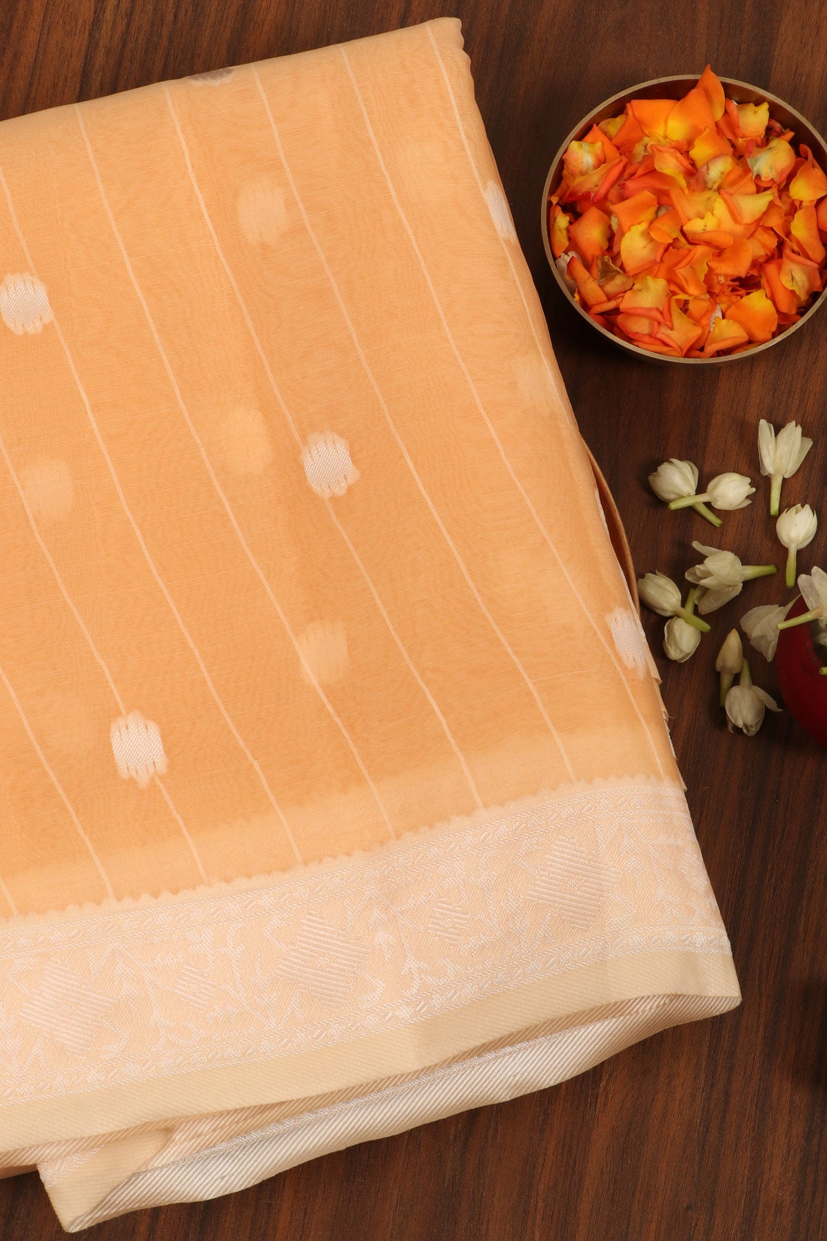 Muskmelon orange semi organza saree with a "self" border in silver zari. The body carries striped patterns in threads.