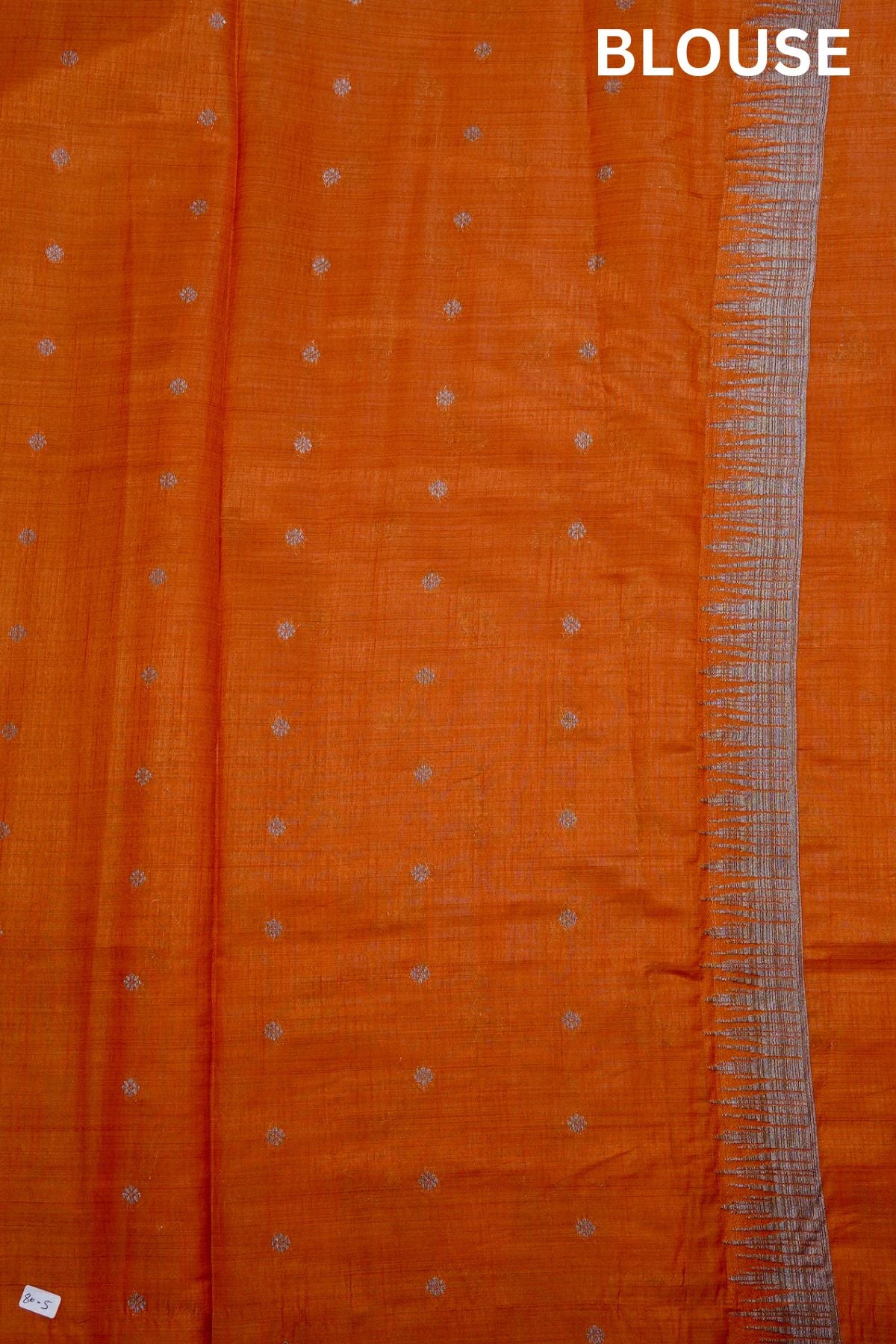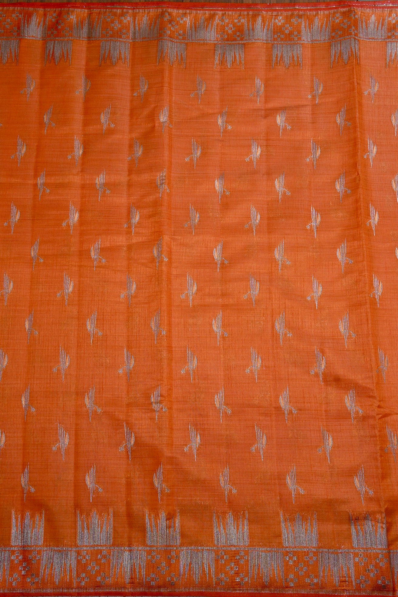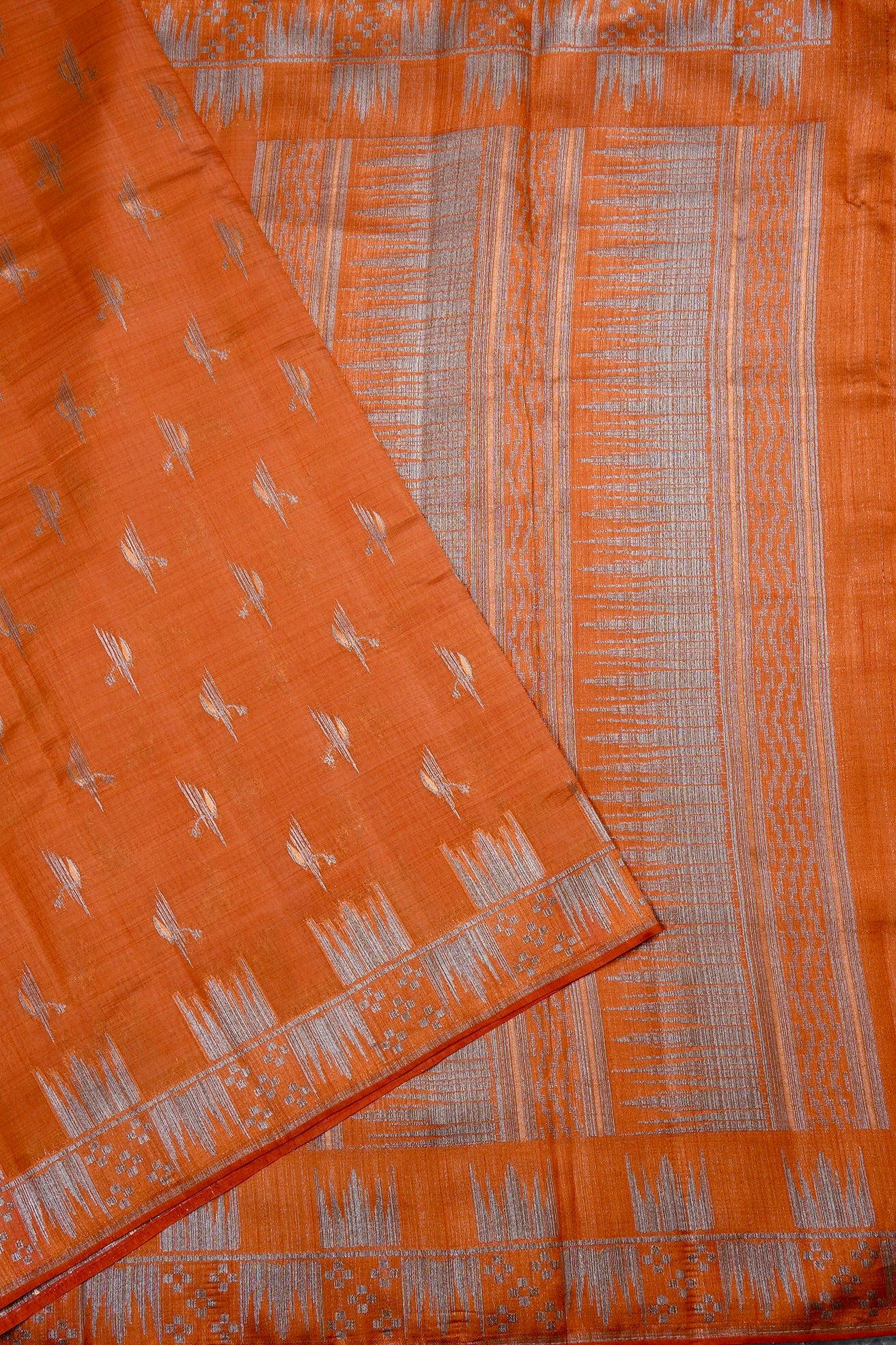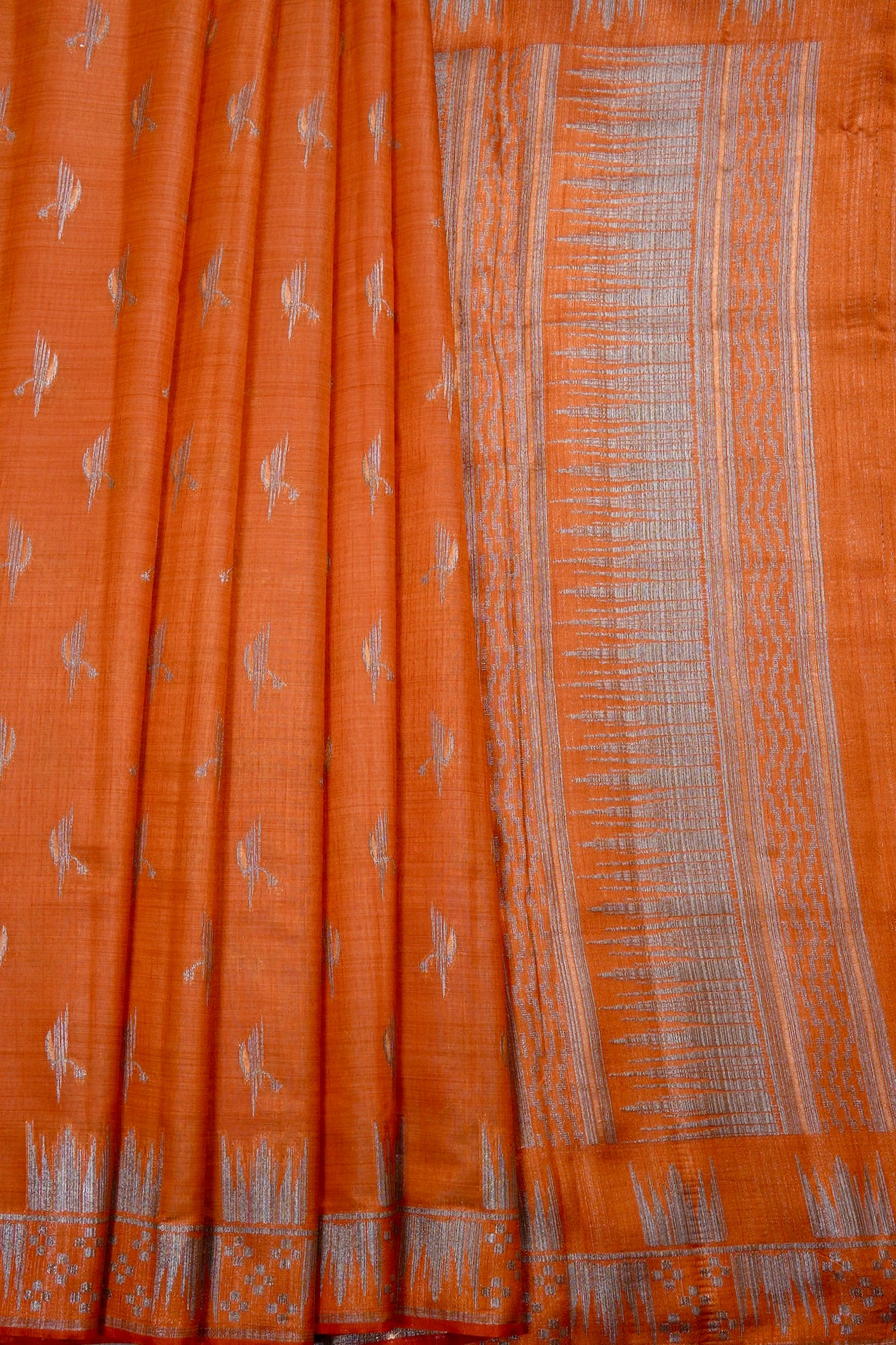 A vibrant orange semi-tussar saree featuring a delicate scattered pattern of silver zari leaf-like motifs across the body. The border is defined by a bold, silver zari panel showcasing abstract geometric designs, accented with a serrated trim. The pallu is a striking showcase of intricate silver zari work, filled with dense horizontal bands of geometric and linear patterns. Completing the look is a matching orange blouse adorned with fine silver floral buttas and a coordinated serrated border.