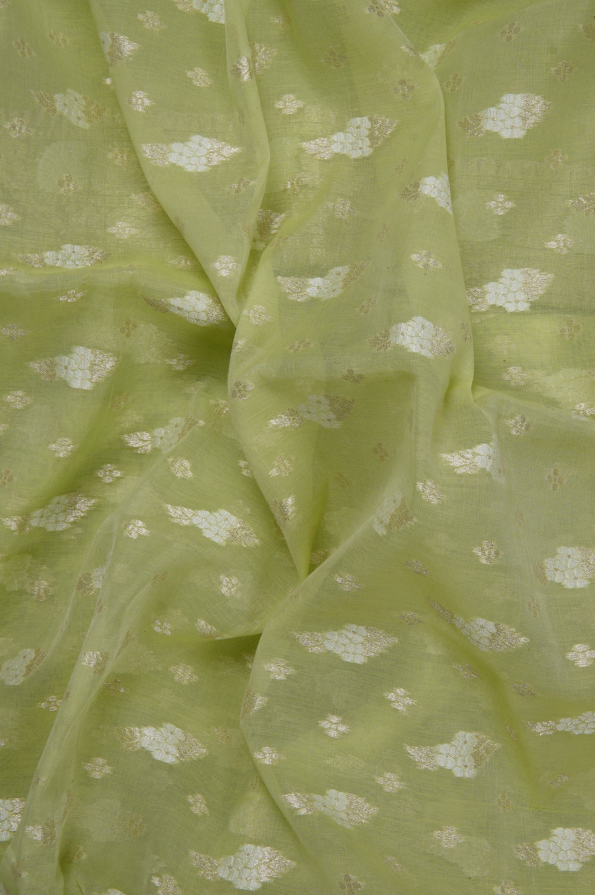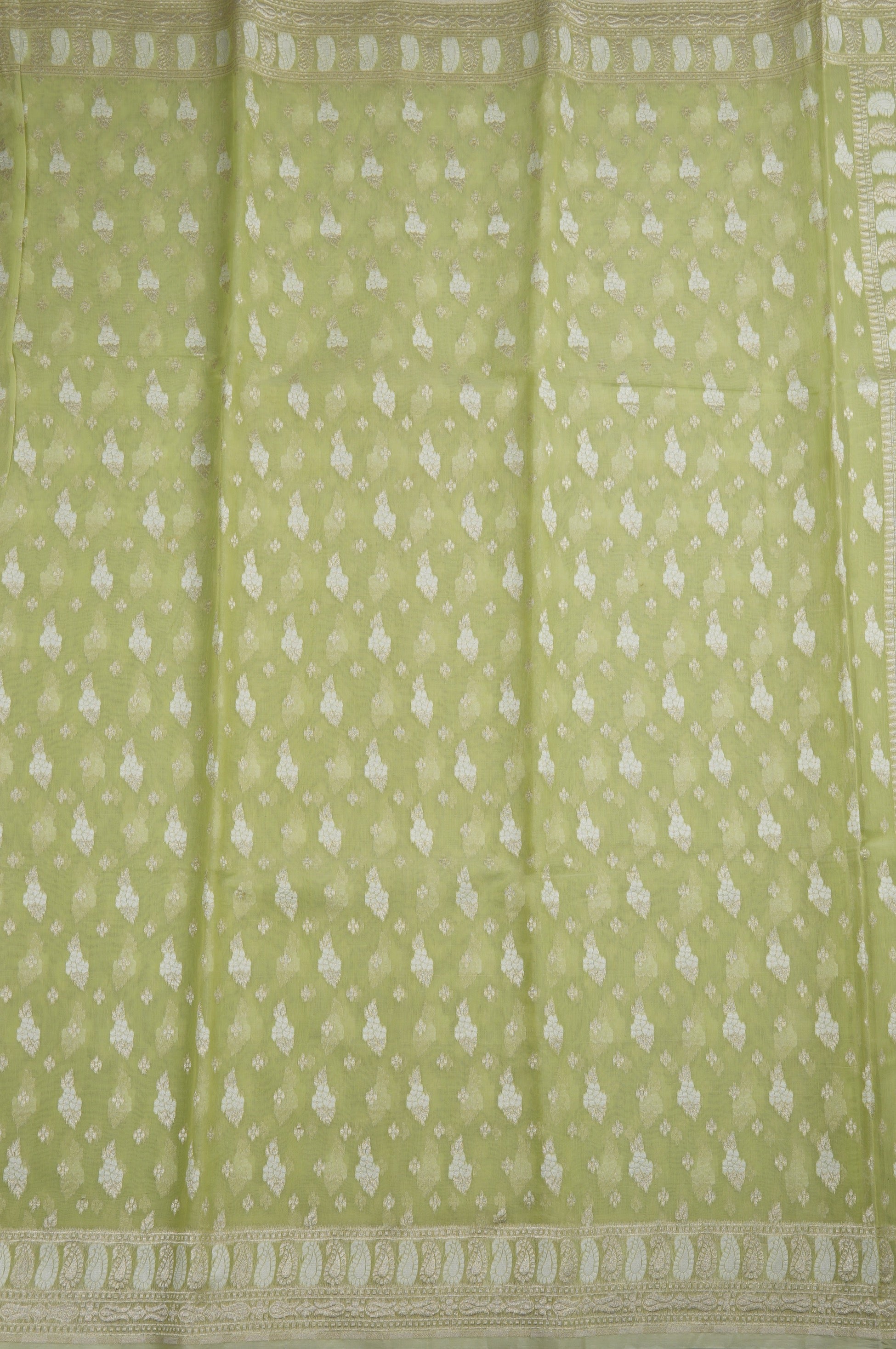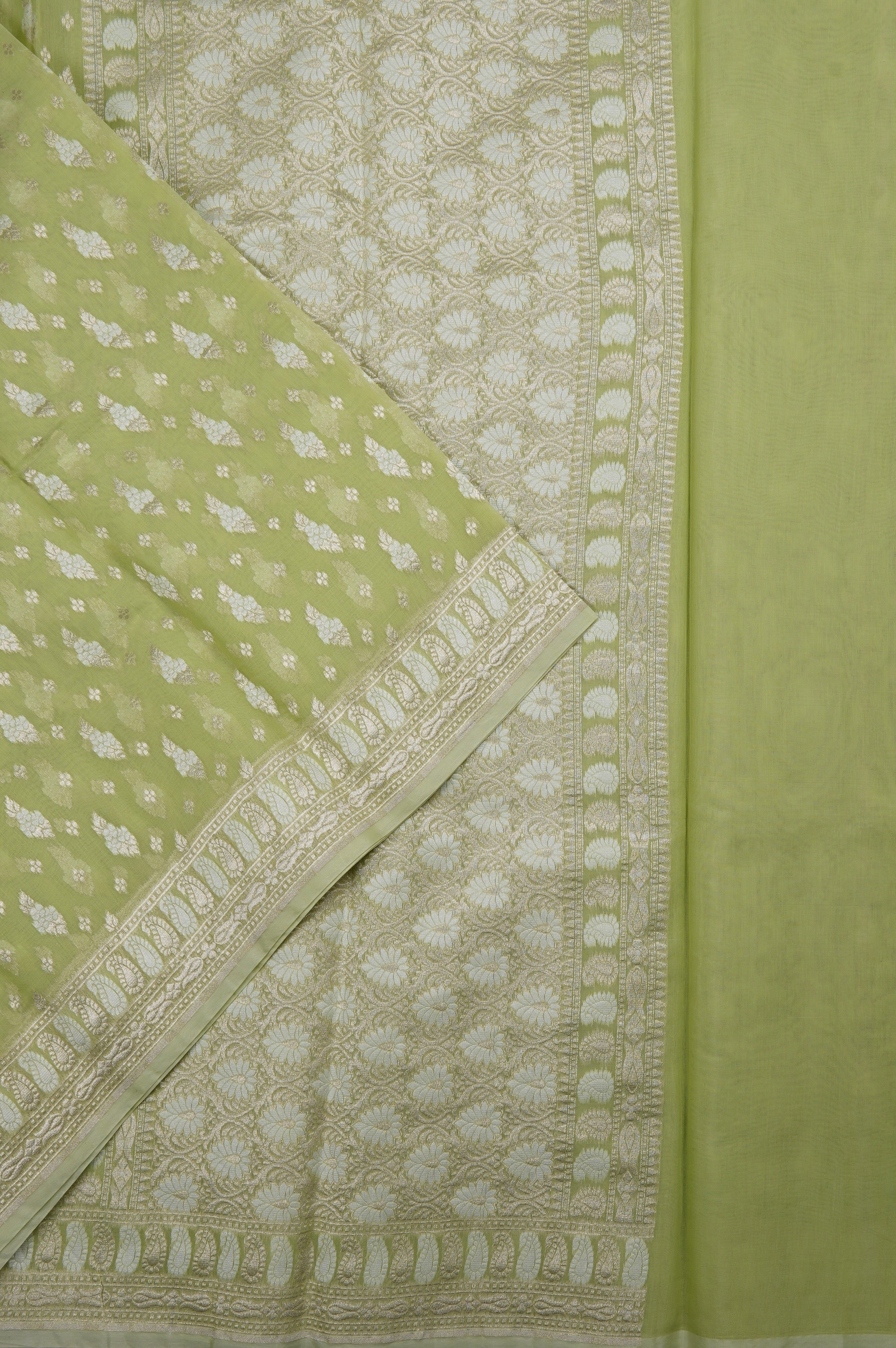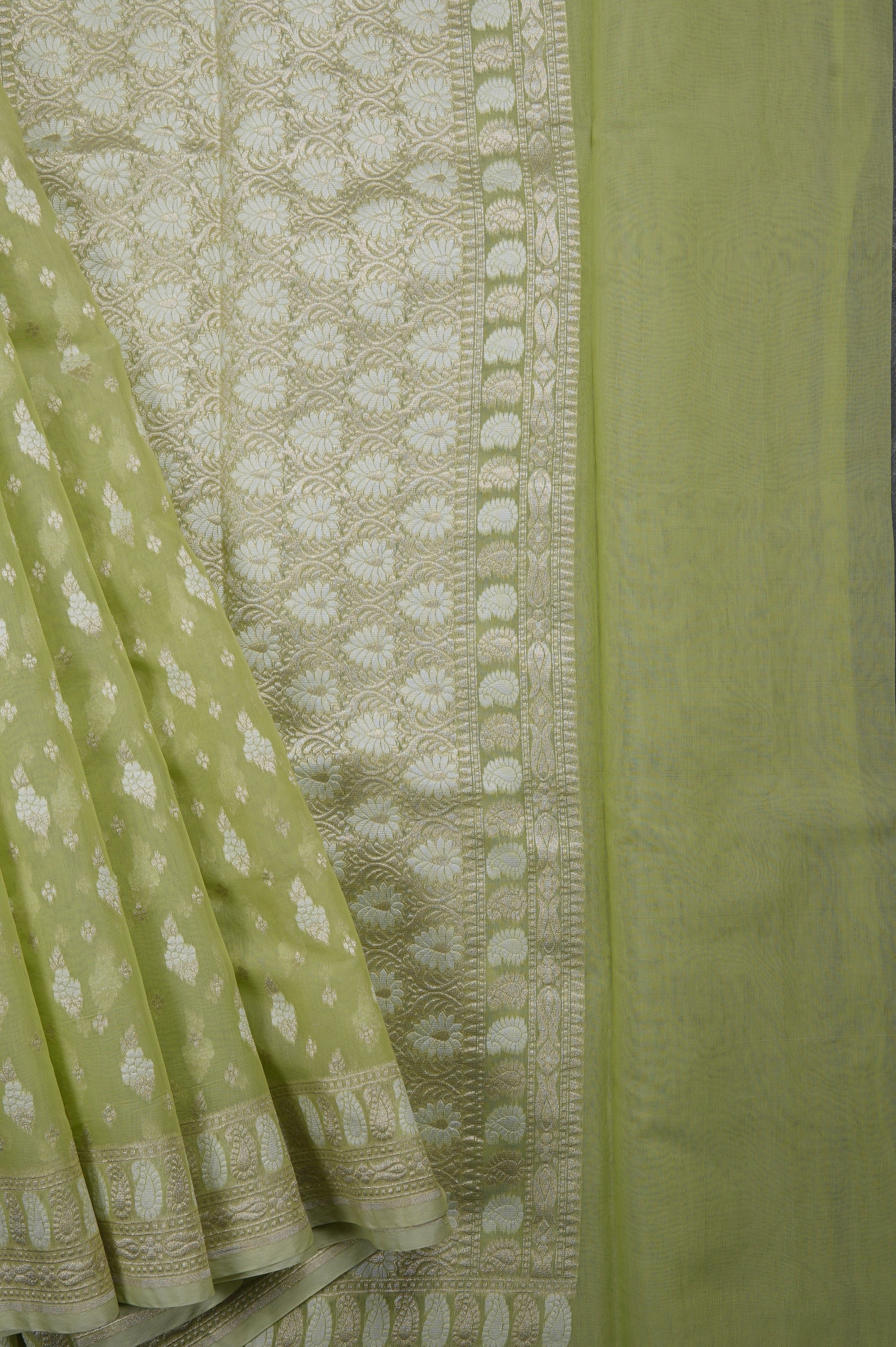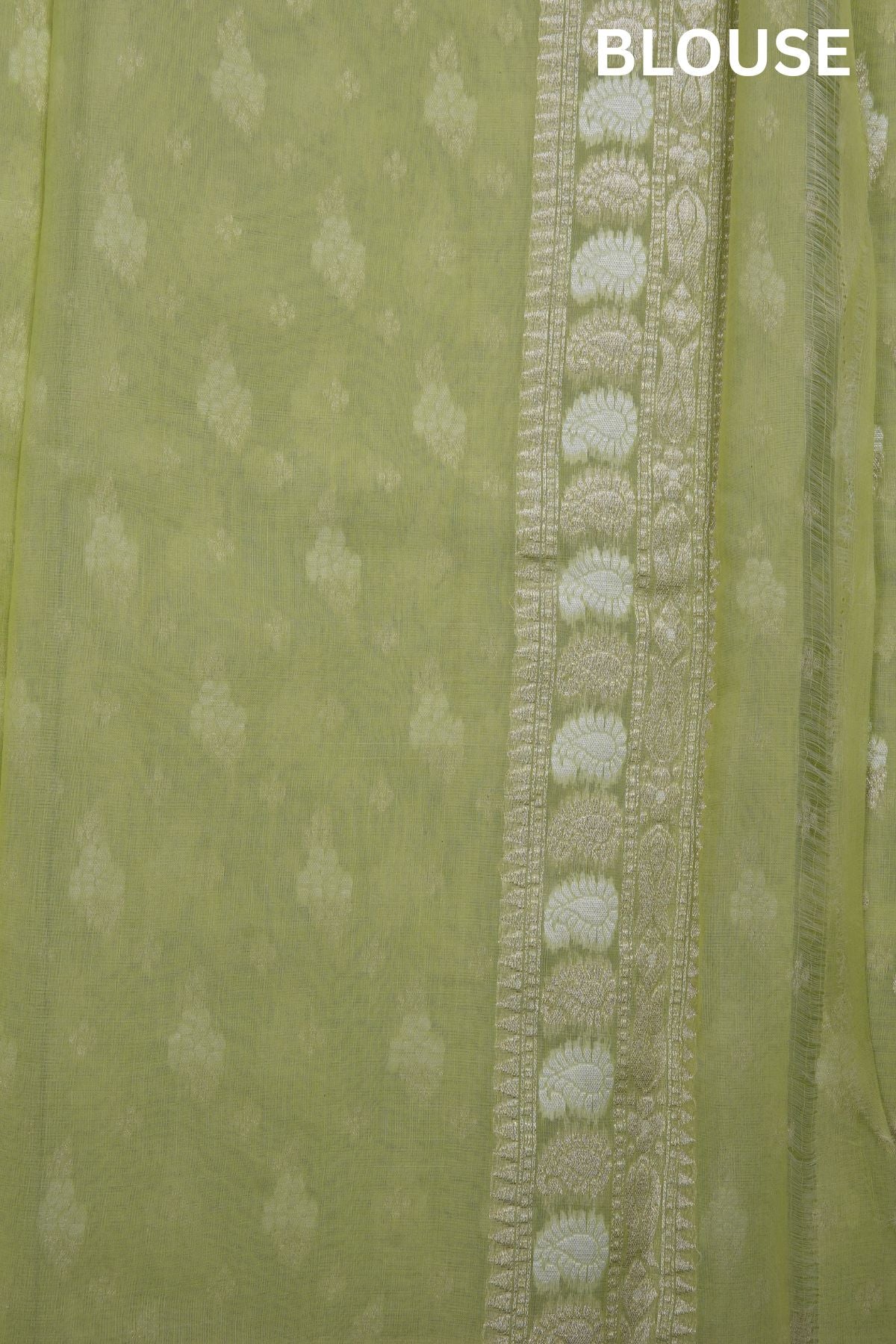 Pale green semi silk cotton saree with grouped florals and smaller flower motifs woven in silver zari throughout the body. The border is a series of mango bhuttas alternating in negative and positive spaces woven in silver zari. The pallu is a wide expanse of small petal like flower motifs amidst bold floral vines woven in silver zari. The saree has a solid pale green blouse with the same border.