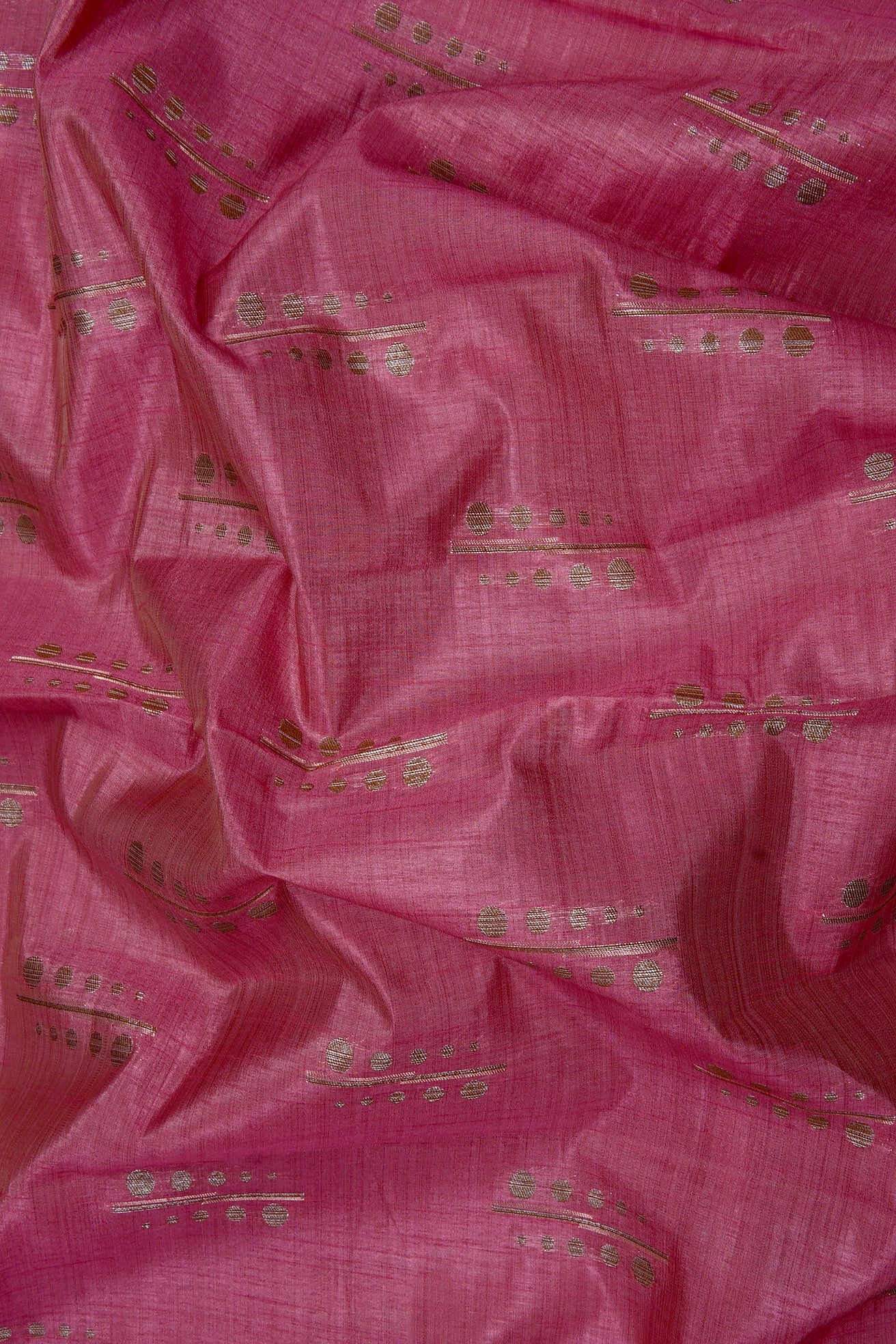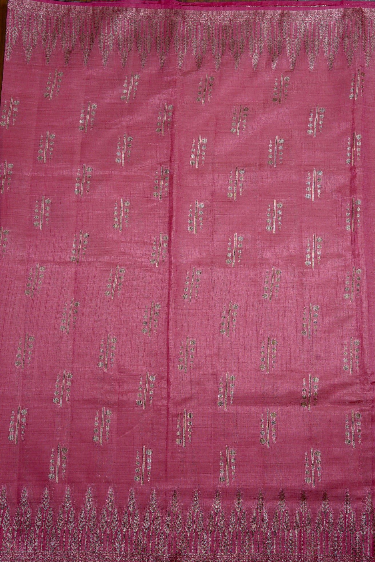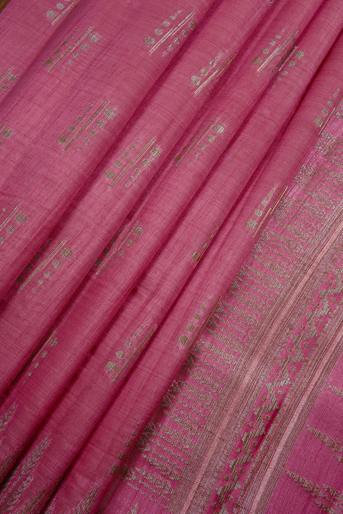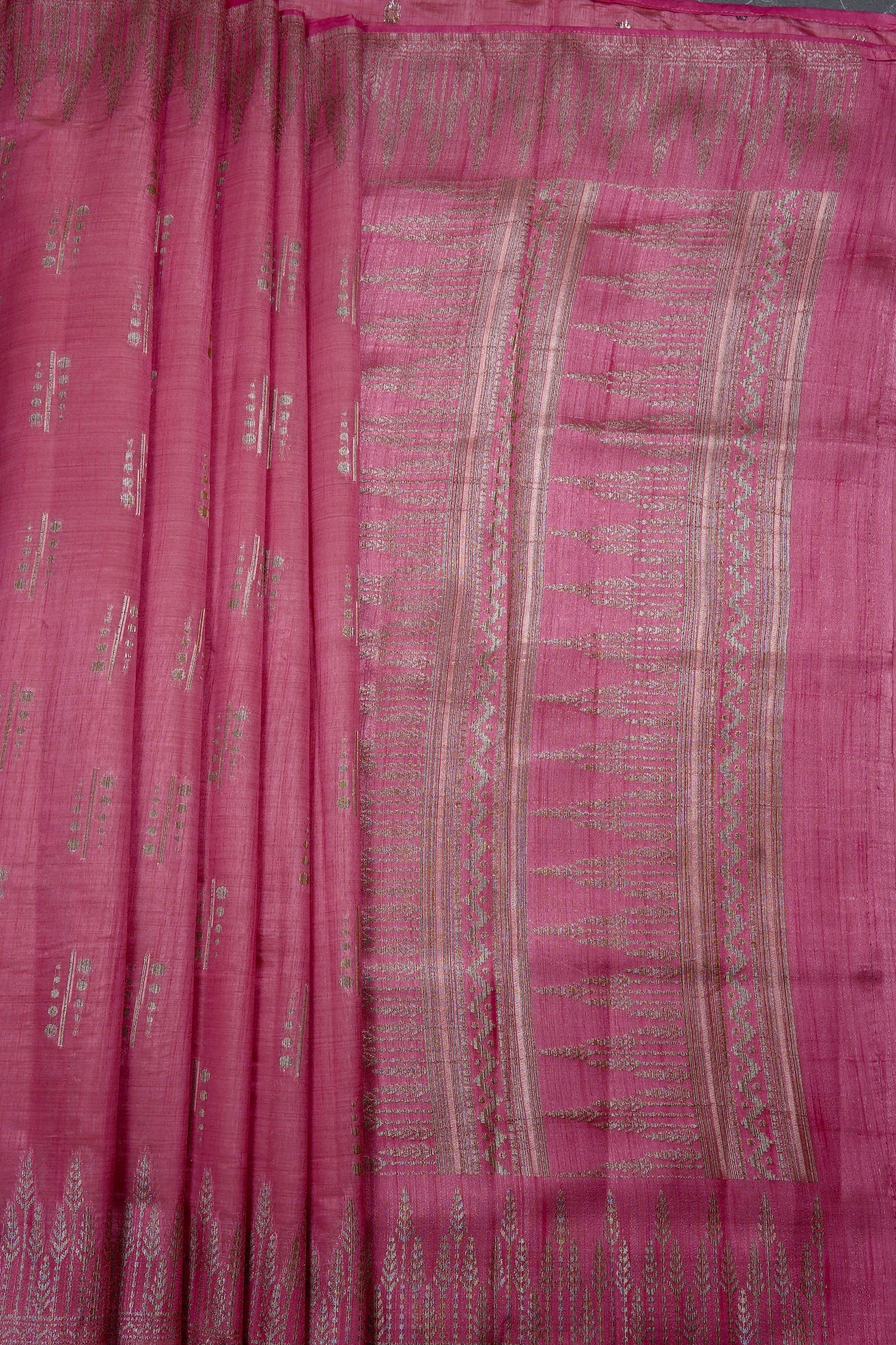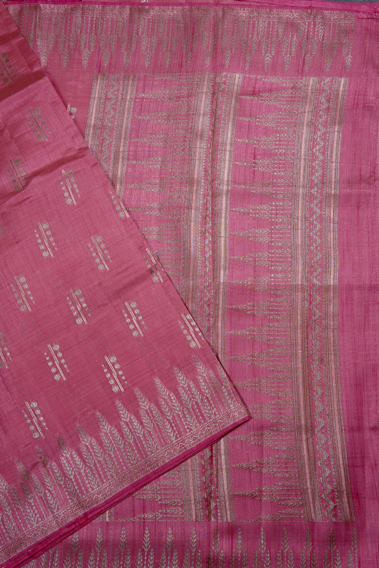 This elegant pink semi tussar saree features a body adorned with contemporary silver zari linear and circular bhuttas, framed by contemporary plant-like silver zari border. The pallu is rich and elaborate, showcasing dense horizontal bands of geometric foliage patterns in silver thread. The saree has a matching pink blouse featuring delicate zari flowers and a coordinated border.