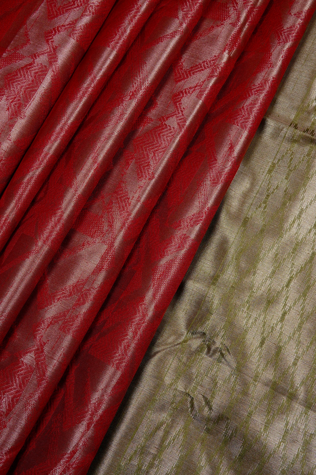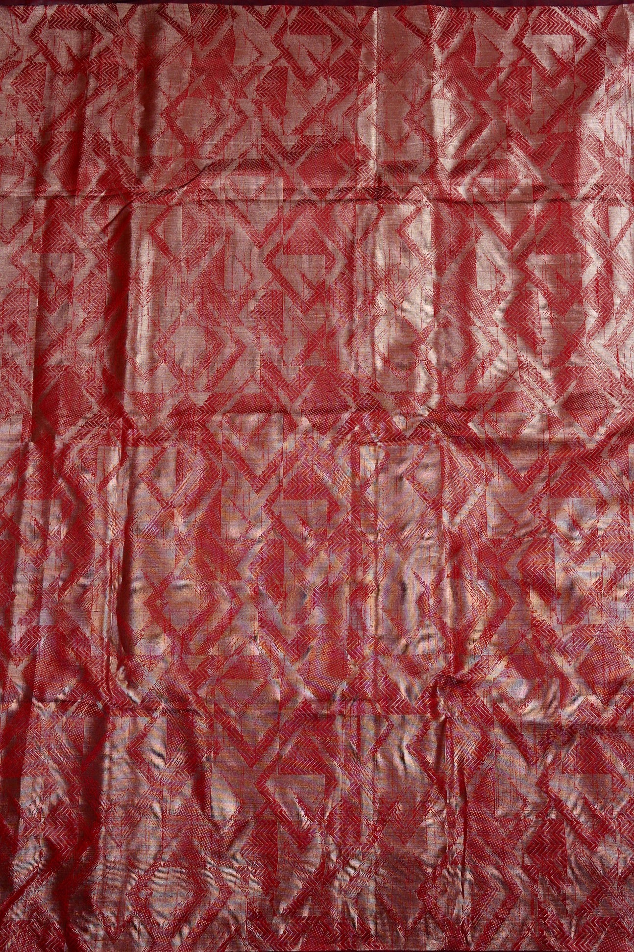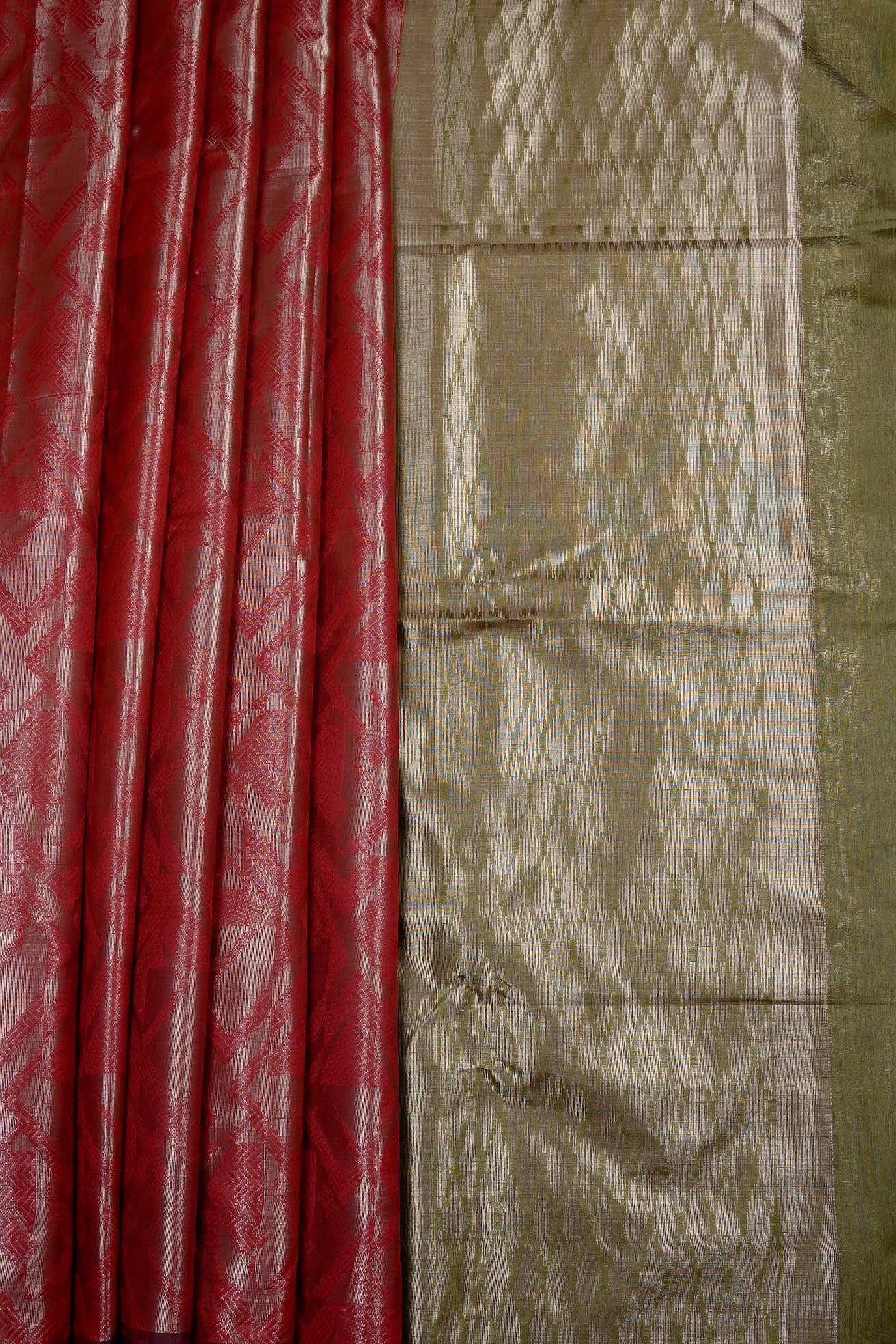 A red semi tussar saree featuring a modern, all-over body of abstract geometric diamond patterns woven in silver zari. The pallu transitions into a bold display of dense diamond-weave panels in shimmering silver on a green base. The look is completed by a green blouse adorned with an intricate honeycomb weave.