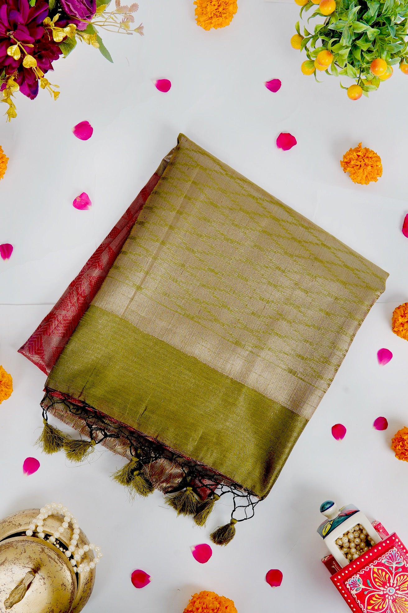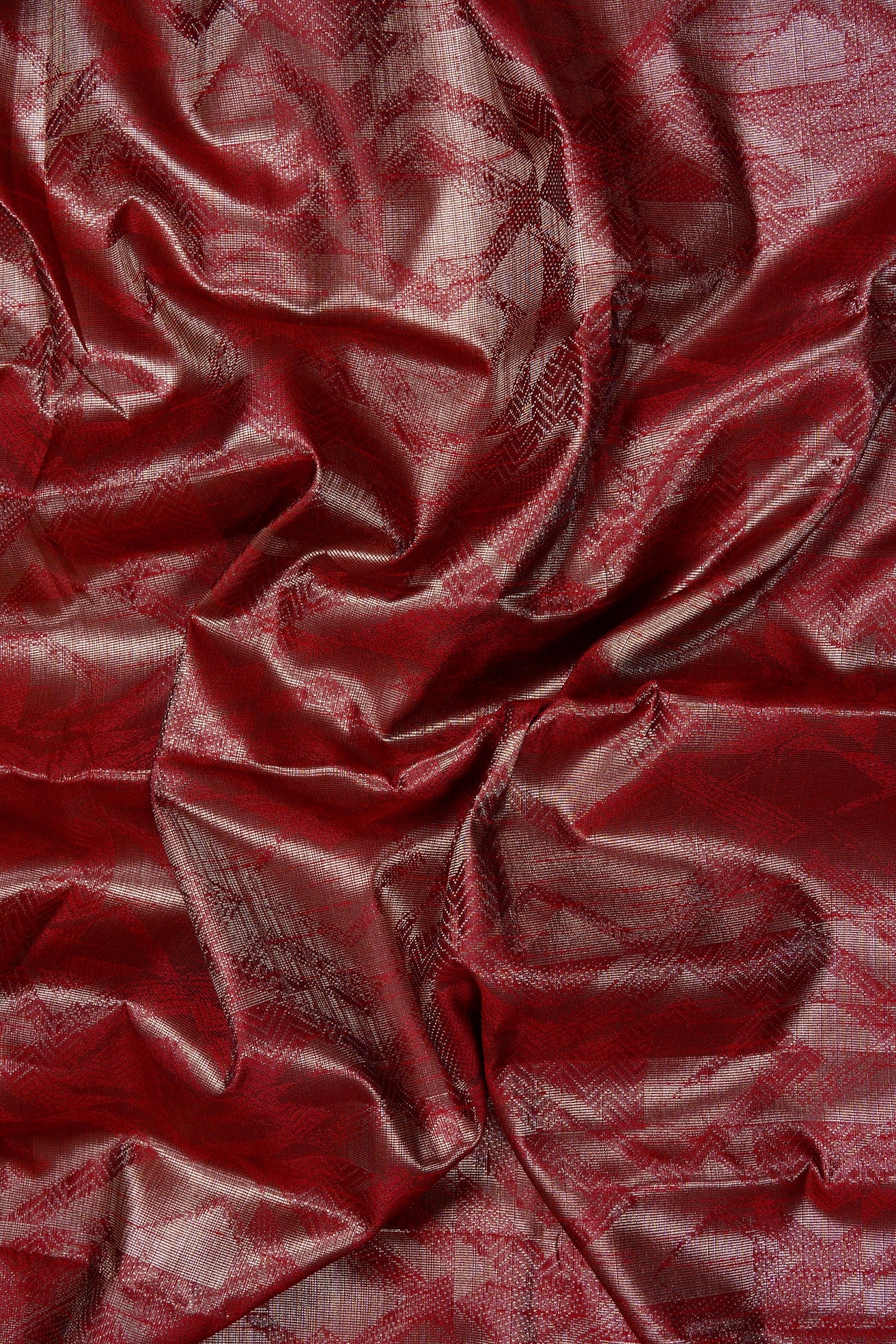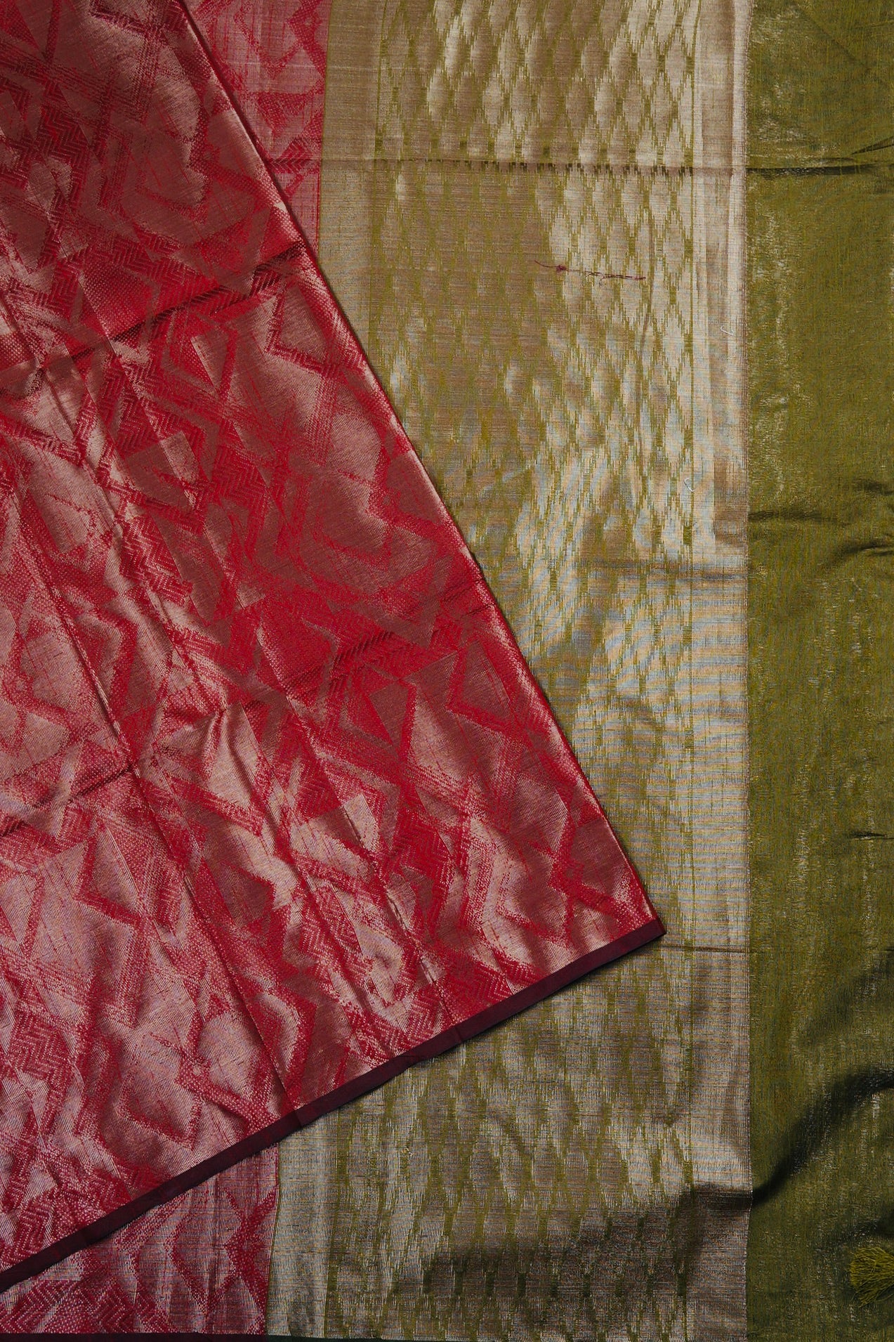 A red semi tussar saree featuring a modern, all-over body of abstract geometric diamond patterns woven in silver zari. The pallu transitions into a bold display of dense diamond-weave panels in shimmering silver on a green base. The look is completed by a green blouse adorned with an intricate honeycomb weave.