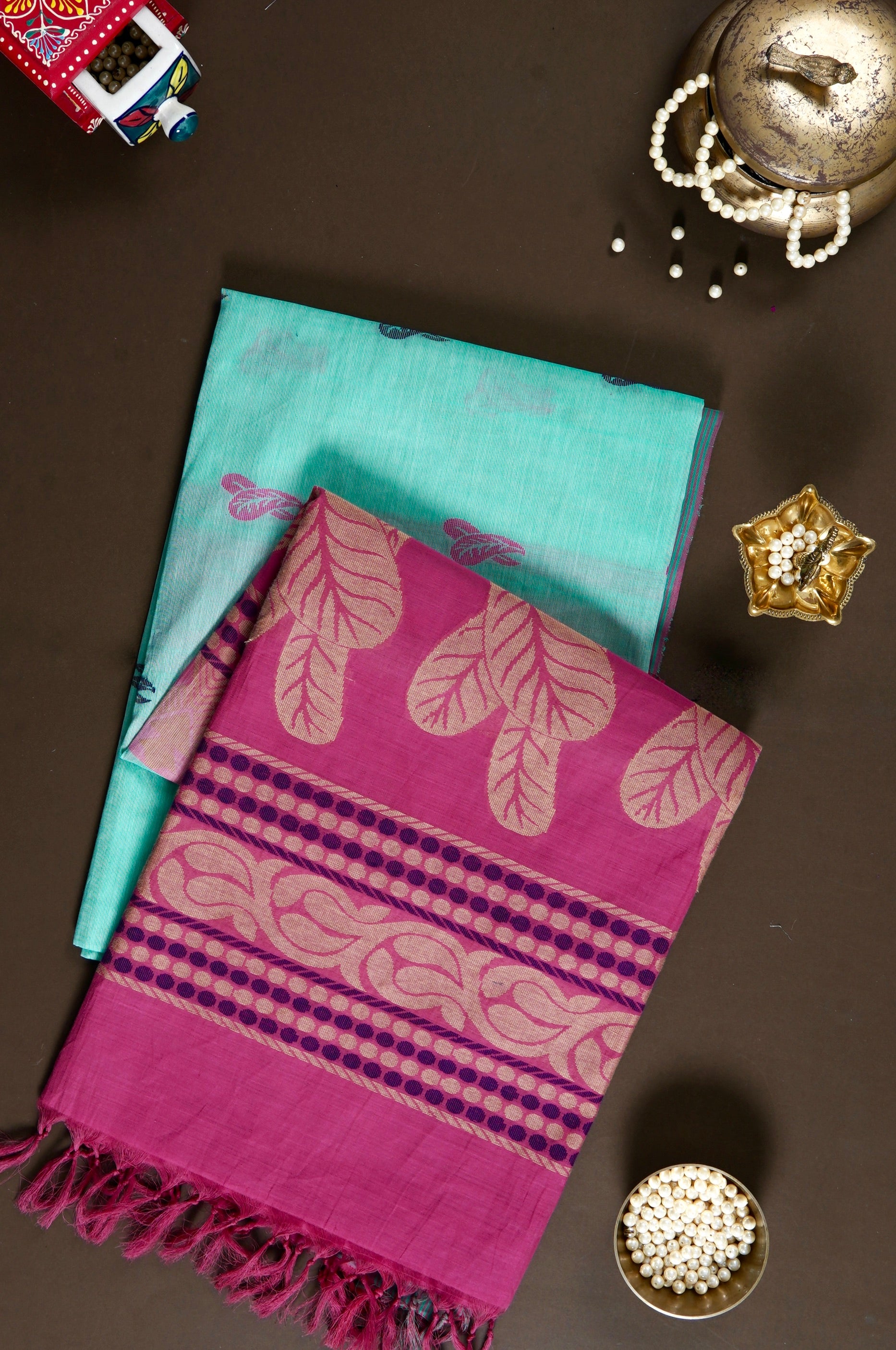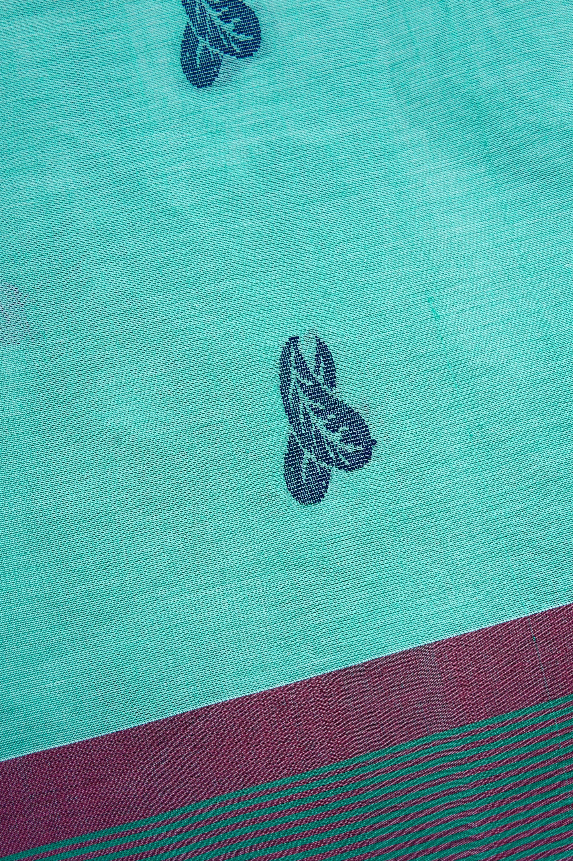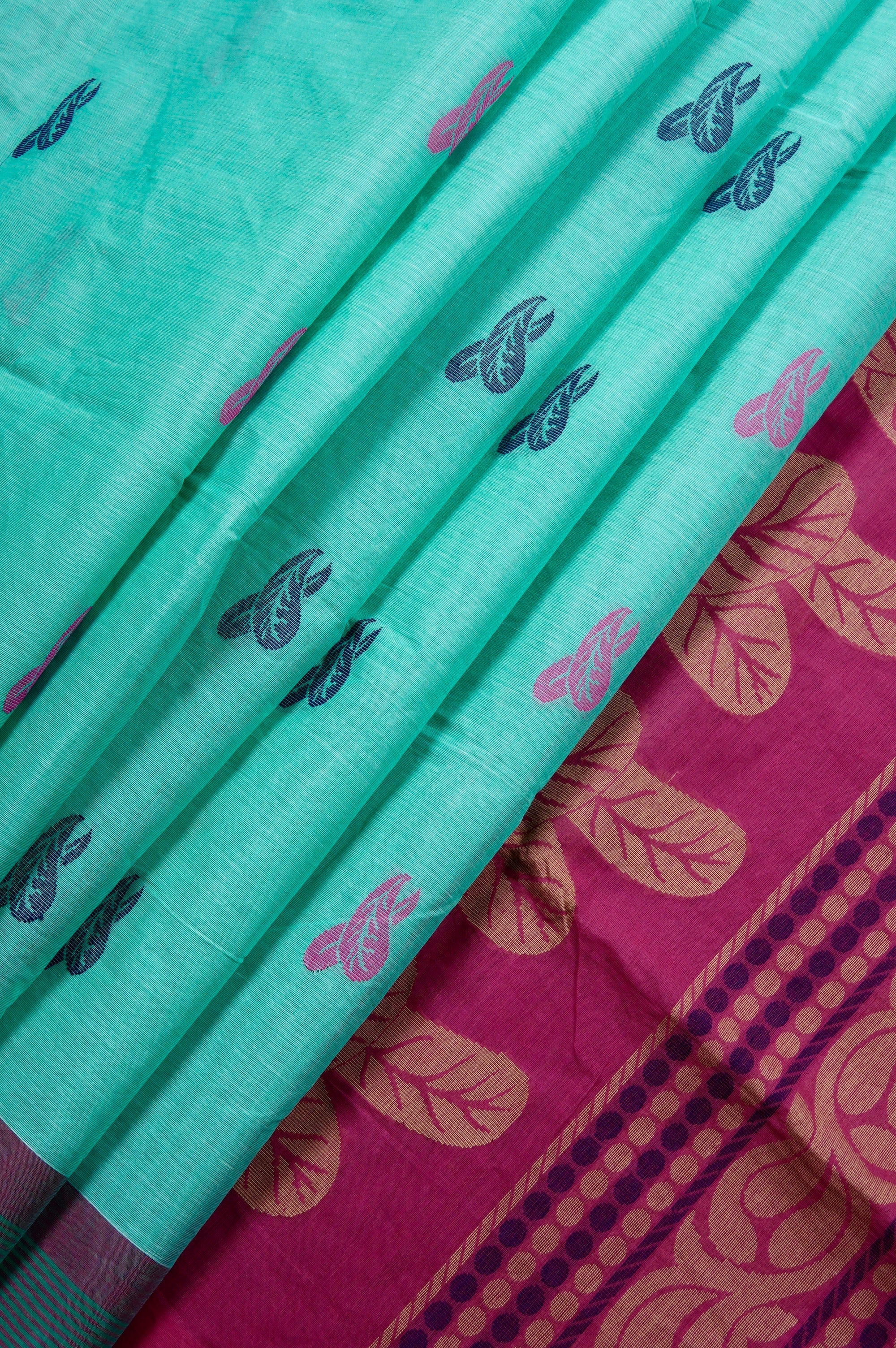 A refreshing and vibrant cotton saree, featuring a bright turquoise body beautifully scattered with dual-toned leaf motifs. The saree is elegantly framed by a minimal, sleek border in deep red and green. The pallu is detailed with intertwined leaves and intricate vertical bands of Kodi and coin bhuttas in ochre and dark indigo. This lightweight saree effortlessly combines everyday comfort with a bold, contrasting color palette.