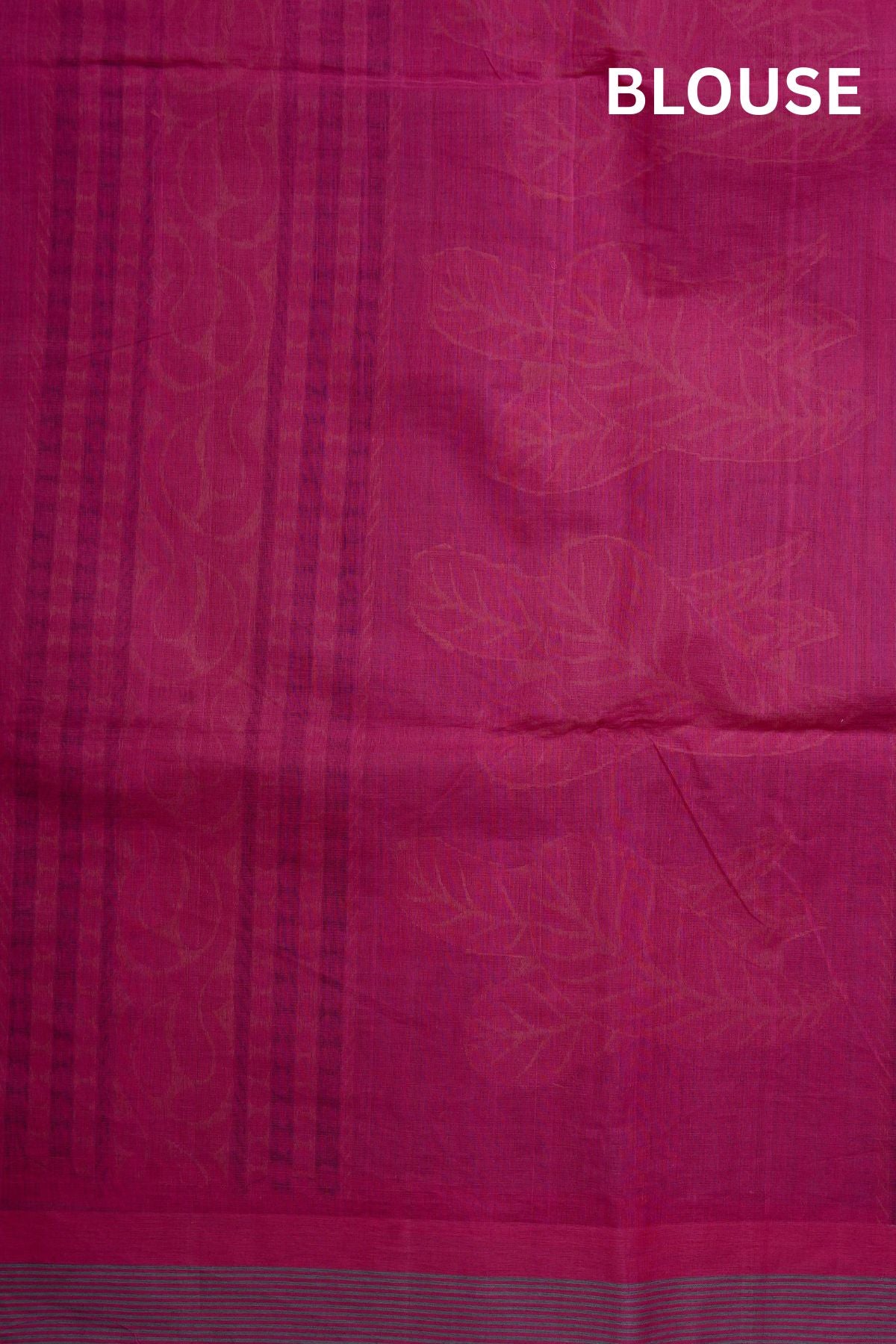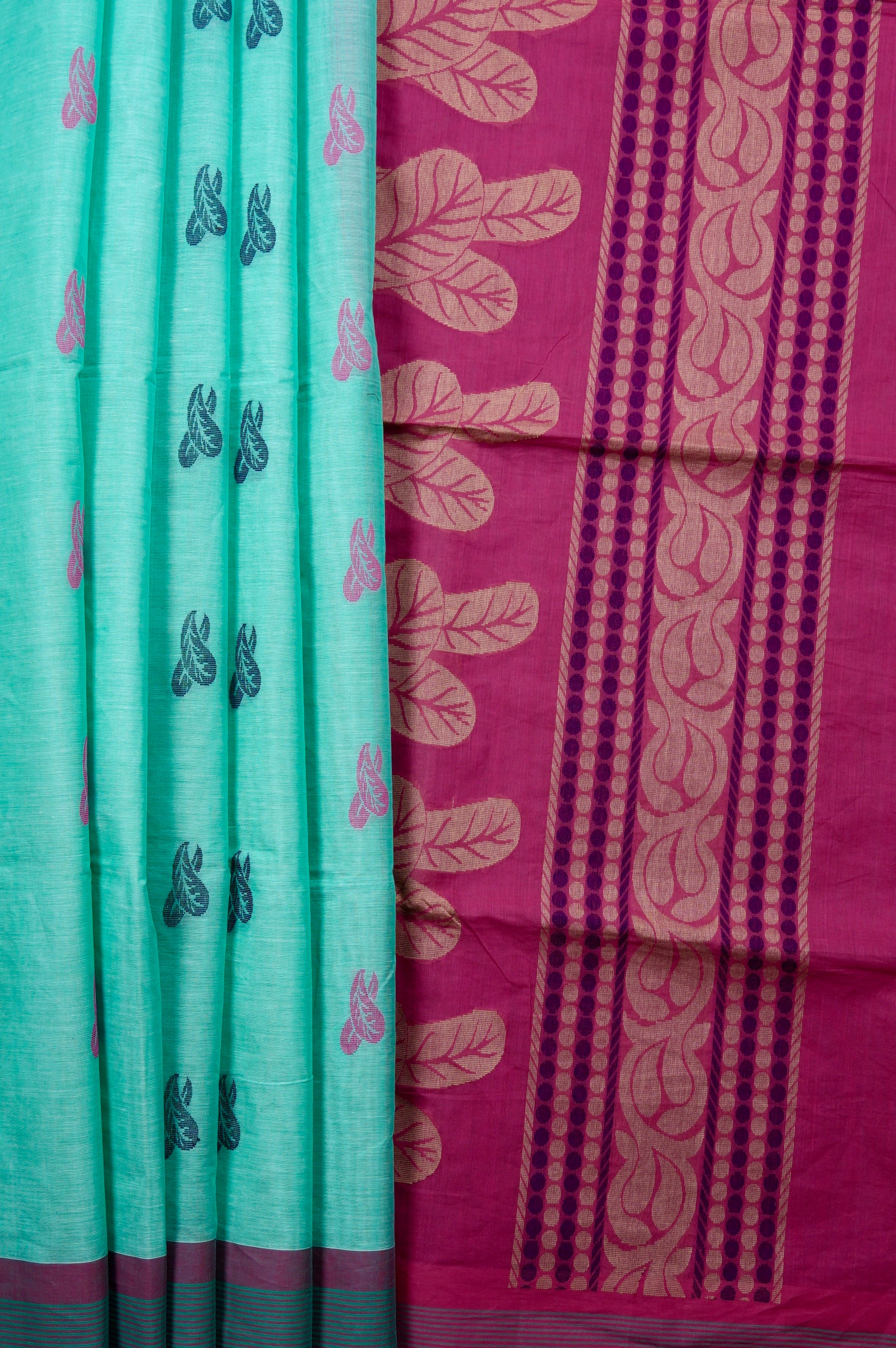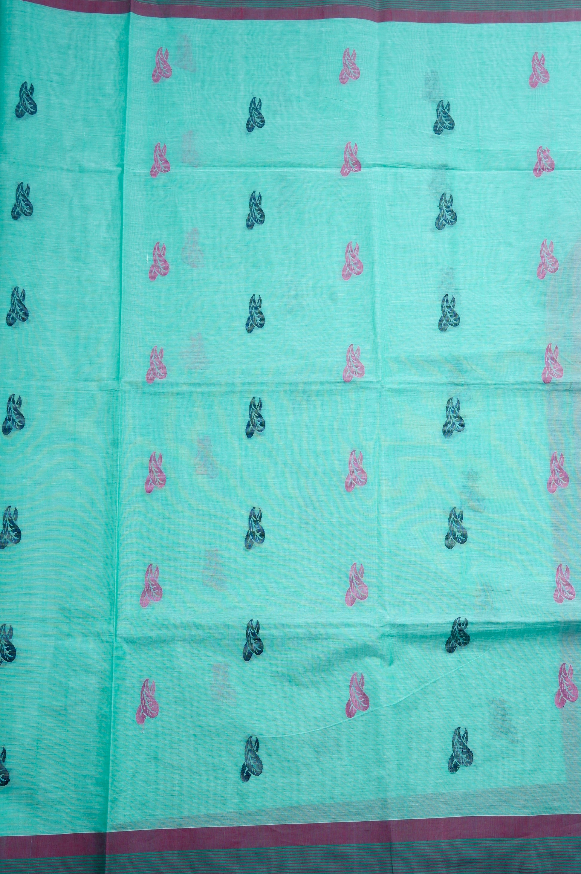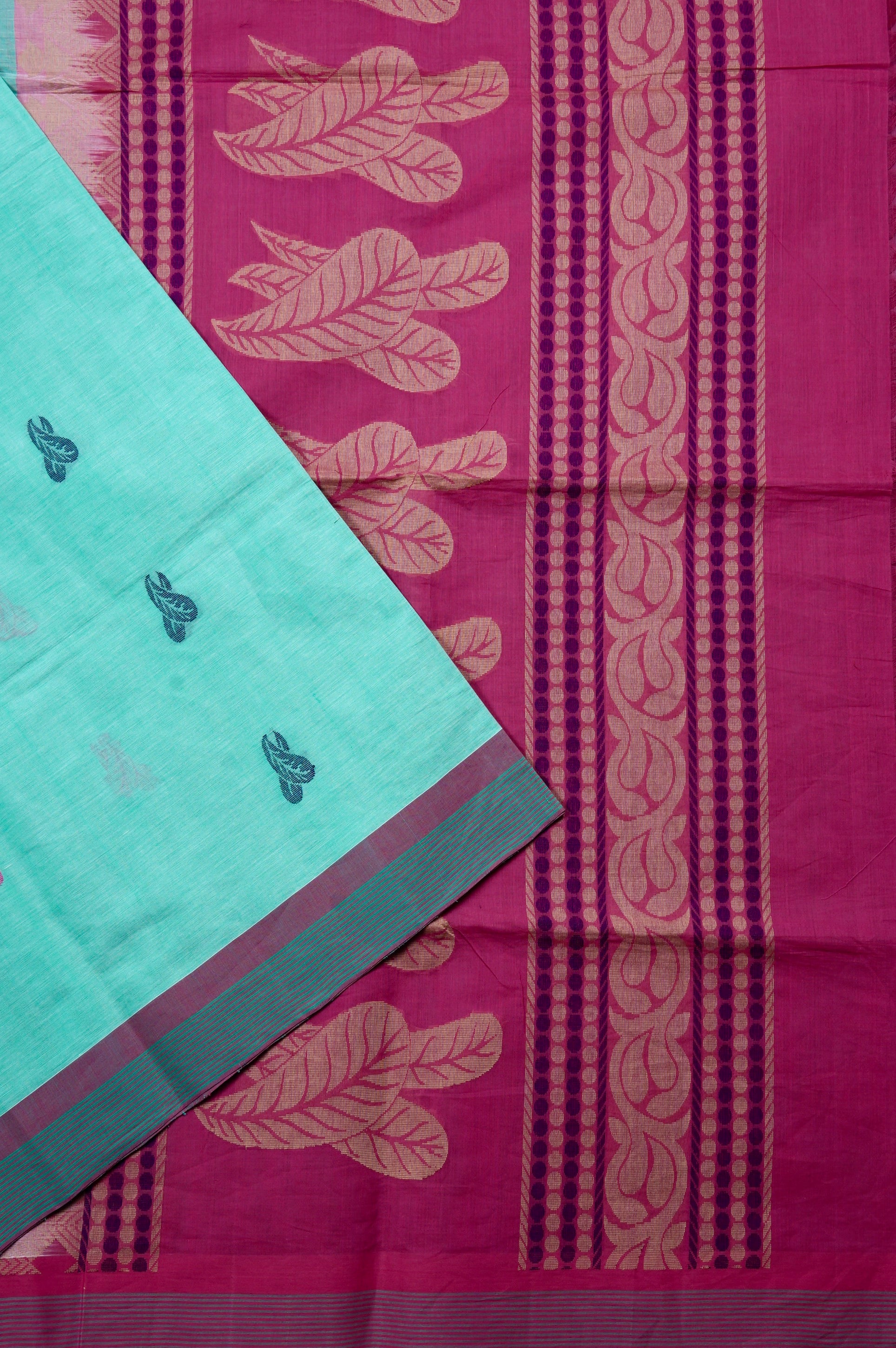 A refreshing and vibrant cotton saree, featuring a bright turquoise body beautifully scattered with dual-toned leaf motifs. The saree is elegantly framed by a minimal, sleek border in deep red and green. The pallu is detailed with intertwined leaves and intricate vertical bands of Kodi and coin bhuttas in ochre and dark indigo. This lightweight saree effortlessly combines everyday comfort with a bold, contrasting color palette.